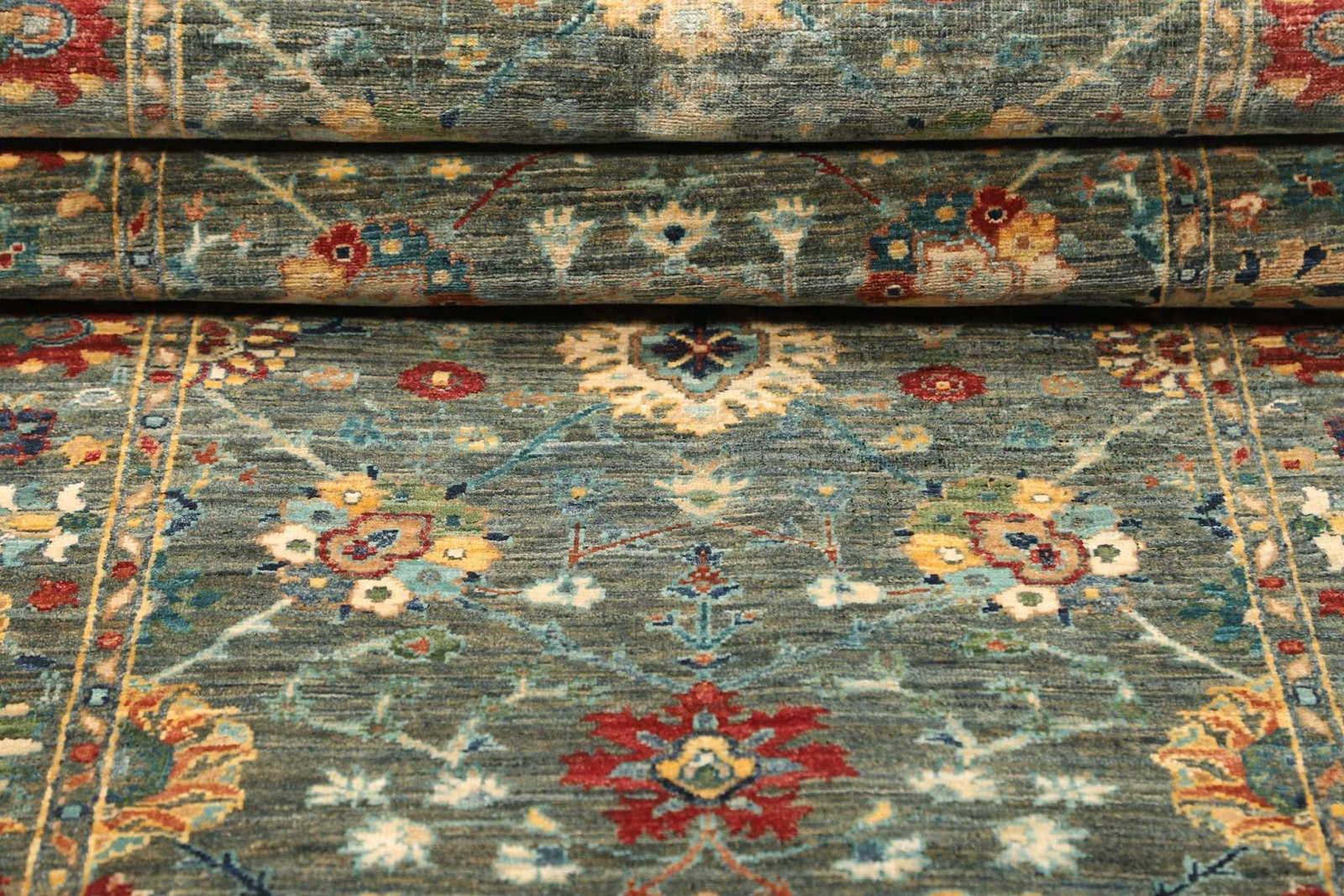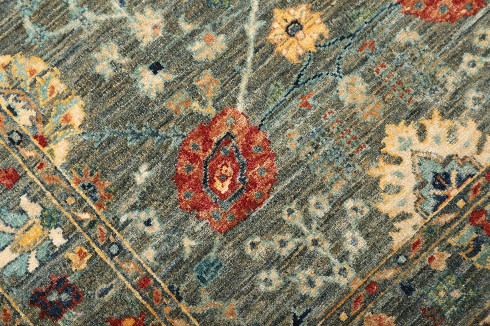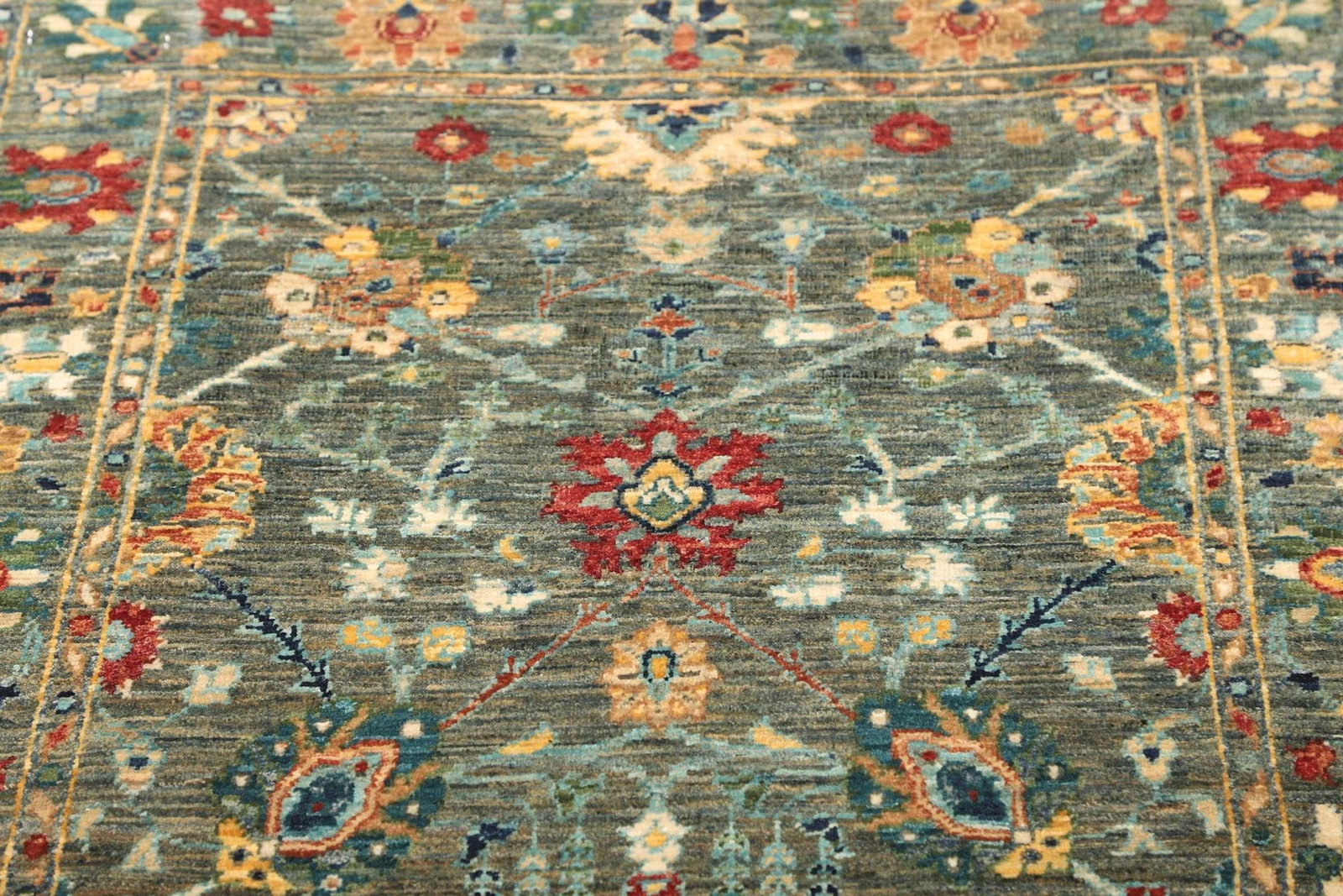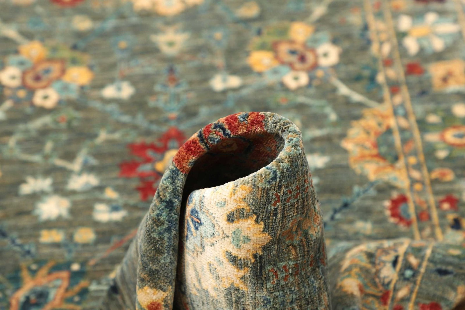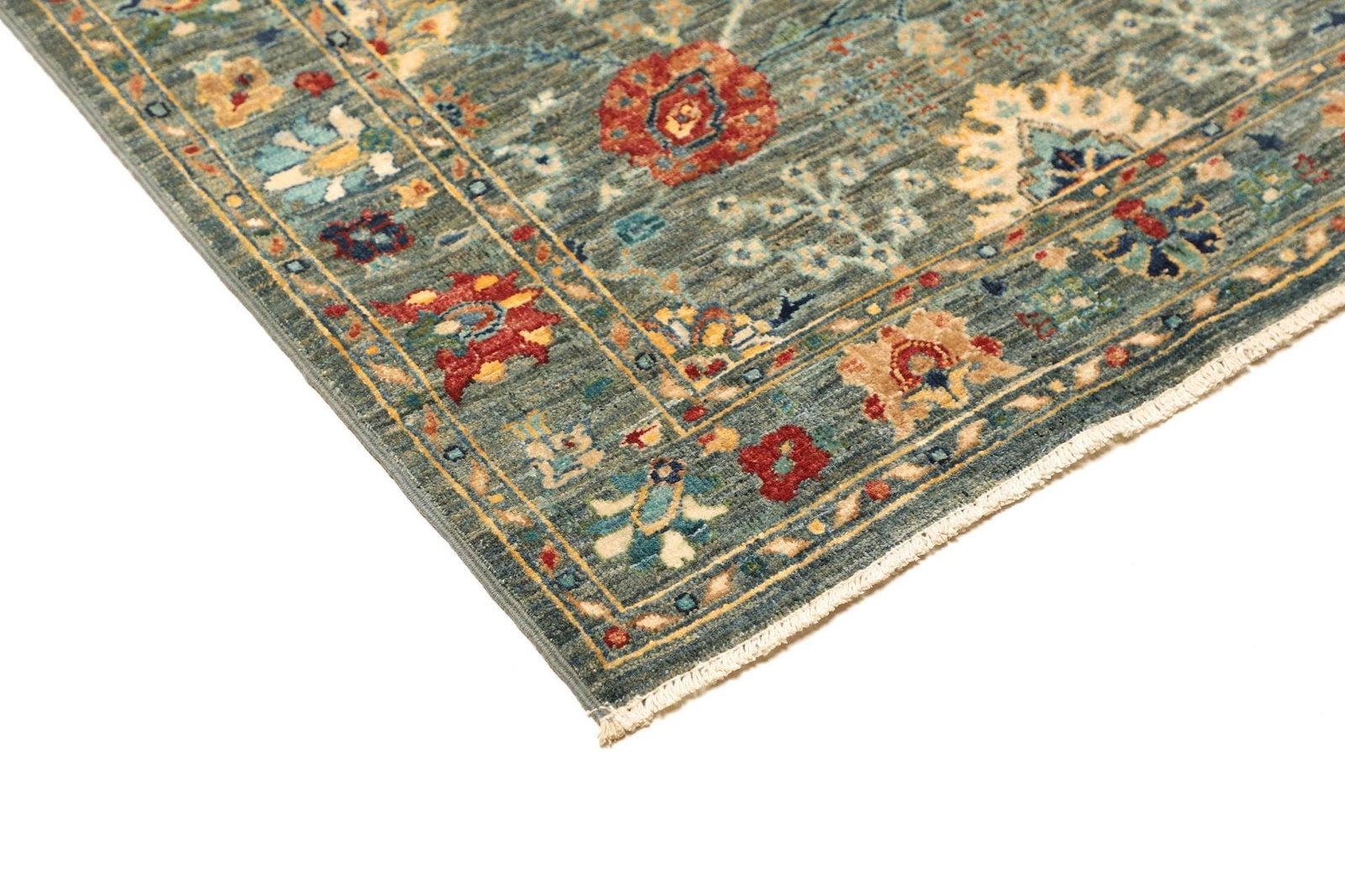 Der Teppich ist aus reiner Schurwolle gefertigt, einem Material, das für seine Robustheit und Langlebigkeit bekannt ist. Schurwolle hat schmutzabweisende Eigenschaften und sorgt gleichzeitig für eine angenehme, weiche Oberfläche. Die handgeknüpfte Technik garantiert eine hohe Knotendichte, die zum Gesamtbild des Teppichs beiträgt. Diese Knotendichte sorgt nicht nur für eine besondere Langlebigkeit, sondern auch für die Feuchtigkeit und Temperaturregulierung im Raum. Die lebendige Struktur der Wolle verleiht dem Teppich zudem eine elegante Ausstrahlung und sorgt für eine harmonische Wärme im Ambiente.