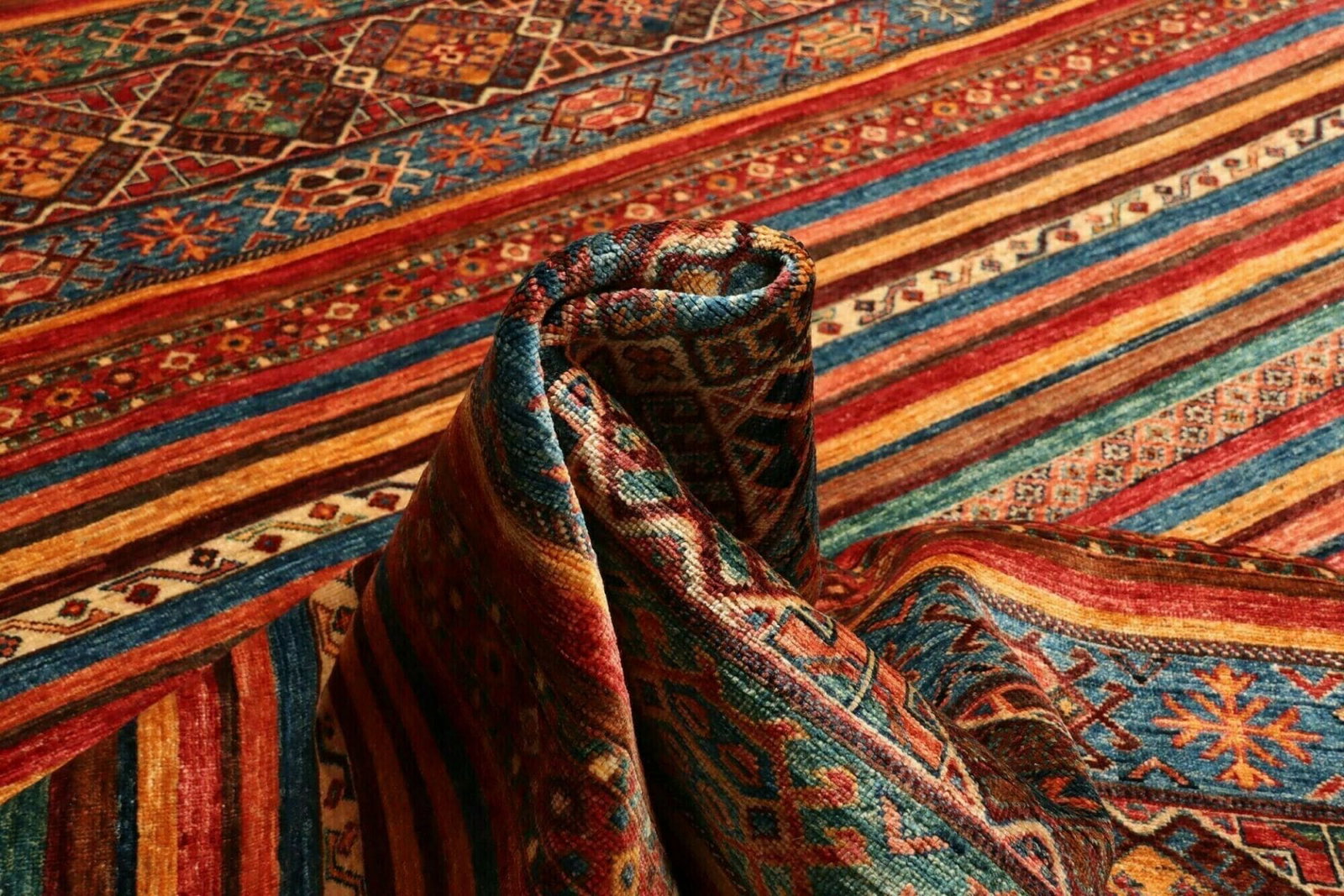 Farben spielen ebenfalls eine wesentliche Rolle im Design, und die geschickte Verwendung von Naturfarben sorgt dafür, dass der Teppich sowohl in modernen als auch in traditionellen Innenräumen glänzt. Die warmen Erdtöne und lebhaften Akzente machen ihn zu einem Eye-Catcher in jedem Raum.