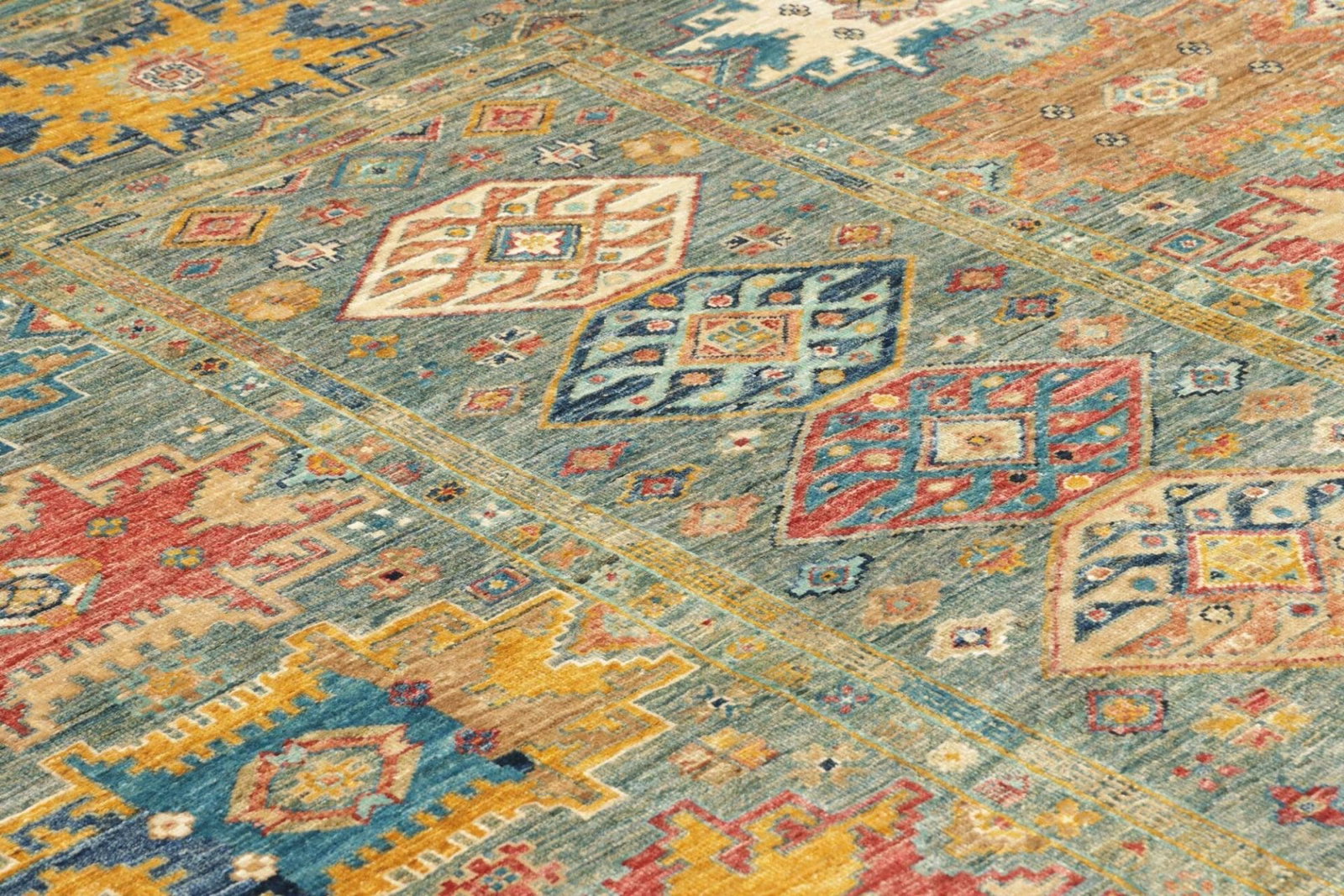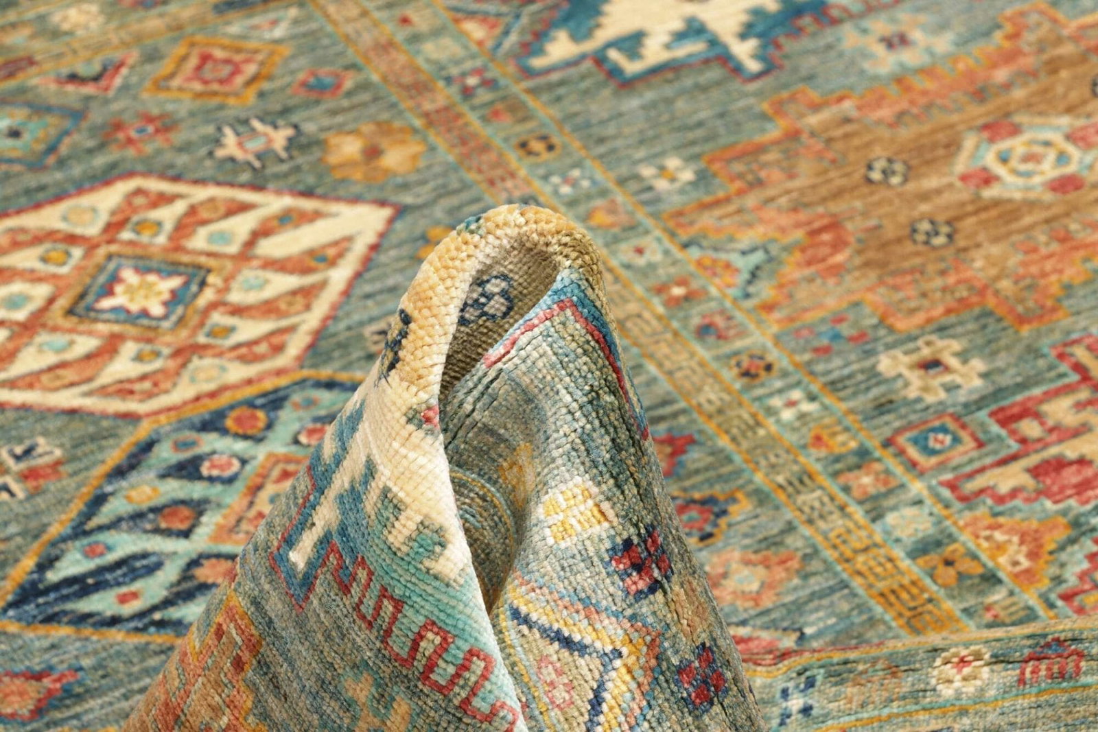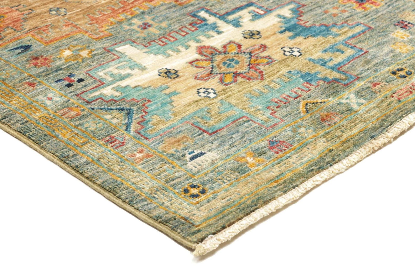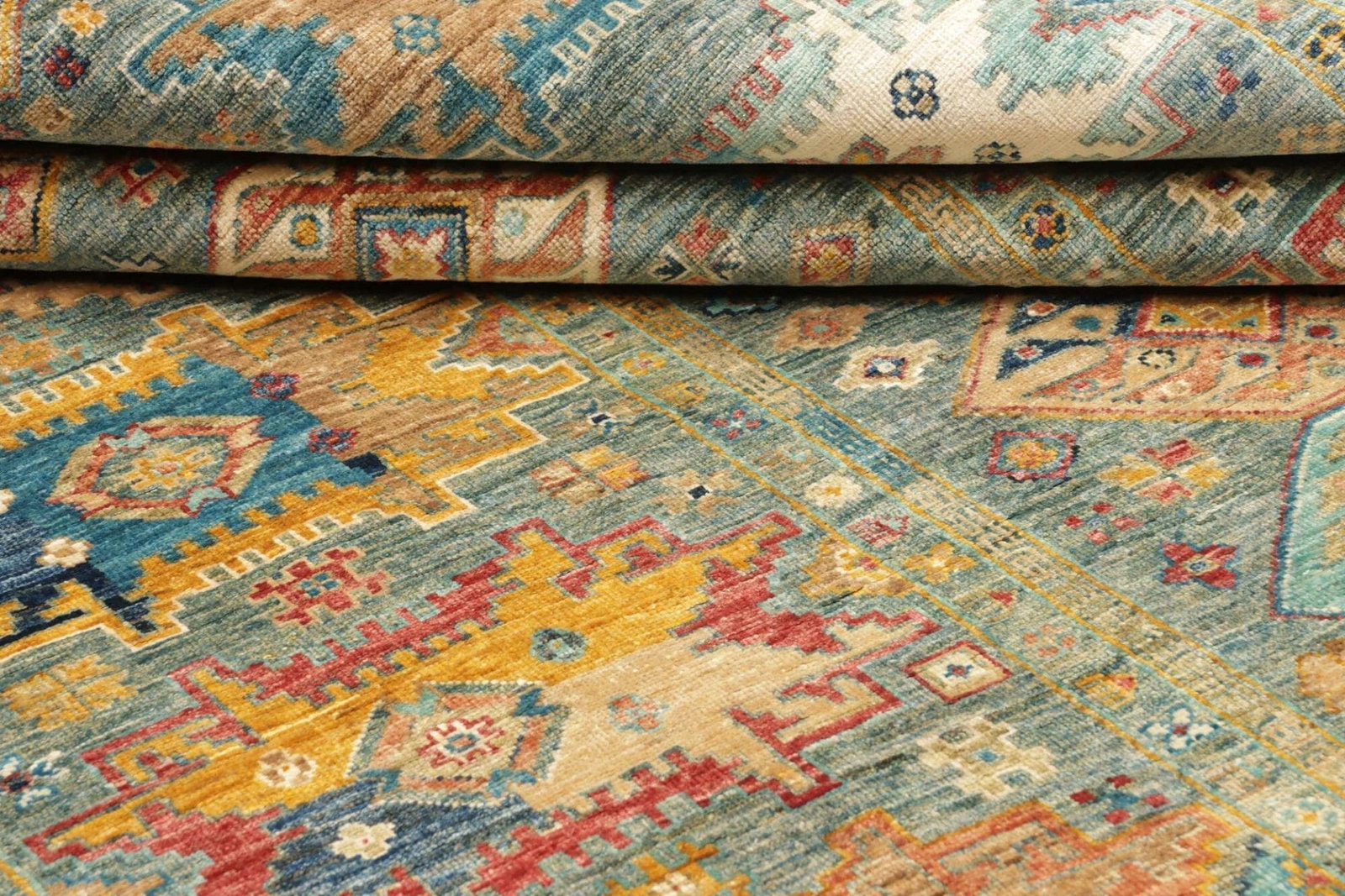 Die Farben des Teppichs sind in der Regel natürliche Farbtöne, die durch die Wolle und spezielle Färbetechniken erzielt werden, die oft Jahrhunderte alt sind. Der Teppich nutzt eine harmonische Palette aus Rot, Blau, Gelb und Erdtönen, wodurch er in jeder Umgebung ein echter Blickfang wird.