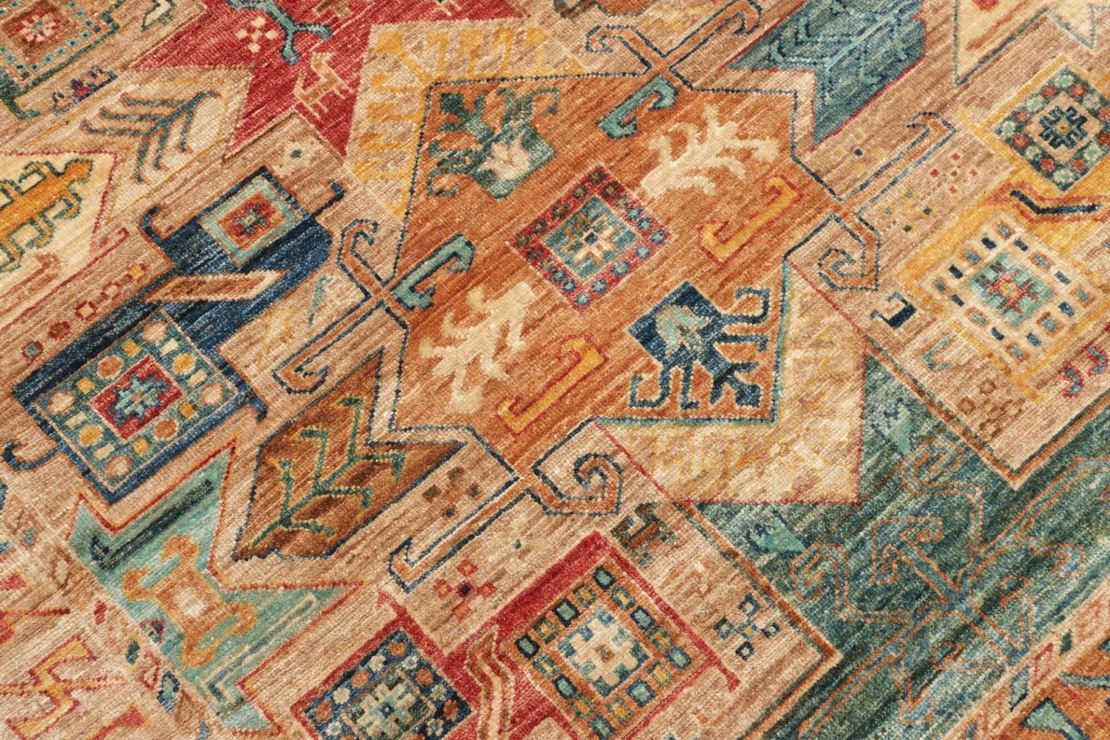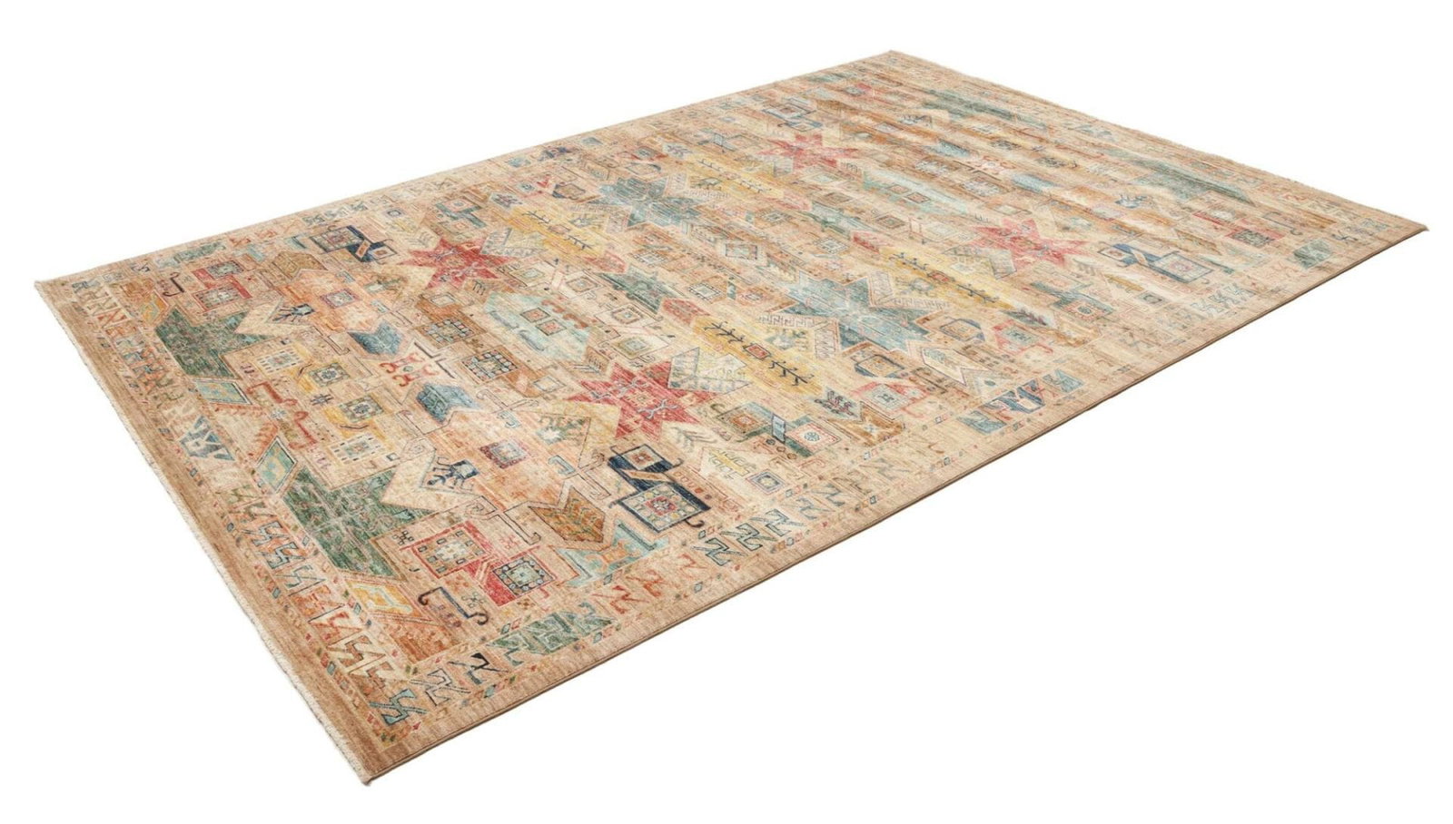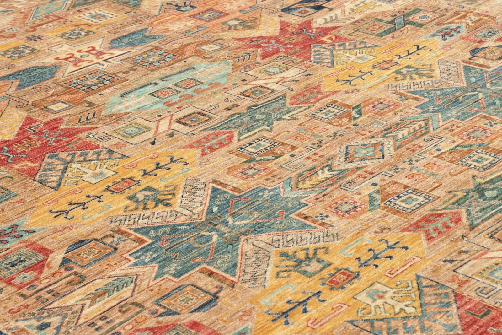 Der Samarkand Tribal Teppich besticht durch ein auffälliges Design, das Elemente traditioneller Teppichkunst mit moderner Ästhetik kombiniert. Die Farben sind sorgfältig gewählt und harmonieren perfekt miteinander, wodurch der Teppich eine warme und einladende Atmosphäre schafft. Die Verwendung von Erdtönen und leuchtenden Akzenten macht dieses Stück besonders vielseitig, sodass es sich problemlos in verschiedene Einrichtungsstile integrieren lässt, von rustikal bis modern.