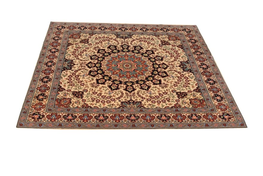 Handgeknüpfter Sarough Teppich | Knotendichte: 160.000 – 200.000 Knoten/m² | Material: Wolle und Baumwolle | Größe: 174×173 cm | Farbe: Weiß/Beige | Ursprung: Iran/Persien | Zustand: Neuzeitlich (0-20 Jahre) | Dicke: ca. 8 mm | Gewicht: ca. 5 kg