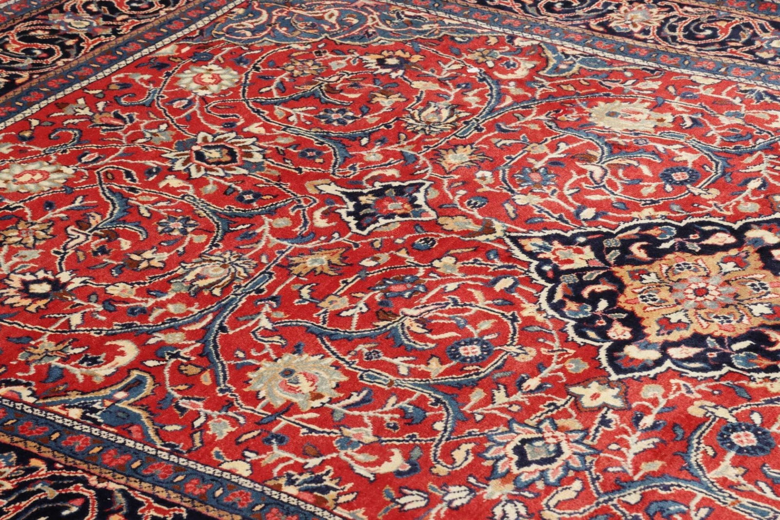 Der Sarough Teppich besteht aus 100% Schurwolle, einem Material, das nicht nur für seine Weichheit und Langlebigkeit bekannt ist, sondern auch für seine hervorragenden Eigenschaften hinsichtlich Isolierung und Feuchtigkeitsaufnahme. Schurwolle ist ein Naturprodukt, das sich durch seine Robustheit auszeichnet, was den Teppich ideal für verschiedene Wohnräume macht. Die handgeknüpfte Technik sorgt für eine hohe Knotendichte, die nicht nur für eine beeindruckende Langlebigkeit, sondern auch für die Detailgenauigkeit der Muster sorgt.