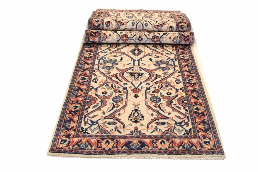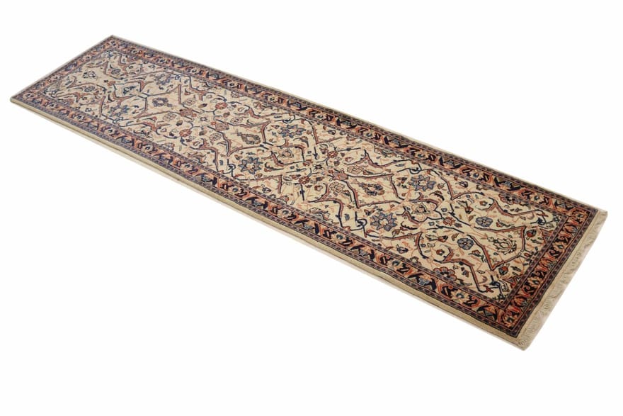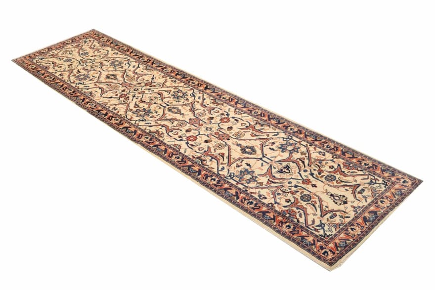 Traditioneller Sarough Teppich | Knotendichte: 200.000 – 250.000 Knoten/m² | Material: Handgesponnene Wolle und Baumwollkette | Größe: 324×83 cm | Farbe: Weiß/Beige | Zustand: Neu | Ursprung: Iran/Persien | Dicke: ca. 10 mm | Gewicht: ca. 7 kg | Form: Läufer