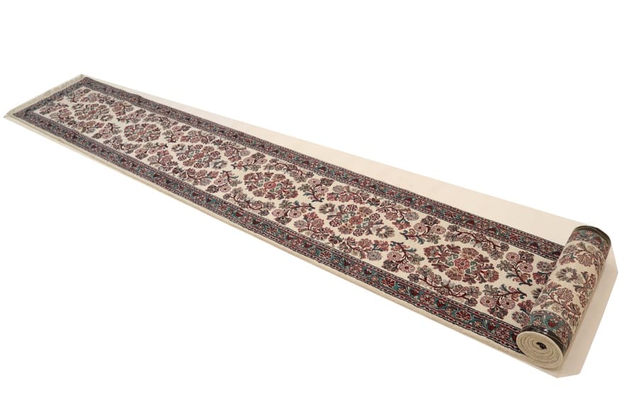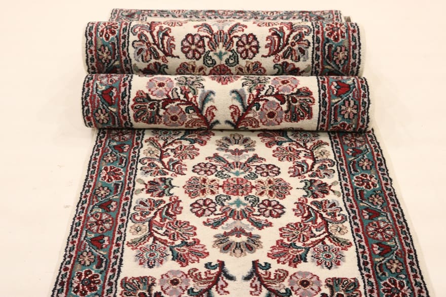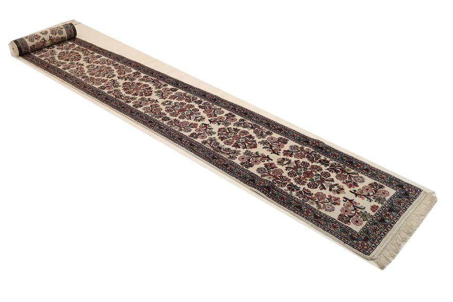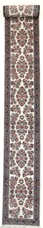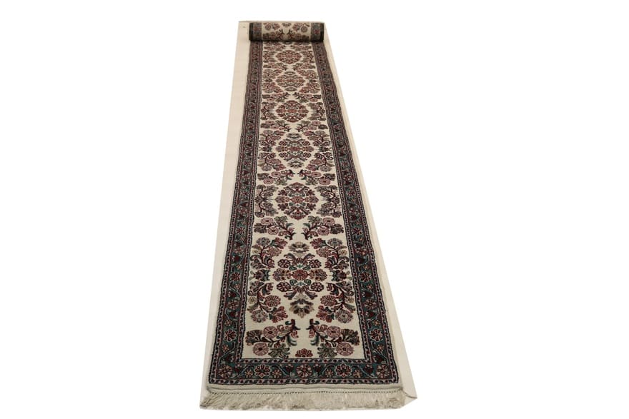 Läufer Teppich Sarough | Knotendichte: 160.000 – 200.000 Knoten/m² | Material: Wolle (Flor), Baumwolle (Kette) | Größe: 658×77 cm | Farbe: Weiß/Beige | In neuzeitlichem Zustand (0-20 Jahre) | Herkunft: Indien | Gewicht: ca. 12 kg | Dicke: ca. 8 mm | Handgeknüpft
