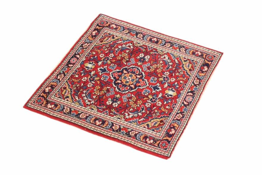 Handgeknüpfter Sarough-Teppich | Knotendichte: 200.000 – 250.000 Knoten/m² | Material: Handgesponnene Wolle und Baumwollkette | Größe: 67×75 cm | Farbe: Rot/Orange | Zustand: Neu | Ursprung: Iran/Persien | Dicke: ca. 8 mm | Gewicht: ca. 2 kg | Form: Quadratisch