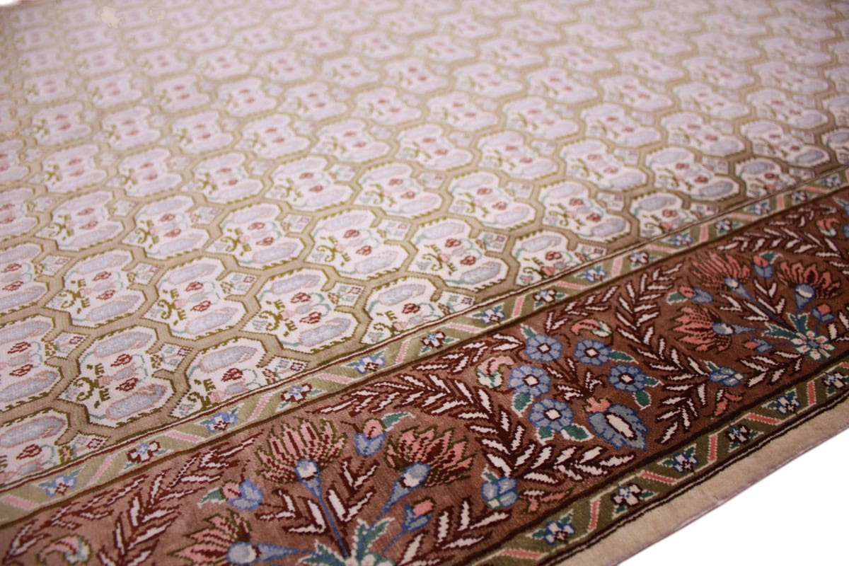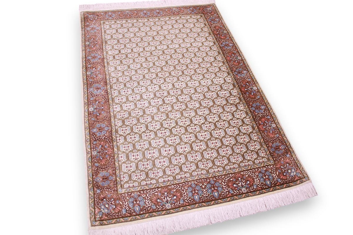 • Seidenteppich Ghom | Knotendichte: Sehr hoch, fast 1000000 Knoten pro Quadratmeter | Material: Hochwertige Seide | Größe: 122×81 cm | In ausgezeichnetem Zustand | Ursprung: Iran | Muster: Harmonische Farbpaletten mit Naturfarben | Grundfarbe: Elfenbein mit roten und türkisfarbenen Akzenten