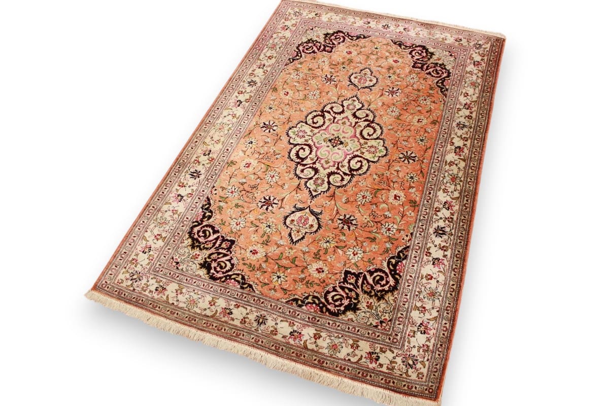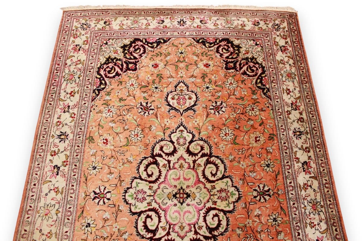 Seiden Teppich Ghom 122×81 cm, harmonische Farben, handgeknüpft