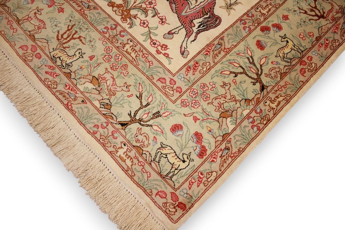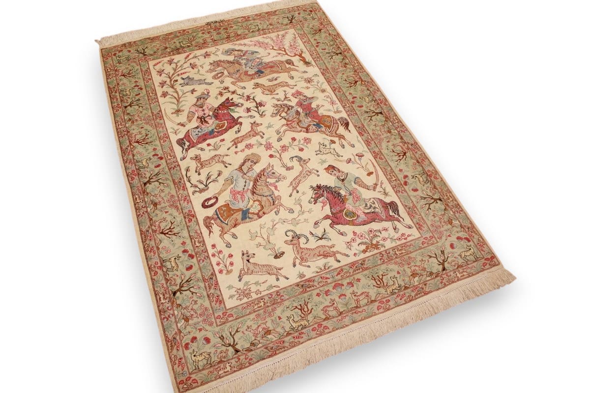 Seidenteppich Ghom | Knotendichte: Sehr hoch | Material: 100% Seide | Größe: 150×102 cm | Zustand: Ausgezeichnet | Ursprung: Iran | Muster: Jagdszene mit harmonischer Farbpalette in Elfenbein, Rot und Naturtönen