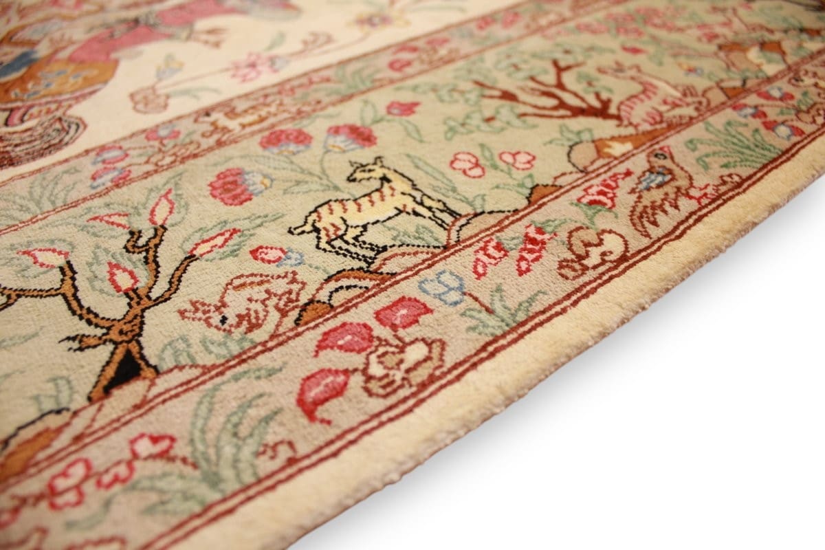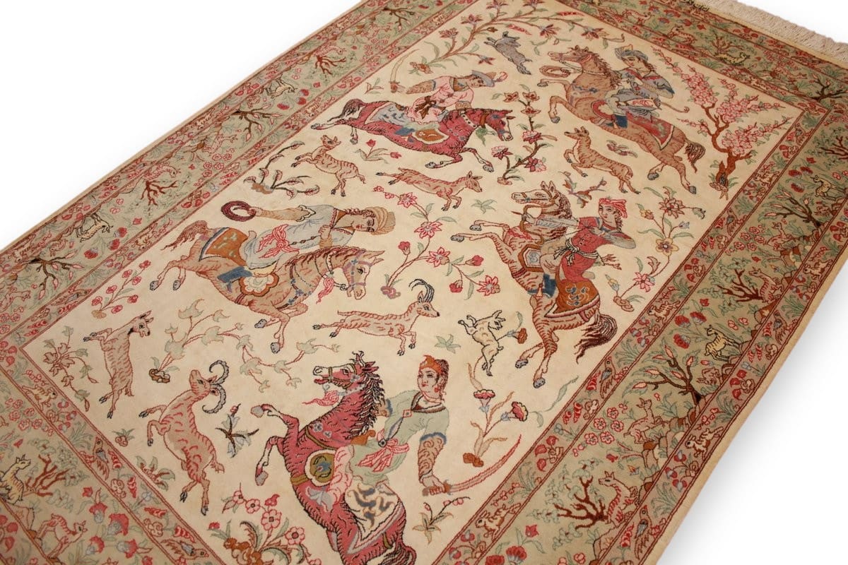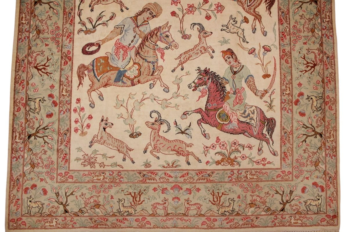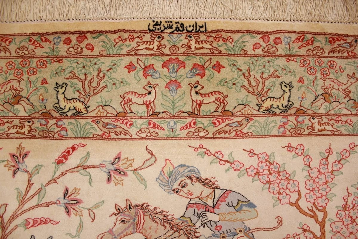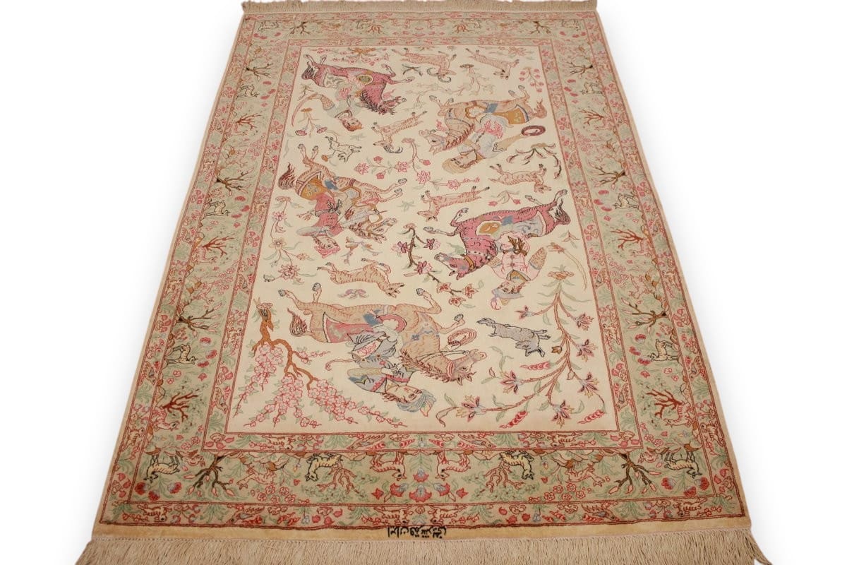 Seidenteppich Ghom Jagdszene Beige handgeknüpft