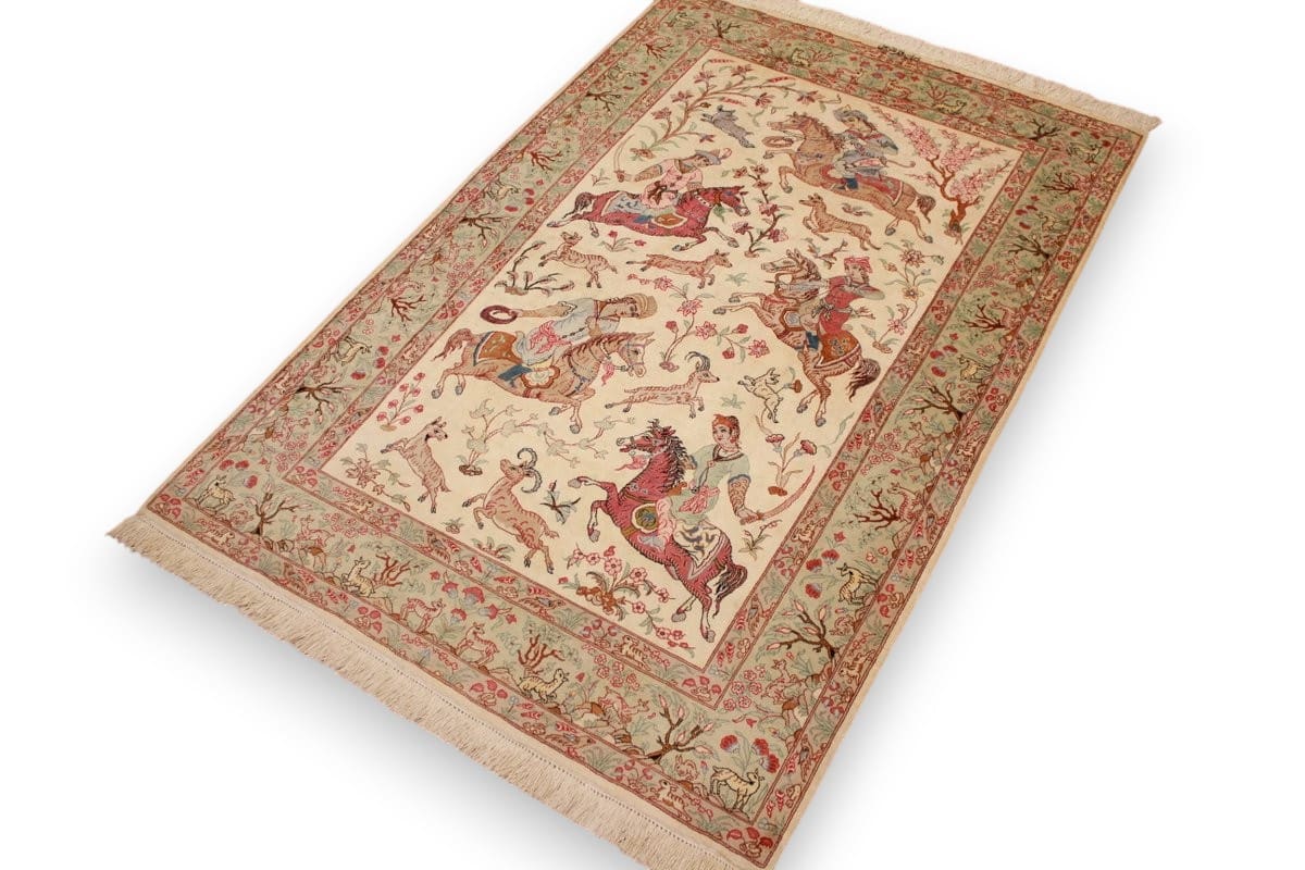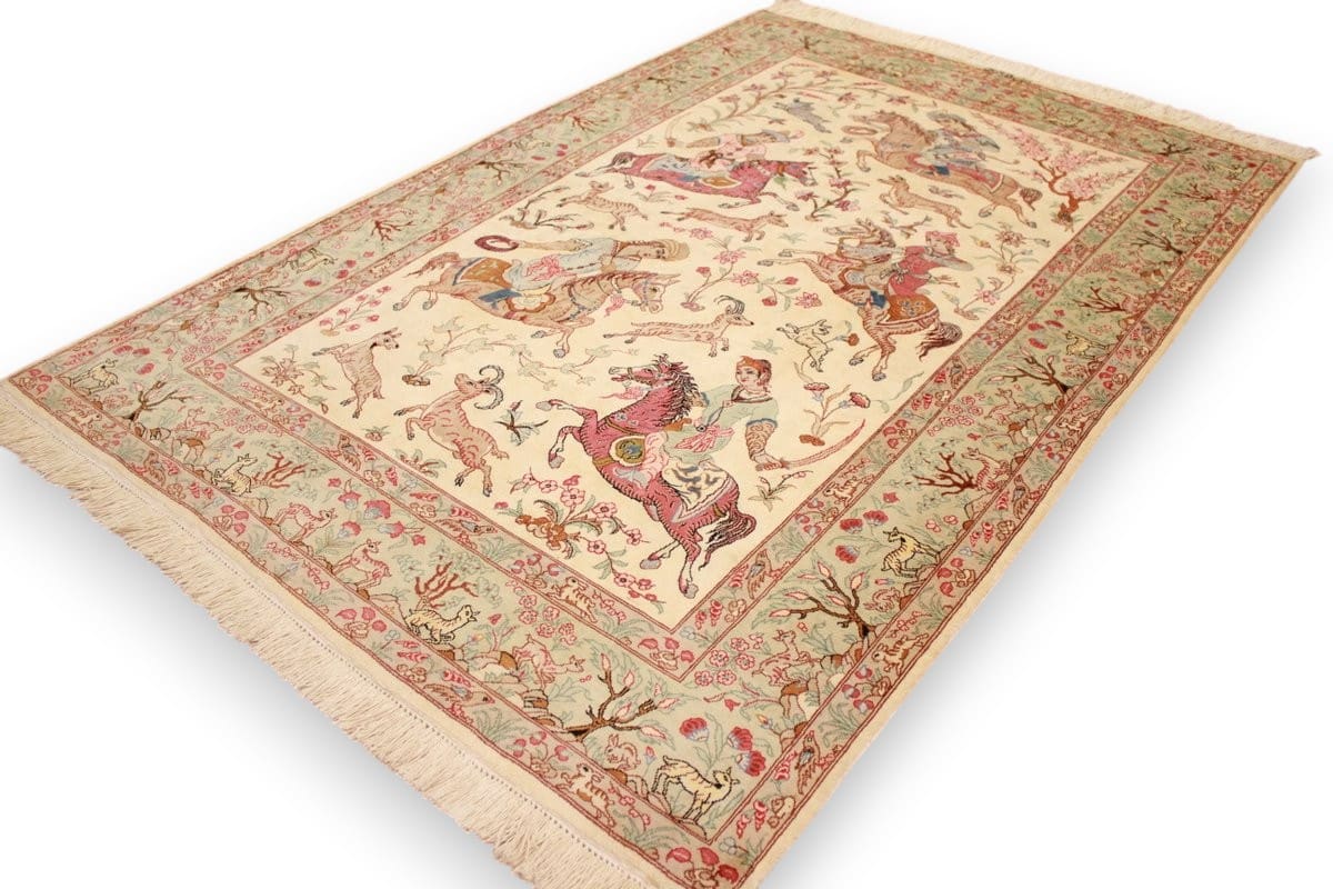 Seidenteppich Ghom 150×102 cm Jagdszene Beige handgeknüpft