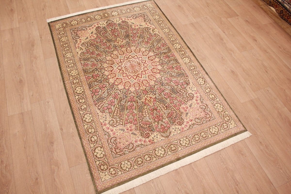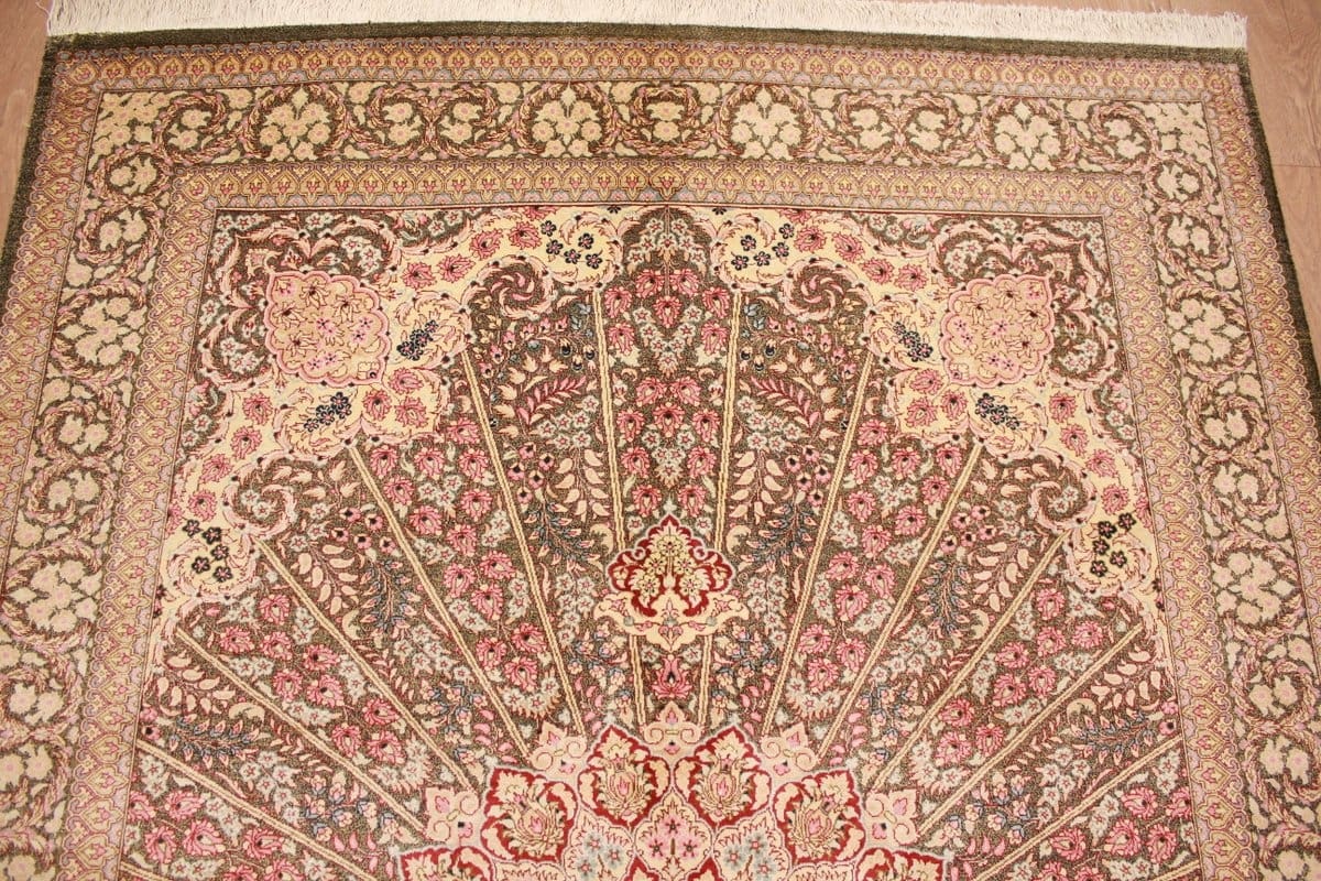| Hochwertiger Seidenteppich Ghom | Knotendichte: Exakte Knüpfung mit hoher Präzision | Material: 100% Seide | Größe: 207×137 cm | Farben: Harmonische Naturtöne in Grün, Elfenbein und Rot | Ursprung: Iran | Zustand: Sehr gut erhalten | Muster: Vielfältige Motive wie Gartenteppiche und Vasenmuster