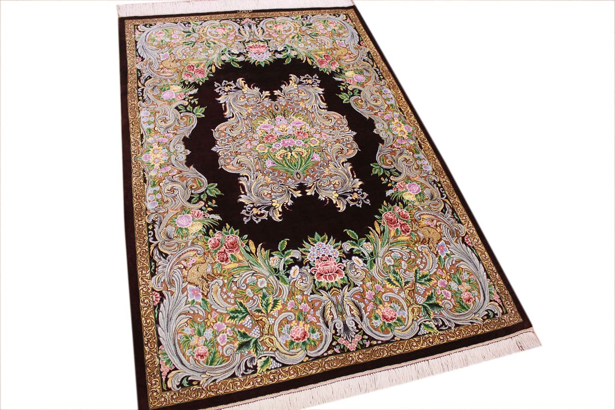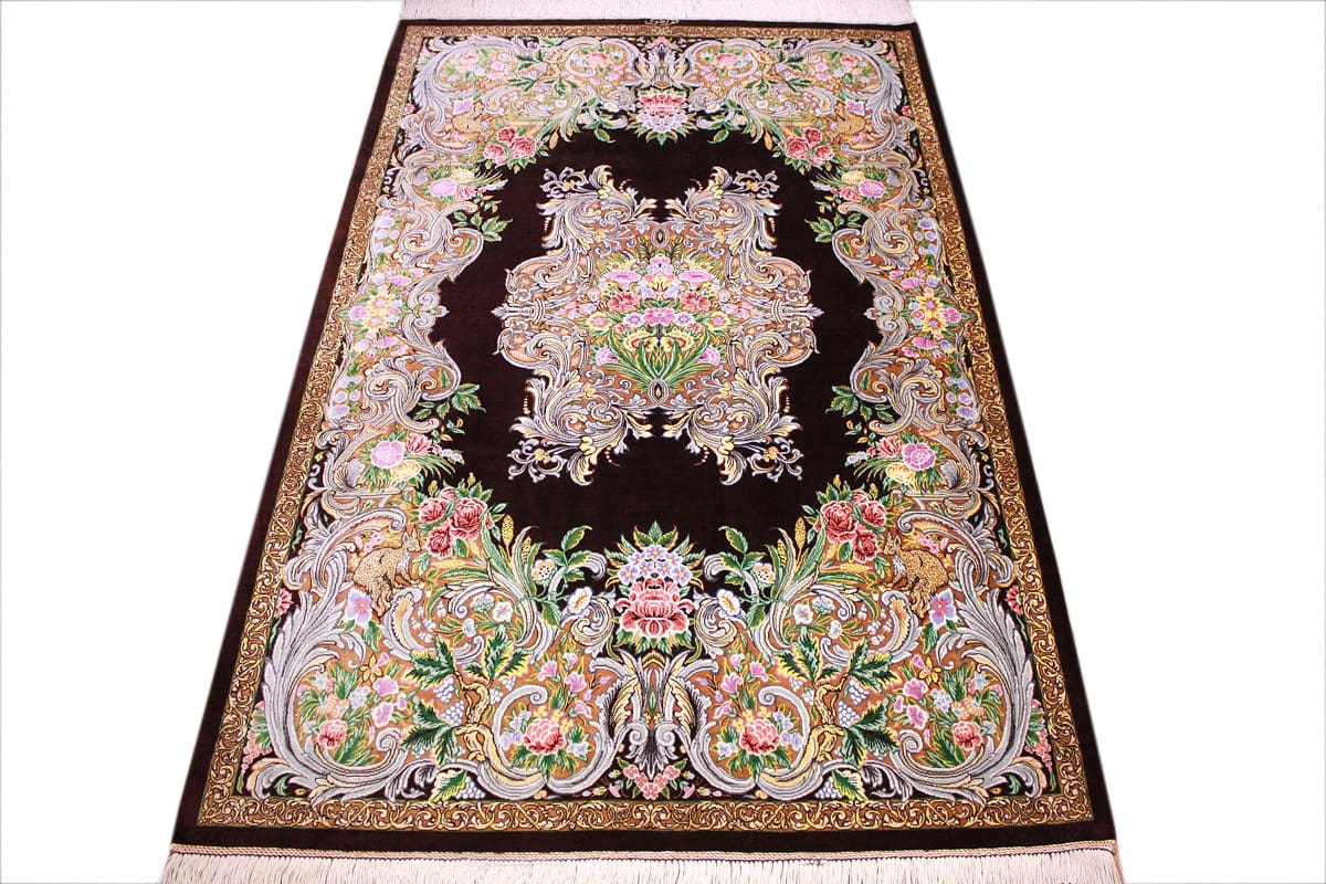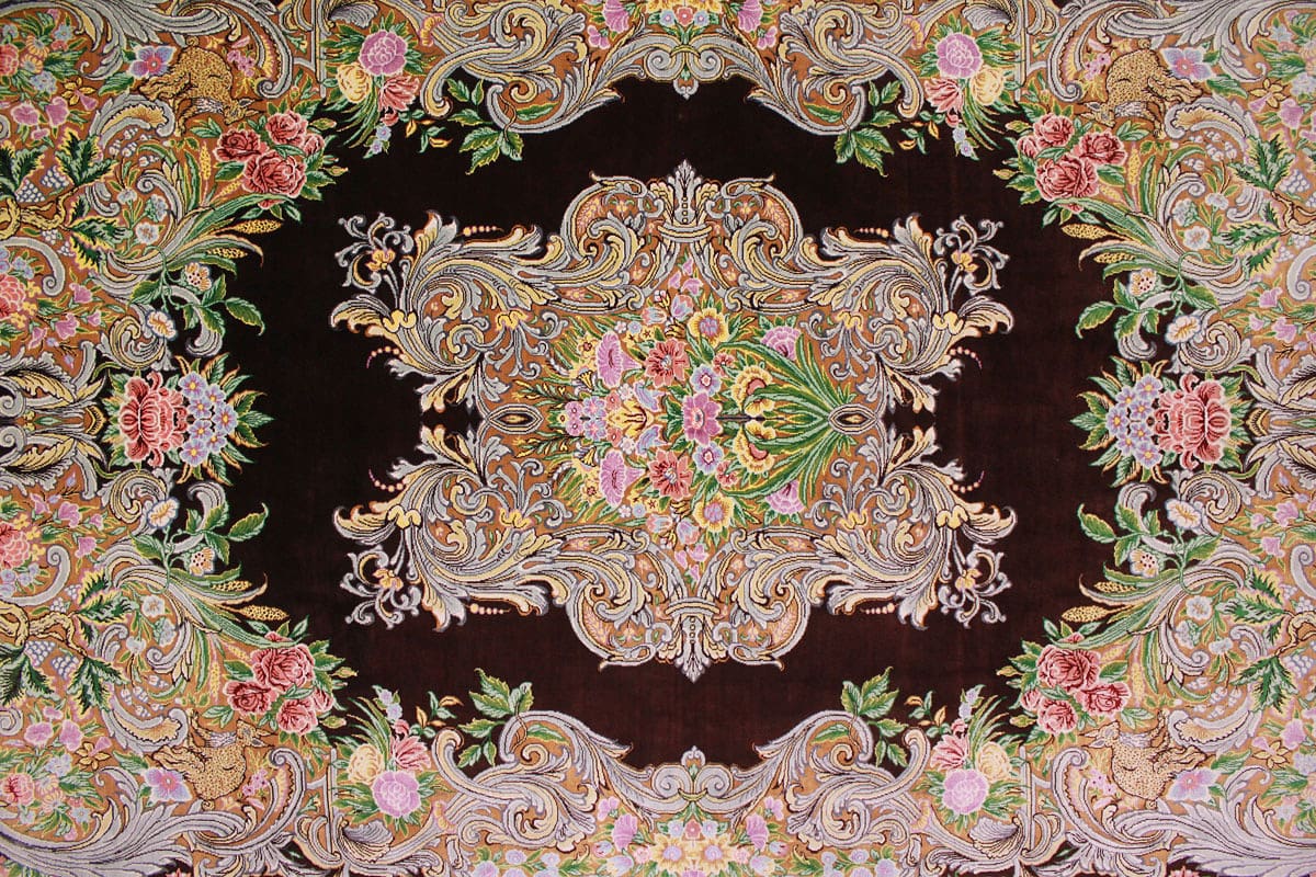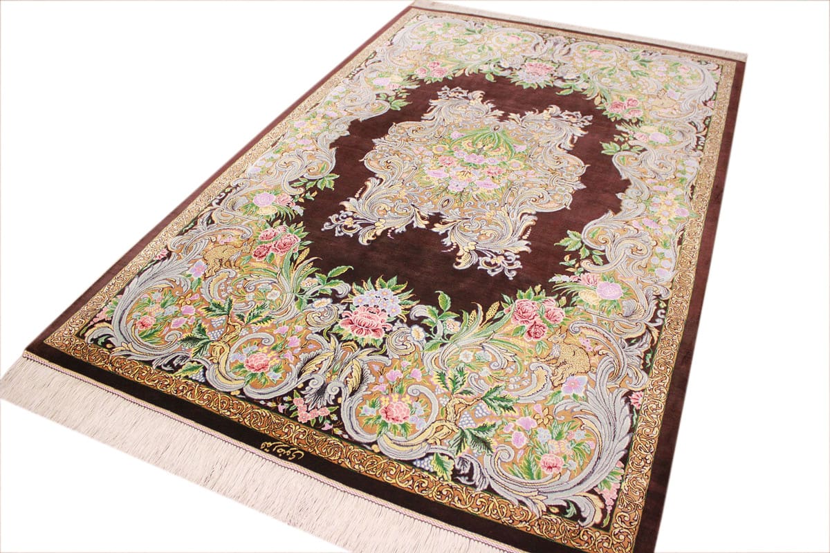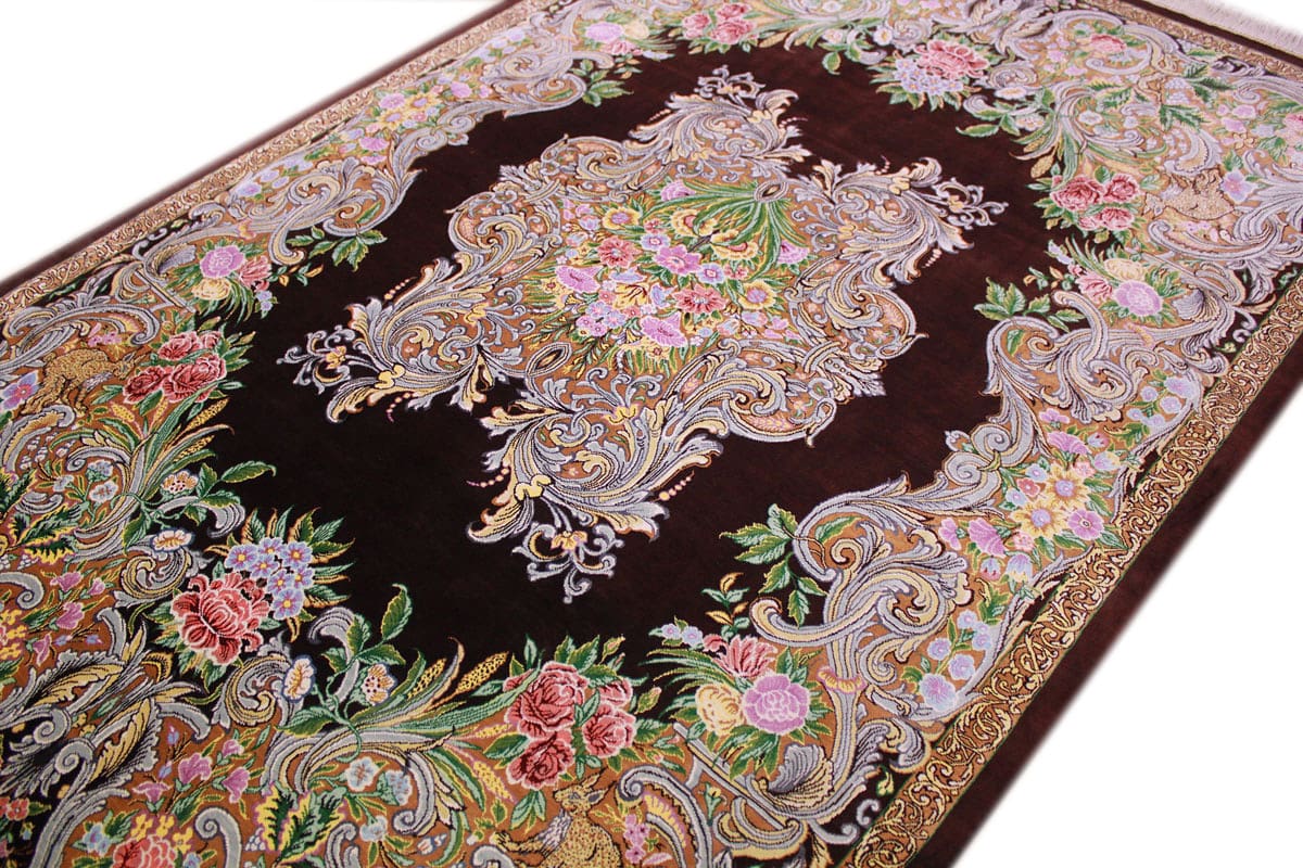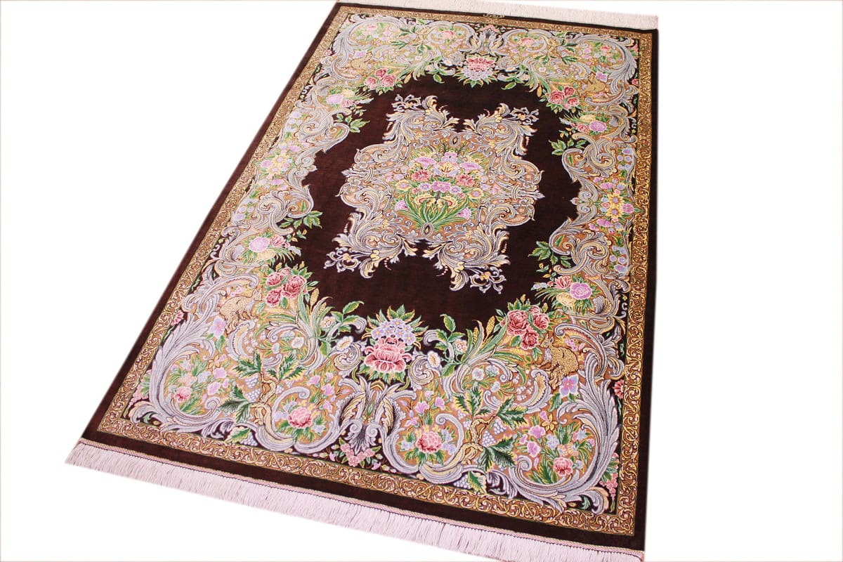 Seidenteppich Ghom Perser 152×99 cm Braun, feine Muster, handgeknüpft