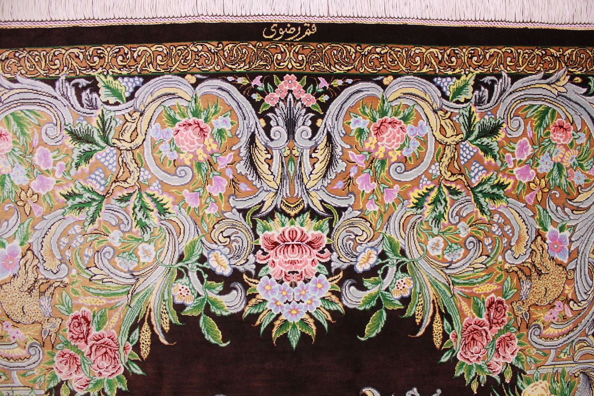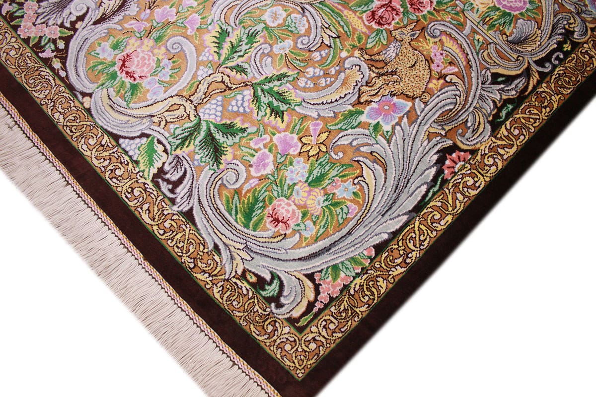 • Seidenteppich Ghom | Knotendichte: Hochwertige Knüpfung | Material: Reine Seide | Größe: 152×99 cm | Ursprung: Iran | Zustand: Sehr gut | Muster: Quadratische Gartenteppiche, Jagdschilderungen, Botteh-Motive, zentrale Medaillons und Vasenmuster