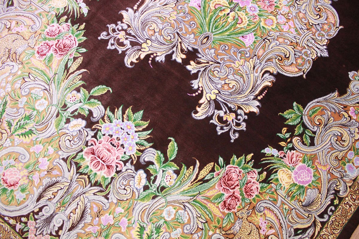 Ghom, die Heimat dieses exquisiten Teppichs, ist eine Stadt in der zentralen Region des Iran. Sie gilt als ein kulturelles Zentrum des schiitischen Islams und hat eine lange Tradition in der Teppichherstellung. Die Teppiche aus Ghom sind bekannt für ihre fein ausgearbeiteten Muster und die Verwendung edelster Materialien, insbesondere Seide. In der Region wird das Teppichknüpfen als hohe Kunstform geschätzt, und die Kunstfertigkeit wird oft über Generationen hinweg weitergegeben. Ghom-Teppiche sind oft mit religiösen Symbolen sowie floralen und geometrischen Mustern verziert, die eine tiefere Bedeutung in der iranischen Kultur haben.