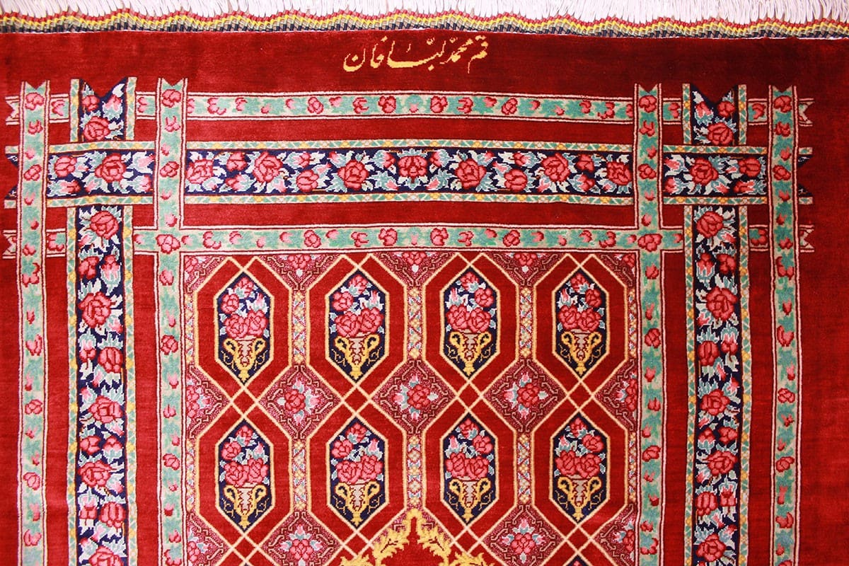 Der Ghom-Teppich hat seine Wurzeln in der Stadt Ghom im Iran, einem Ort mit reicher Teppichtradition und kulturellem Erbe. Ghom ist bekannt für seine exquisiten Teppiche und wird oft als das Zentrum der persischen Teppichkunst angesehen. Die Teppichknüpfer aus dieser Region sind für ihre herausragenden Fähigkeiten berühmt, was zu einer hohen Nachfrage nach Ghom-Teppichen führt. Diese Teppiche sind oft mit feinen, floralen Motiven und geometrischen Formen dekoriert, die symbolisch für die natürliche Schönheit der Region stehen und sich oft auf klassischen Mustern basieren. Die reiche Farbpalette, die in Ghom-Teppichen verwendet wird, spiegelt die prachtvollen Farben der iranischen Landschaft wider.