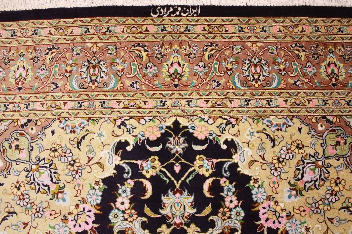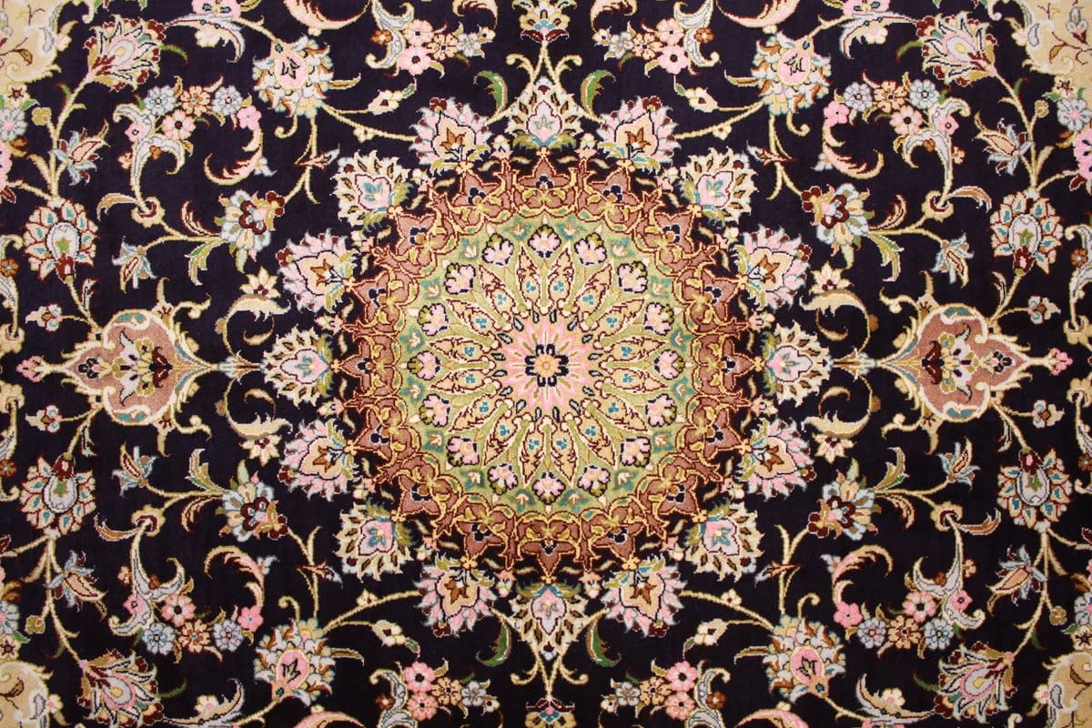 Die Muster des Seidenteppichs aus Ghom sind sowohl traditionell als auch modern. Oft sind florale Motive, geometrische Formen oder meditative Muster zu finden, die den Teppich zu einem wahren Blickfang machen. Die dunkle blaue Farbpalette verleiht dem Teppich eine Aura von Stil und Eleganz und lässt sich hervorragend mit verschiedenen Einrichtungsstilen kombinieren – von klassisch bis modern.