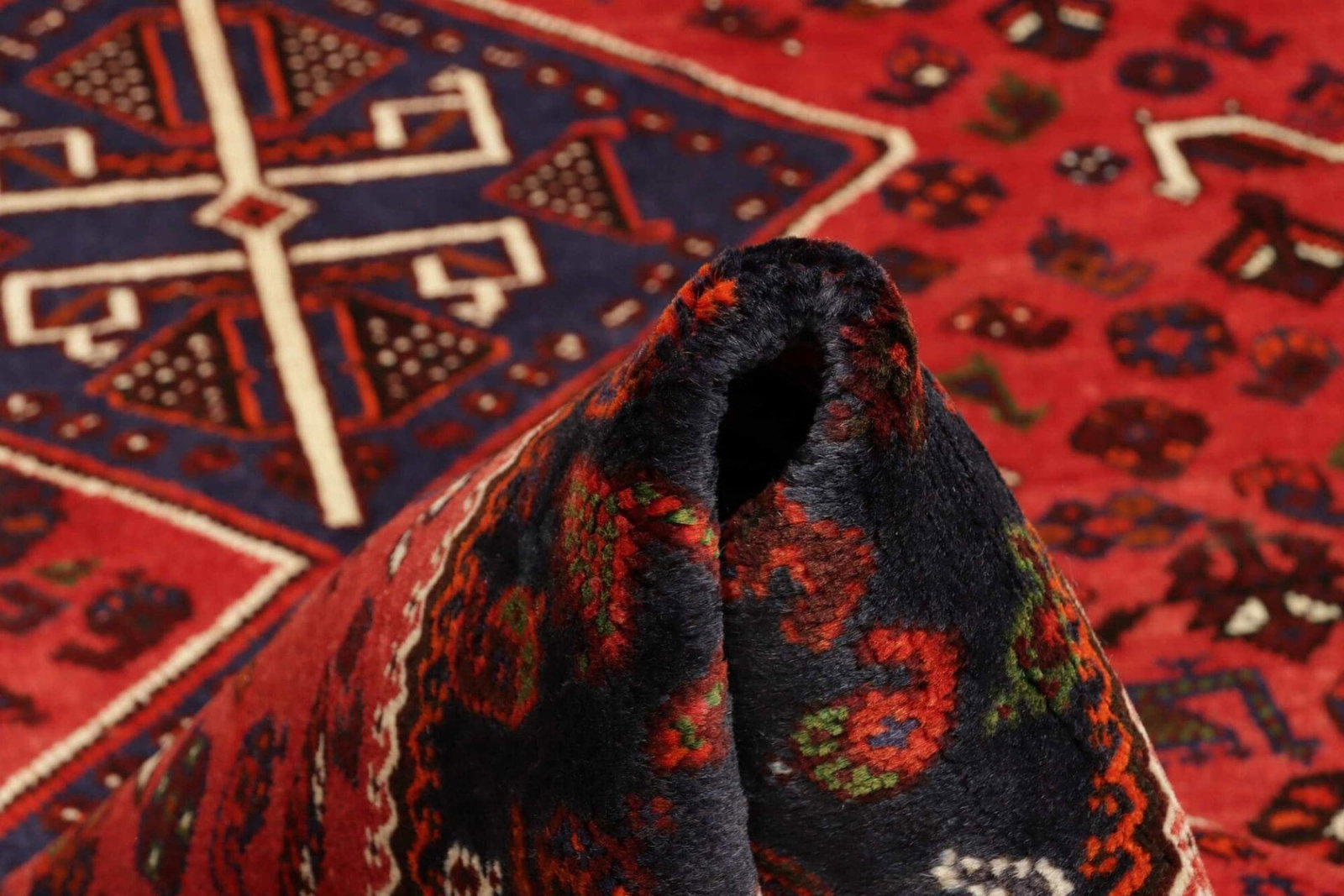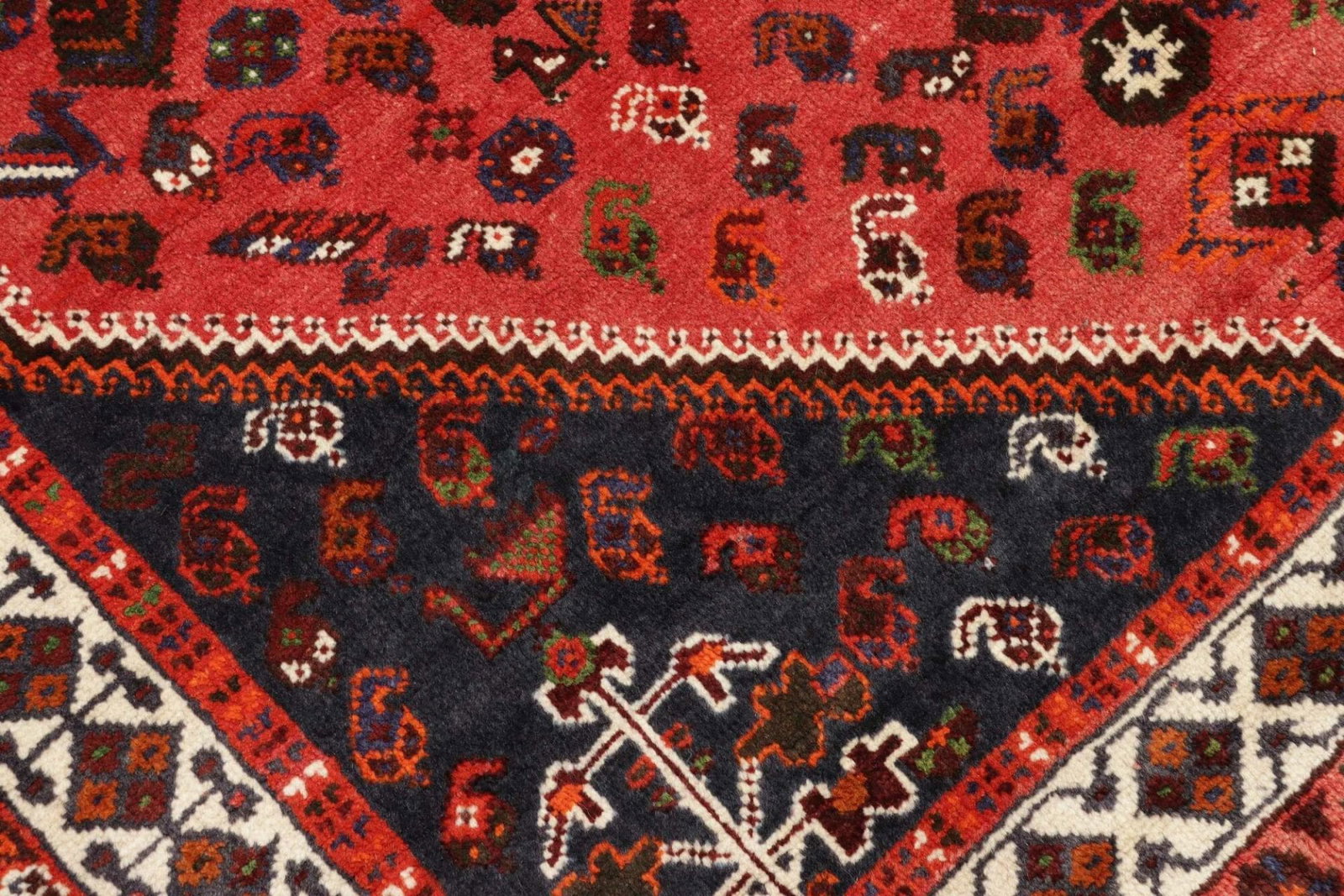 Shiraz, die Stadt, aus der dieser Teppich stammt, ist bekannt für ihre reiche Teppichtradition und Handwerkskunst. Diese Region im Süden Irans ist berühmt für die Herstellung von Teppichen, die nicht nur in der Heimat, sondern auch international geschätzt werden. Die Teppiche aus Shiraz zeichnen sich durch ihre besonderen Muster und Farbpaletten aus, wobei oft kräftige Rottöne, Blau- und Erdtöne verwendet werden. Teppichknüpferinnen und -knüpfer aus dieser Region verwenden häufig traditionelle Motive, die oft von der Natur und der Umgebung inspiriert sind, sowie geometrische Muster, die diesem Teppich seinen einzigartigen Charakter verleihen.