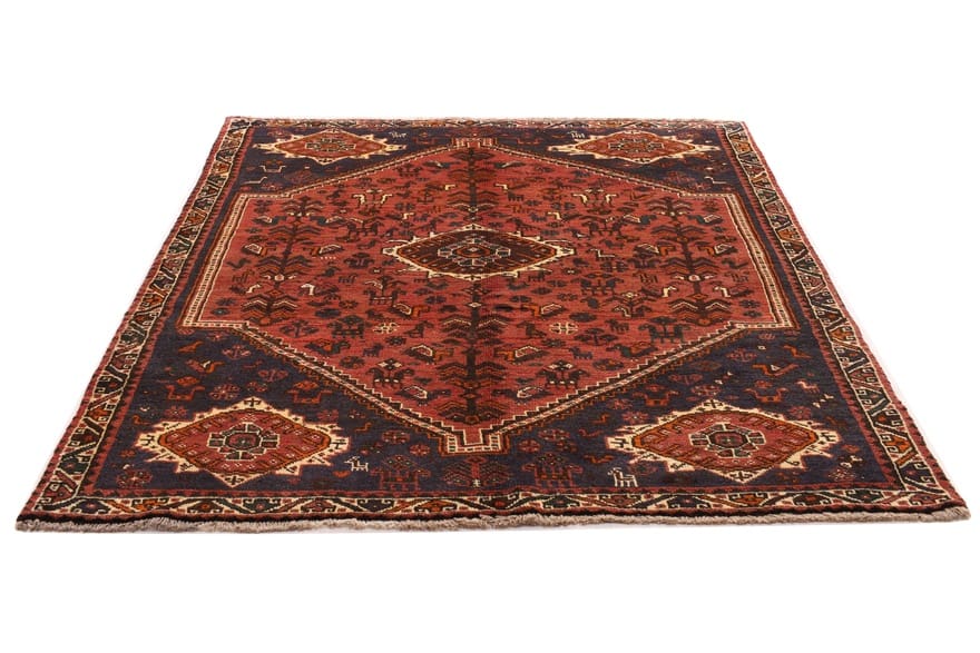Traditioneller Shiraz-Teppich | Knotendichte: 128.000 – 160.000 Knoten/m² | Material: Hochwertige Wolle | Größe: 217×171 cm | Farbe: Rot/Orange | Zustand: Neuzeitlich (0-20 Jahre) | Herkunft: Iran/Persien | Verarbeitung: Handgeknüpft