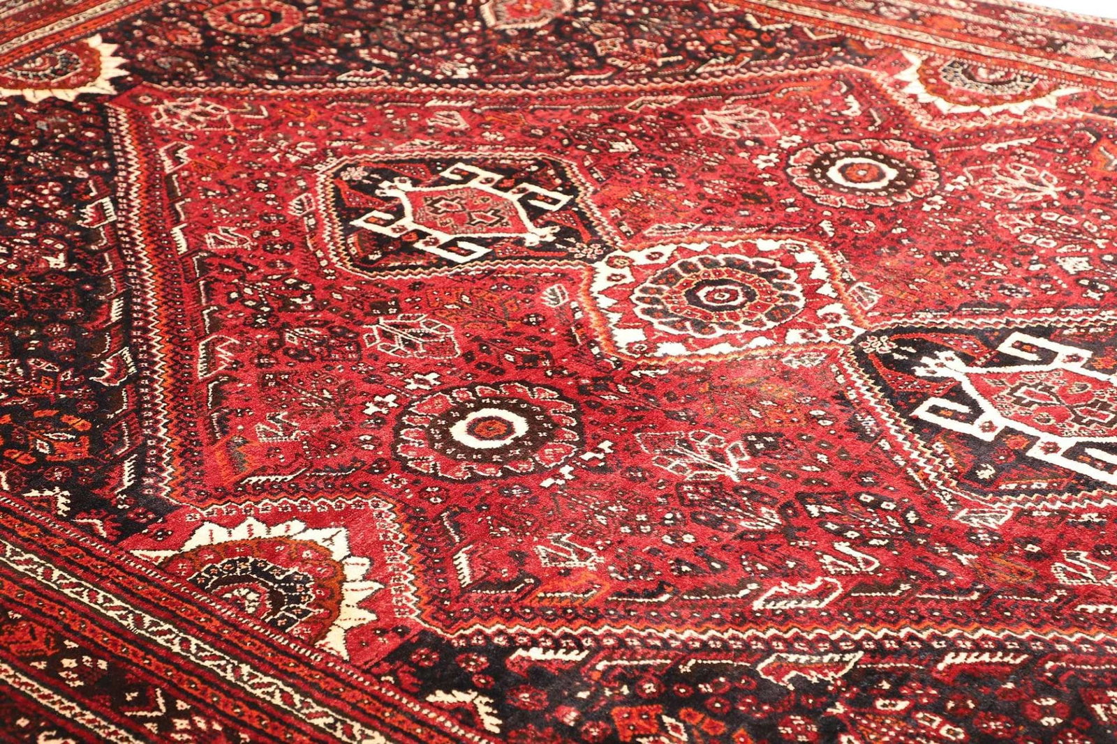 Die Region um Shiraz ist berühmt für ihre erdigen Farben und vielfältigen Muster, die oft florale und geometrische Elemente kombinieren. Teppiche aus Shiraz zeichnen sich durch ihre besonderen Symbole und Motive aus, die Geschichten und Traditionen der Region erzählen. Diese Teppiche werden typischerweise in Handarbeit hergestellt, was zu ihrer Einzigartigkeit und dem unverwechselbaren Charme beiträgt.