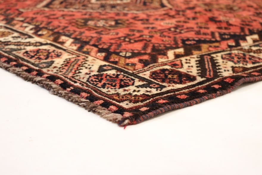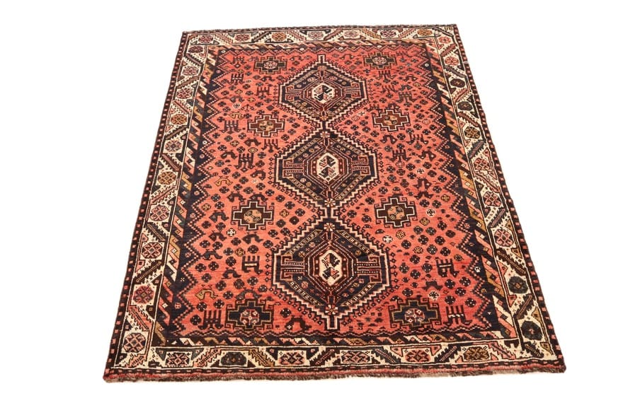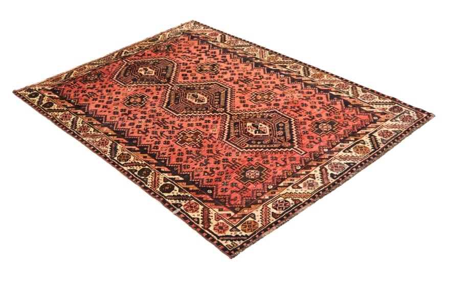 Traditioneller Shiraz-Teppich | Knotendichte: 128.000 – 160.000 Knoten/m² | Material: Wolle (Flor), Baumwolle (Kette) | Größe: 232×169 cm | Farbe: Rot/Orange | Zustand: Neuzeitlich (0-20 Jahre) | Verarbeitung: Handgeknüpft | Ursprung: Iran / Persien