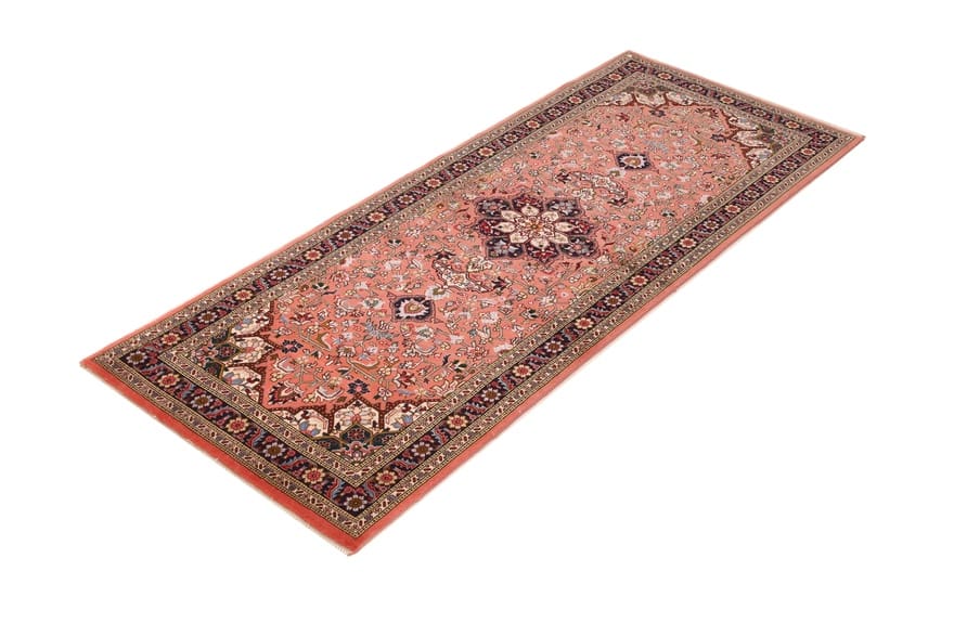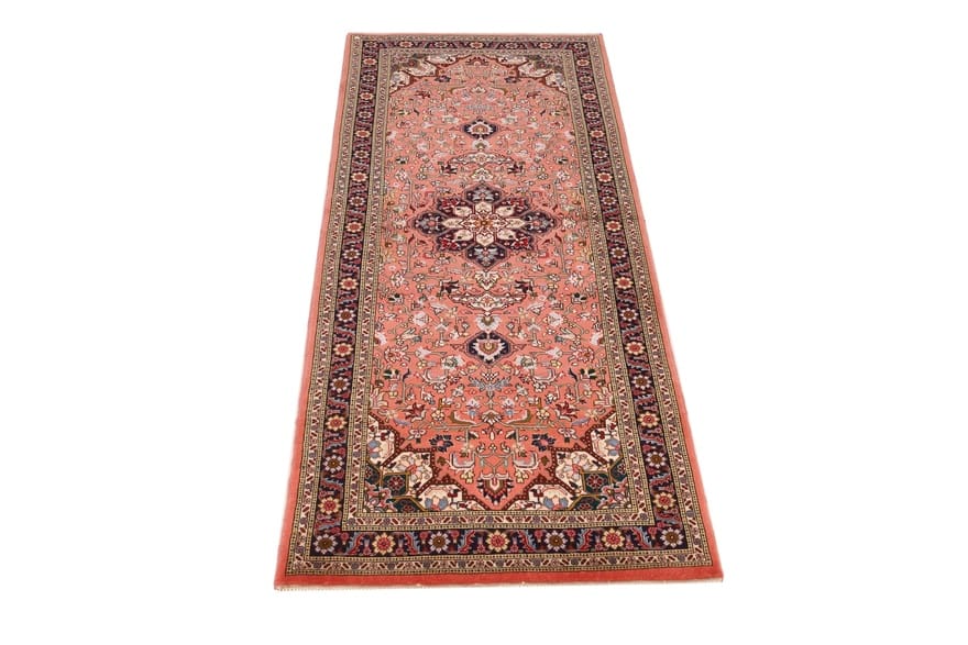 Tabriz-Teppich | Knotendichte: 440.000 – 490.000 Knoten/m² | Material: Wolle und Seide | Größe: 207×79 cm | Farbe: Rot/Orange | Herkunft: Iran/Persien | Zustand: Neuzeitlich (0-20 Jahre) | Verarbeitung: Handgeknüpft | Dicke: ca. 6 mm | Gewicht: ca. 6 kg