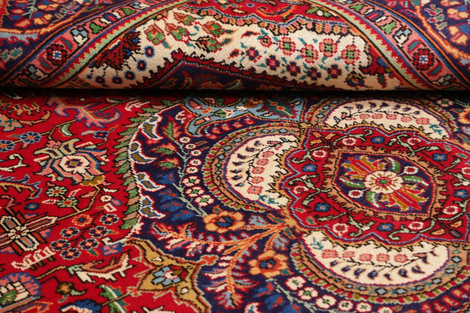 Der Täbriz Teppich besticht durch sein eindrucksvolles Restylierungen von traditionellen Mustern, die mit einer Fülle von Details gespickt sind. Die Farben sind harmonisch aufeinander abgestimmt und schaffen eine elegante Atmosphäre in jedem Raum. Der Teppich kombiniert klassische Orient-Muster mit einem modernen Touch, was ihn sowohl zeitlos als auch aktuell macht. Bei genauerer Betrachtung werden die fein ausgearbeiteten Motive sichtbar, die Geschichten erzählen und den Teppich zu einem echten Kunstwerk machen.
