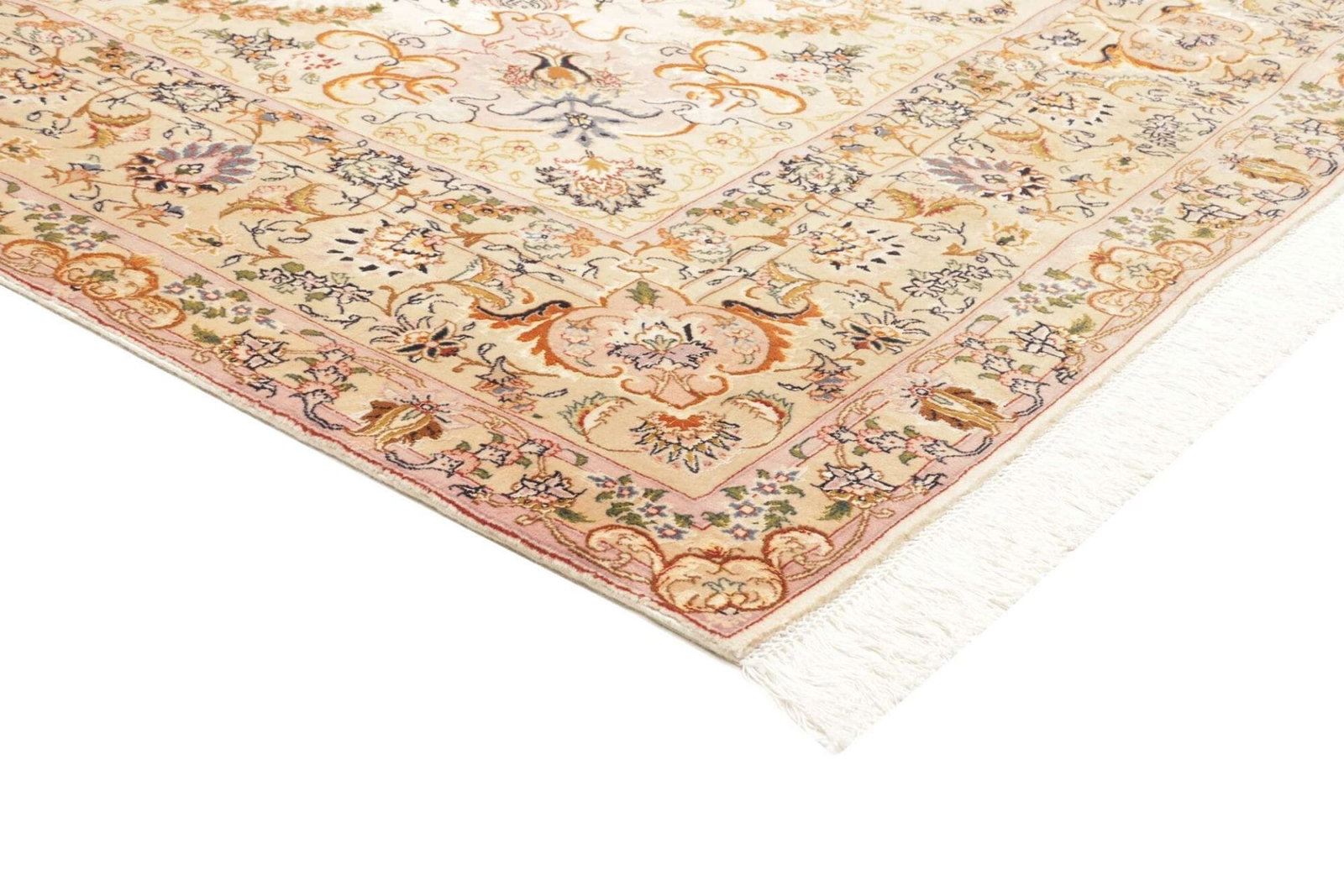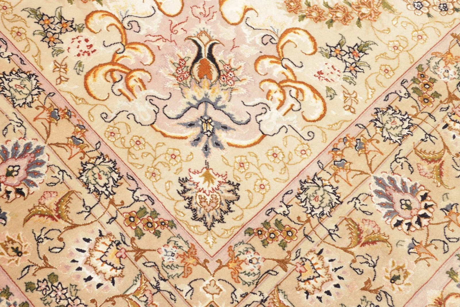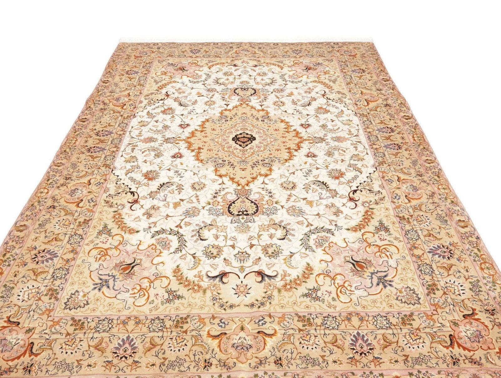 Der Teppich stammt aus der berühmten Region Täbriz im Iran, die für ihre reiche Tradition in der Teppichherstellung bekannt ist. Täbriz hat über Jahrhunderte hinweg handwerkliche Techniken verfeinert, die von Generation zu Generation weitergegeben wurden. Tabriz Teppiche sind für ihre feinen Details und komplexen Designs bekannt, die oft historische oder mythologische Themen aufgreifen. Die Teppichknüpferei in Täbriz zeichnet sich durch ihre feinfühlige Handarbeit aus, und viele der erfahrenen Handwerker haben ihr Leben der Erhaltung dieser alten Kunst gewidmet.