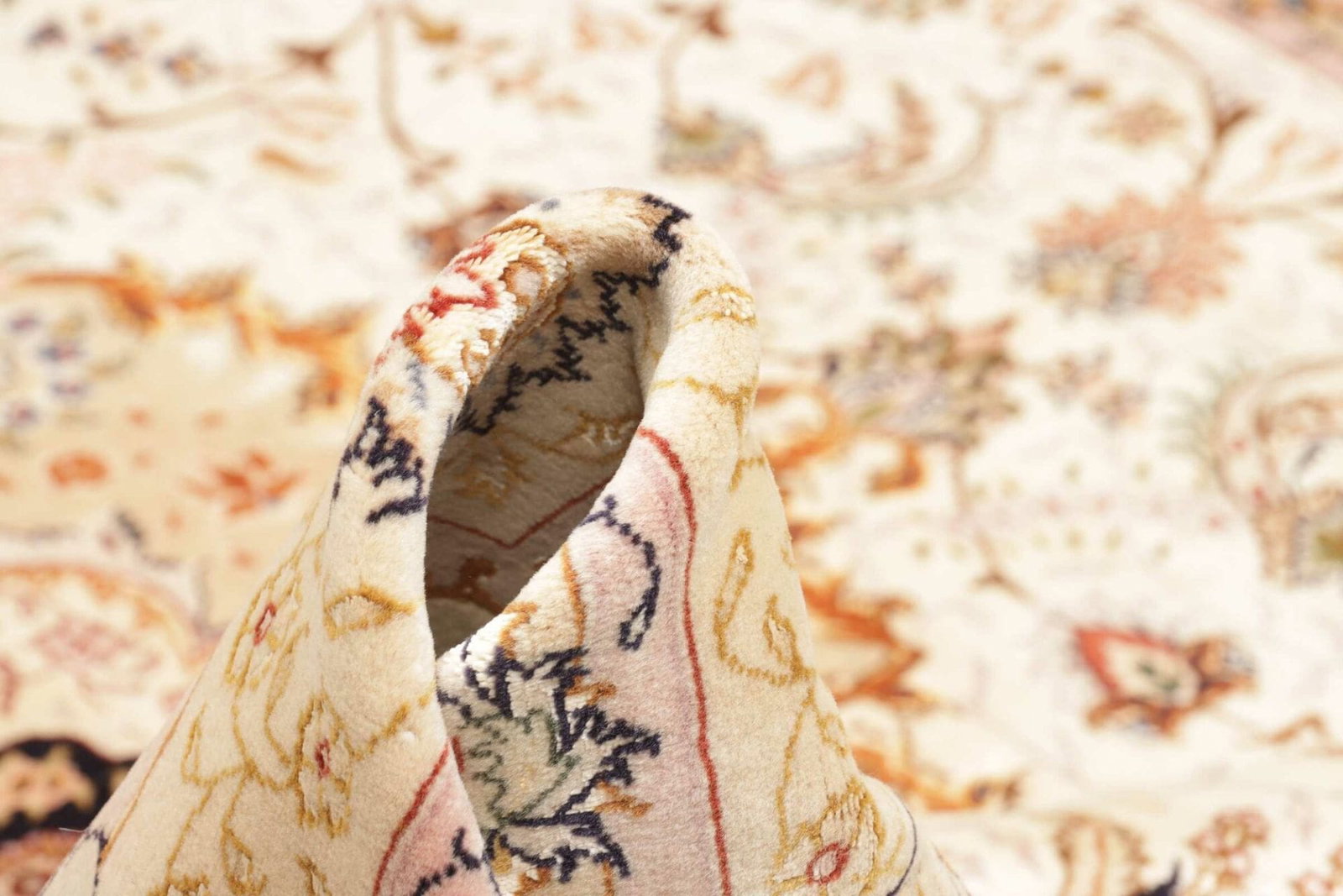Ein besoneres Merkmal des Täbriz Teppichs ist die außergewöhnliche Verwendung von Farben und die Detailgenauigkeit der Muster. Diese Teppiche sind nicht nur dekorative Elemente, sondern sie erzählen Geschichten und bringen einen Hauch von Geschichte und Kultur in Ihr Zuhause. Neben ihrer Funktionalität sind sie auch hochwertige Sammlerstücke, die im Wert steigen können. Ob als Blickfang im Wohnzimmer oder als stilvolle Ergänzung im Schlafzimmer – dieser Teppich wird garantiert Bewunderung finden.