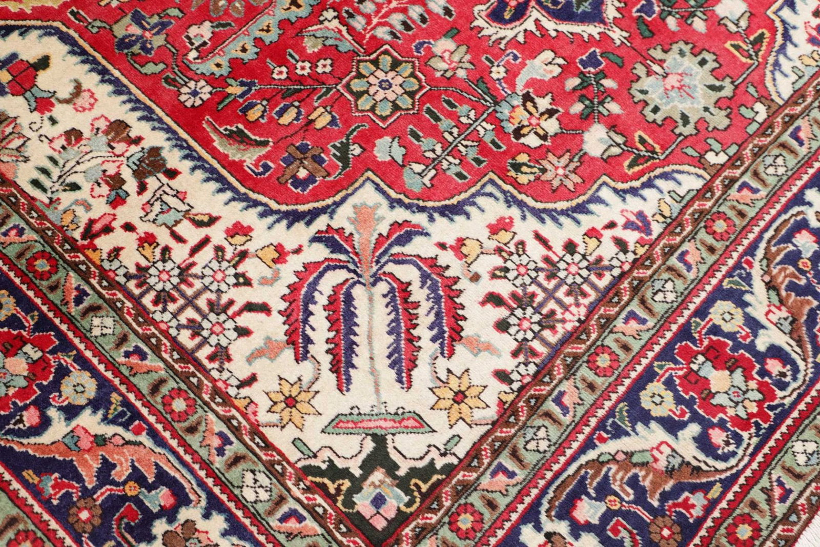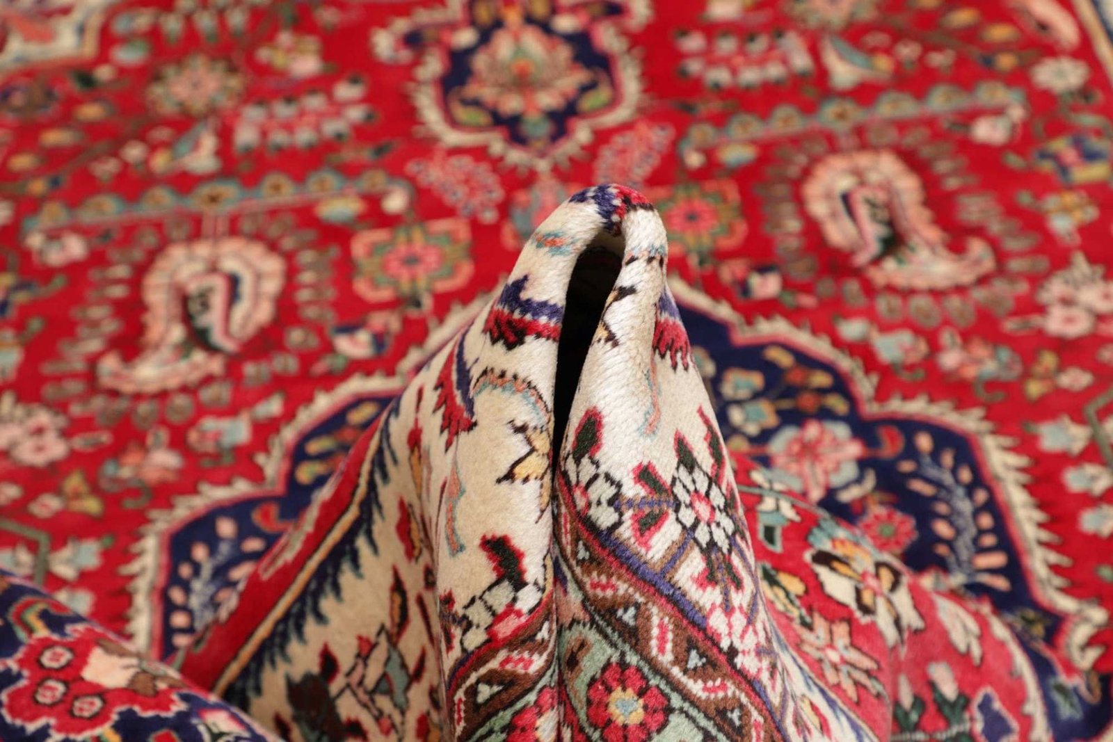 Ein markantes Merkmal des Täbriz Teppichs ist seine Hochwertigkeit und die Detailgenauigkeit, die die Handwerkskunst des Teppichknüpfens widerspiegelt. Die Knotendichte ist sehr hoch, was bedeutet, dass die Muster klar und präzise ausgeführt werden, während die Struktur des Teppichs robust und langlebig bleibt. Dieser Teppich ist ideal für Bereiche mit hohem Fußverkehr, da er sowohl Funktionalität als auch Ästhetik vereint.