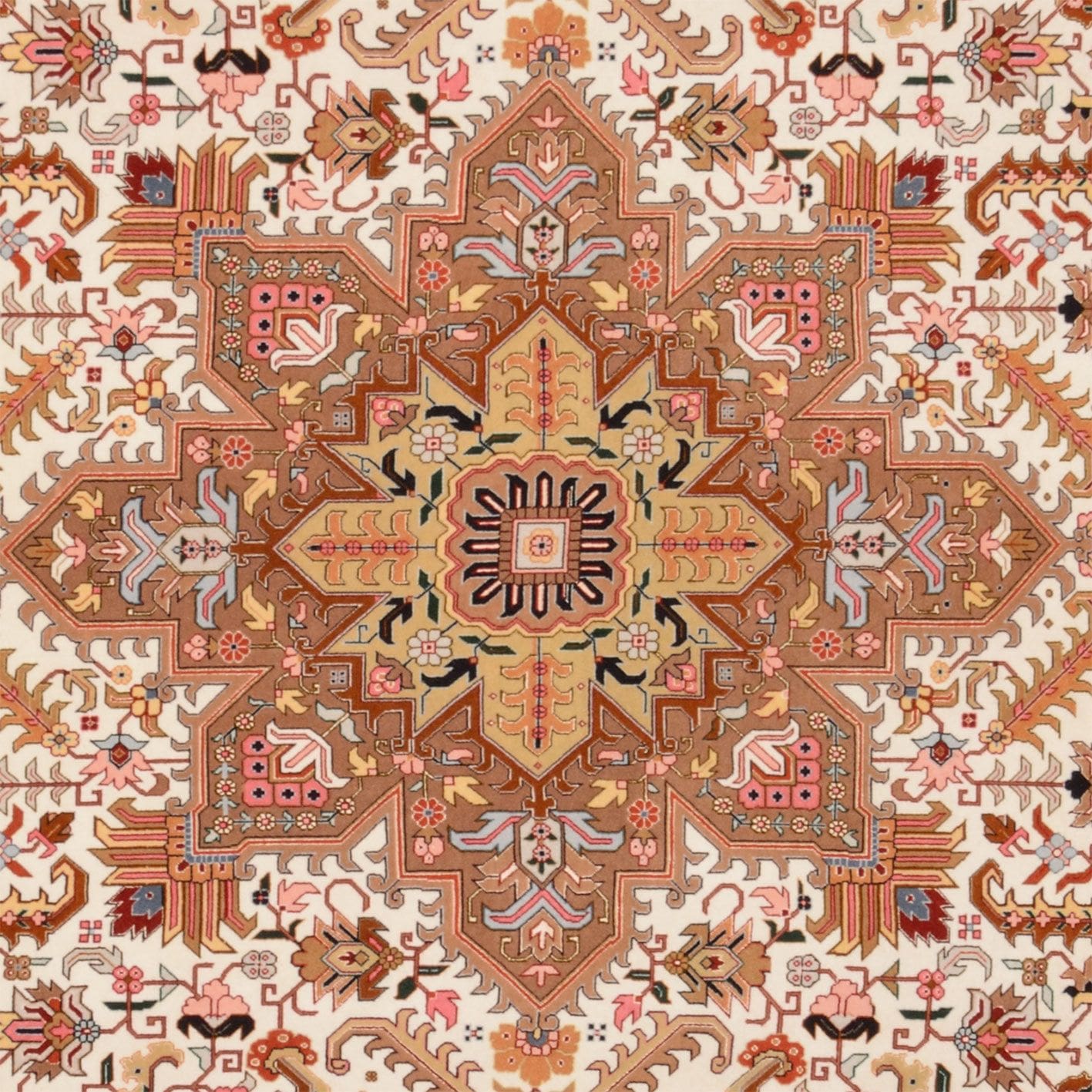 Dieser Teppich stammt aus Tabriz, einer der bedeutendsten Teppichproduktionsregionen im Iran. Die Stadt Tabriz hat eine jahrhundertealte Tradition in der Teppichknüpferei und gilt als eines der wichtigsten Zentren für die Herstellung hochwertiger Perserteppiche. Tabriz ist bekannt für seine Vielfalt an Designs, die von floralen Mustern bis hin zu geometrischen Formen reichen. Die Teppichknüpfkunst hat in dieser Region tief verwurzelte kulturelle Bedeutung, und die Handwerker sind stolz darauf, ihre Traditionen und Techniken über Generationen weiterzugeben.