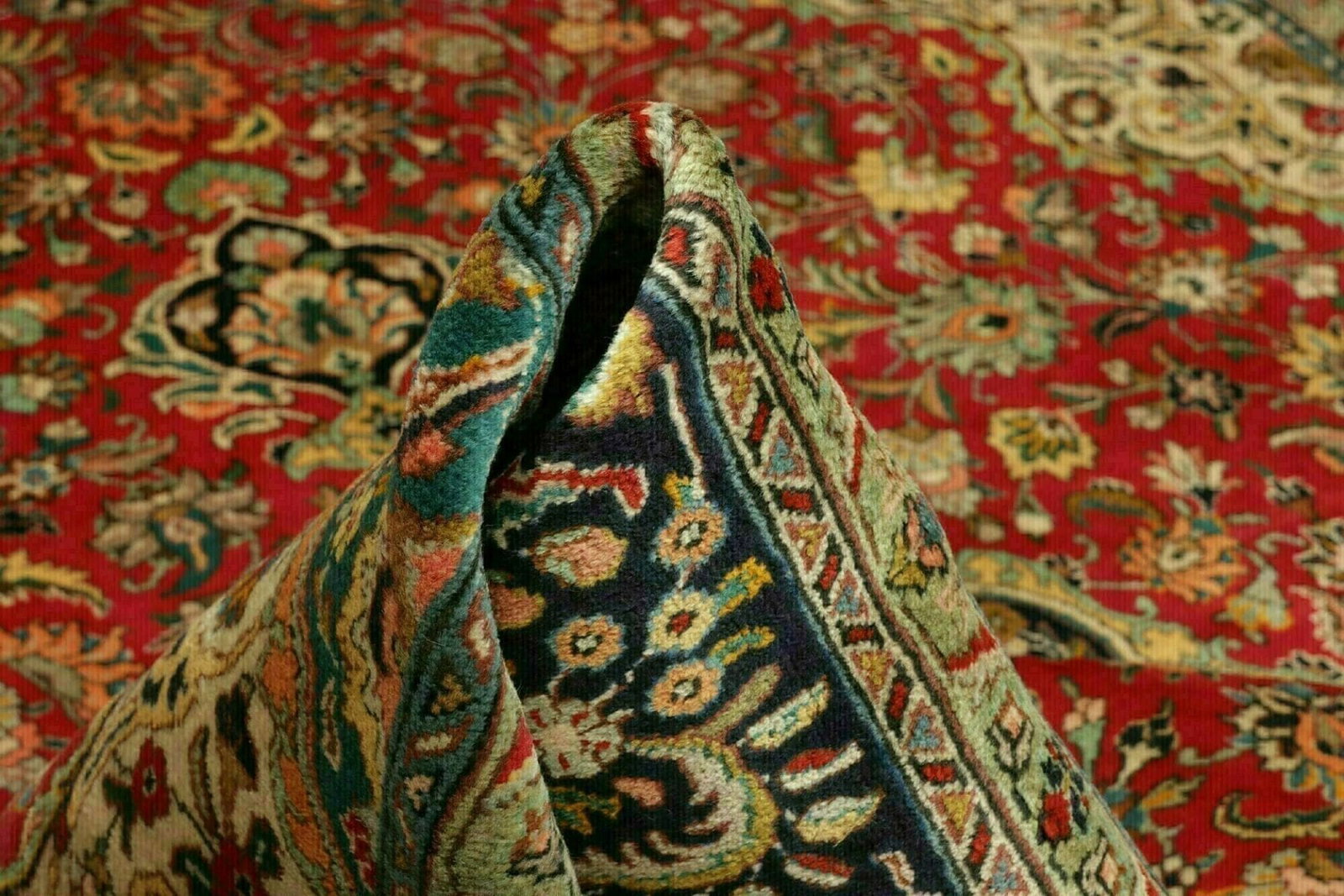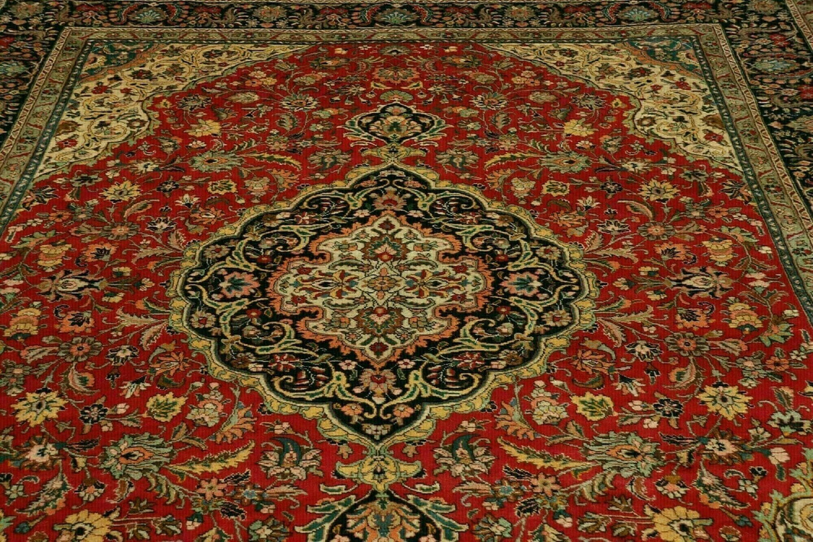 Dieser Teppich stammt aus der historischen Stadt Täbriz im Iran, die seit Jahrhunderten für ihre Teppichproduktion bekannt ist. Täbriz liegt im Nordwesten des Landes und ist ein wichtiger Knotenpunkt für die Teppichkunst. Die Stadt hat eine lange Tradition in der Teppichknüpferei, die bis ins 15. Jahrhundert zurückreicht. Täbriz Teppiche sind berühmt für ihre komplizierten Designs und die Verwendung von lebendigen Farben. Die Region ist besonders für ihre feinen Wolle und die hohe Qualität ihrer Handwerkskunst bekannt.