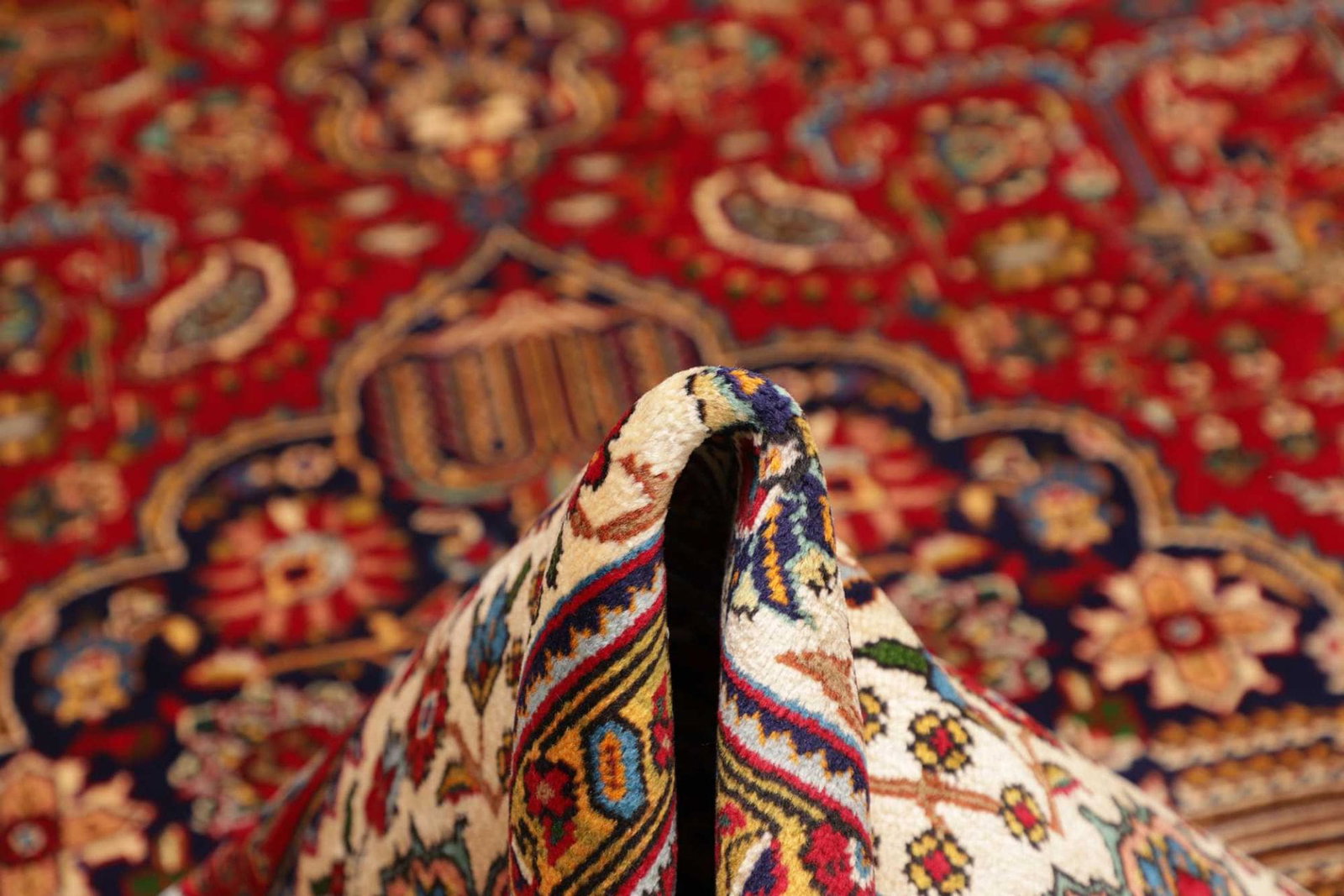 Aufgrund der hochwertigen Wolle und der traditionellen Färbetechniken sind die Farben dieses Täbriz Teppichs sehr stabil und setzen sich in der Regel nicht ab, wenn er ordnungsgemäß gepflegt wird.