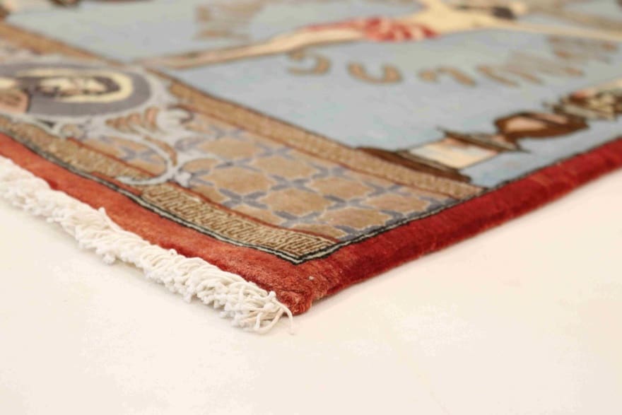 Der Teppich zeigt ein eindrucksvolles Kreuzigungsmotiv, das für die religiöse Symbolik in der persischen Kultur steht. Die kunstvoll gestalteten Muster sind nicht nur dekorativ, sie tragen auch eine tiefere Bedeutung und spiegeln die Historie und das kulturelle Erbe Irans wider. Orientalische Muster zeichnen sich durch ihre Komplexität und Vielfalt aus, die von floralen und geometrischen Elementen bis hin zu symbolischen Darstellungen reichen. Durch die harmonische Farbgestaltung und die sorgfältige Auswahl der Motive wird dieser Teppich zu einem wahren Blickfang in jedem Raum.