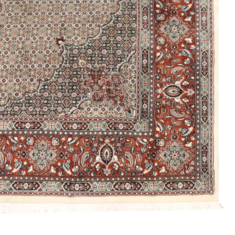 Handgeknüpfter Moud Teppich | Knotendichte: 320.000 – 360.000 Knoten/m² | Material: Wolle und Seide | Größe: 344×248 cm | Farbe: Warmes Rot und Elfenbein | Zustand: Neu | Ursprung: Iran / Persien | Pflegeleicht und langlebig | Ideal für stilvolle Räume