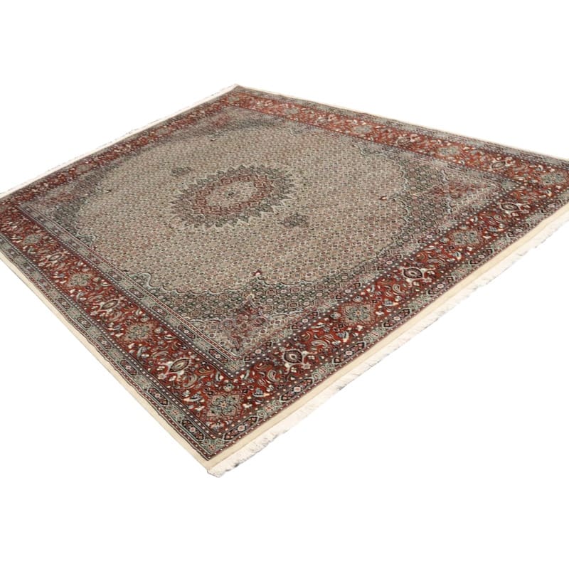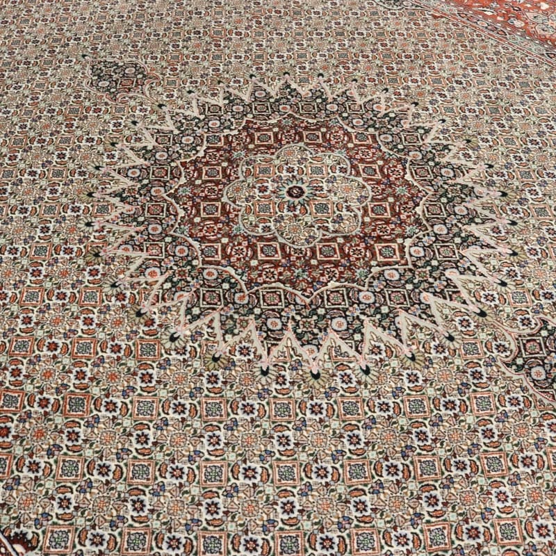 Handgeknüpfter Moud Teppich | Knotendichte: 320.000 – 360.000 Knoten/m² | Material: Wolle und Seide | Größe: 344×248 cm | Farbe: Warmes Rot, Elfenbein | Zustand: Neu | Ursprung: Iran / Persien | Dicke: ca. 18 mm | Pflegeleicht und langlebig