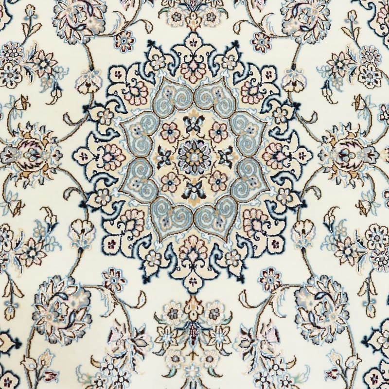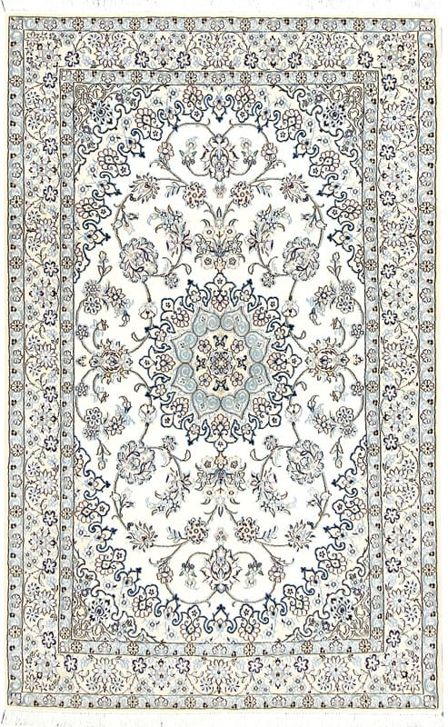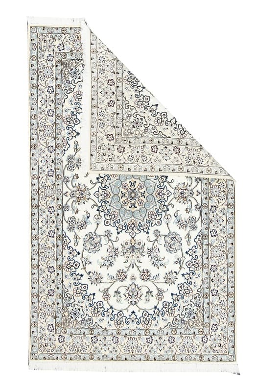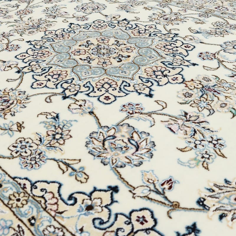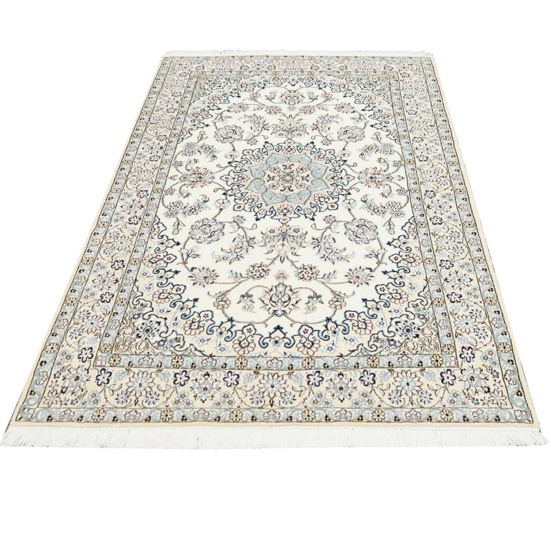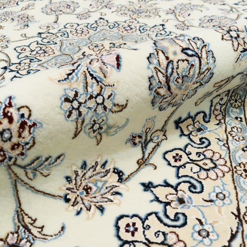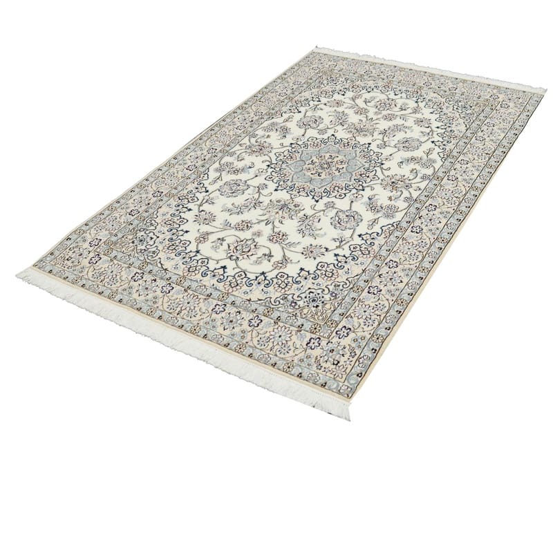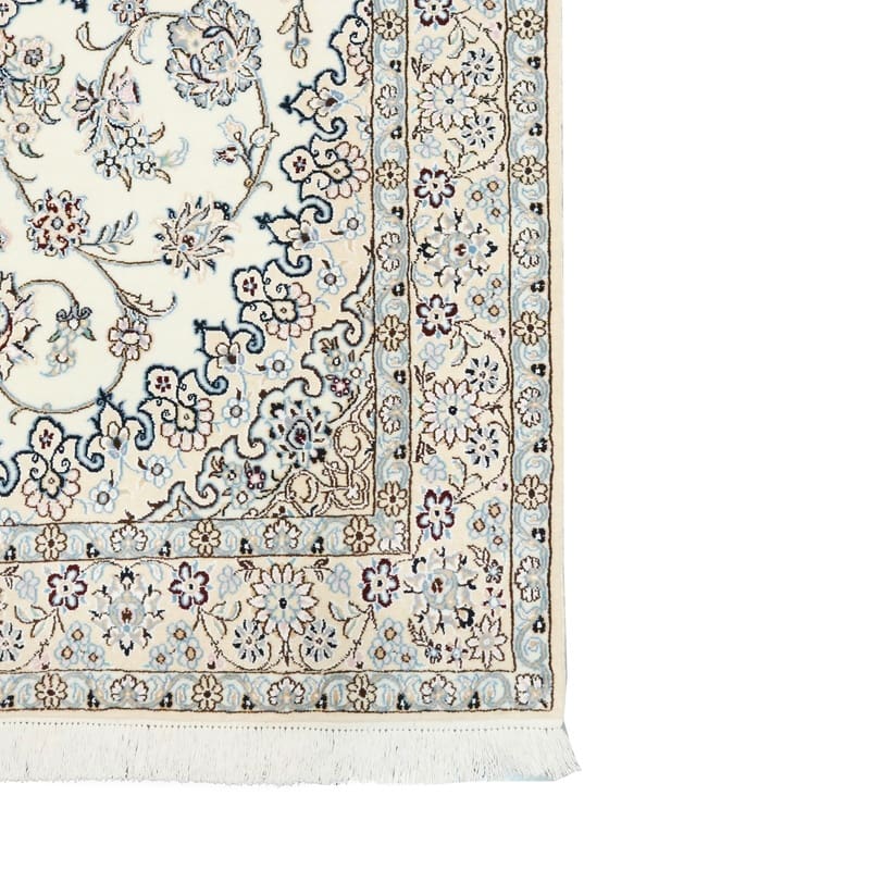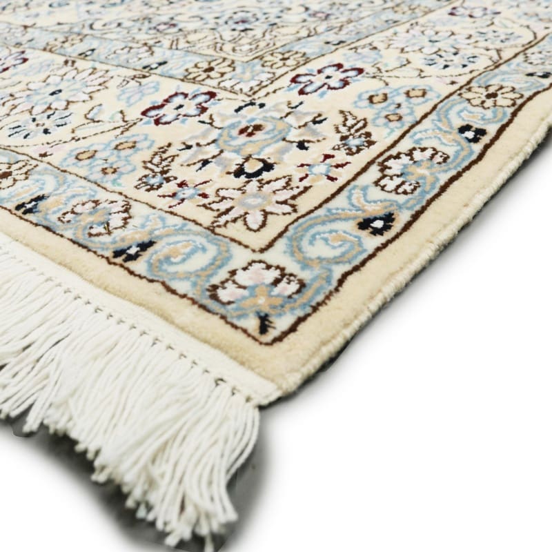 Handgewebter Nain 9 La Teppich | Knotendichte: 320.000 – 360.000 Knoten/m² | Material: Wolle und Seide | Größe: 214×132 cm | Farbe: Elfenbein und Blau | Herkunft: Iran/Persien | Zustand: Neu | Verarbeitung: Handgeknüpft | Gewicht: ca. 6 kg