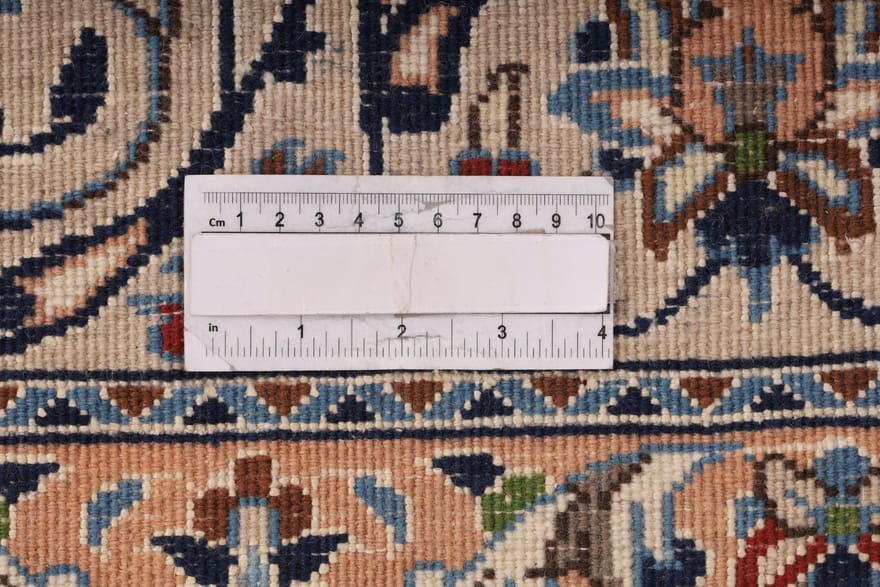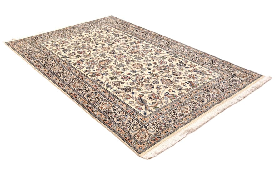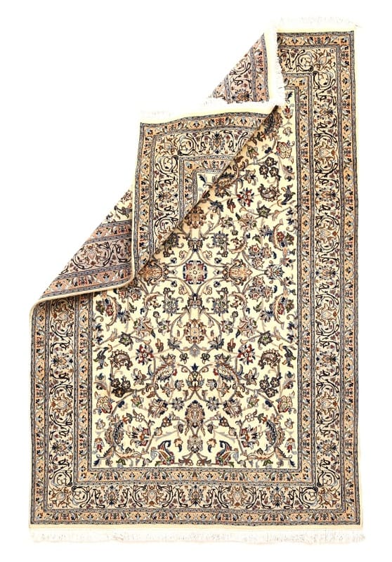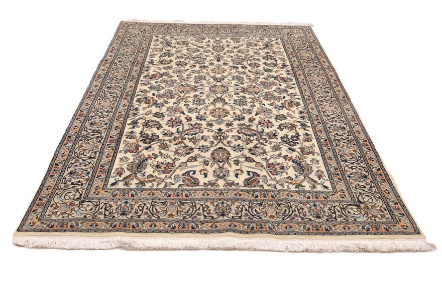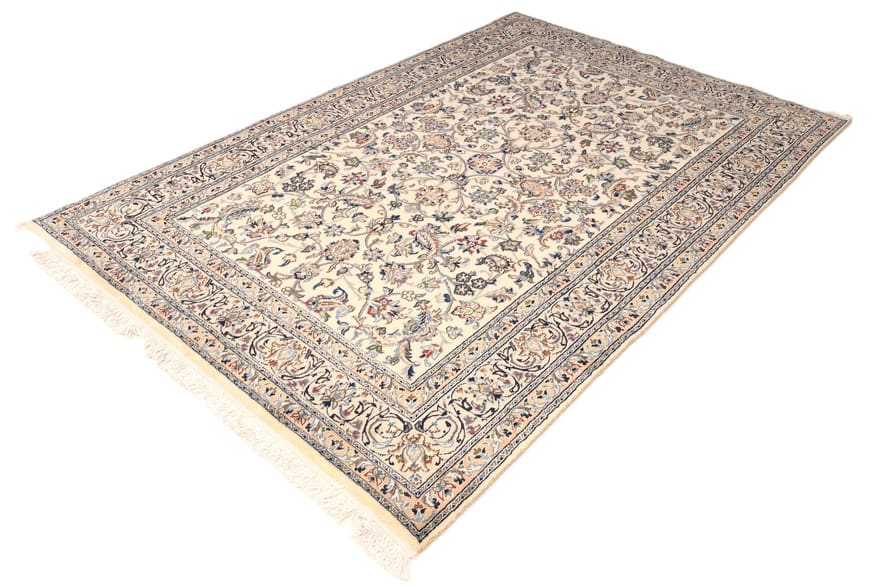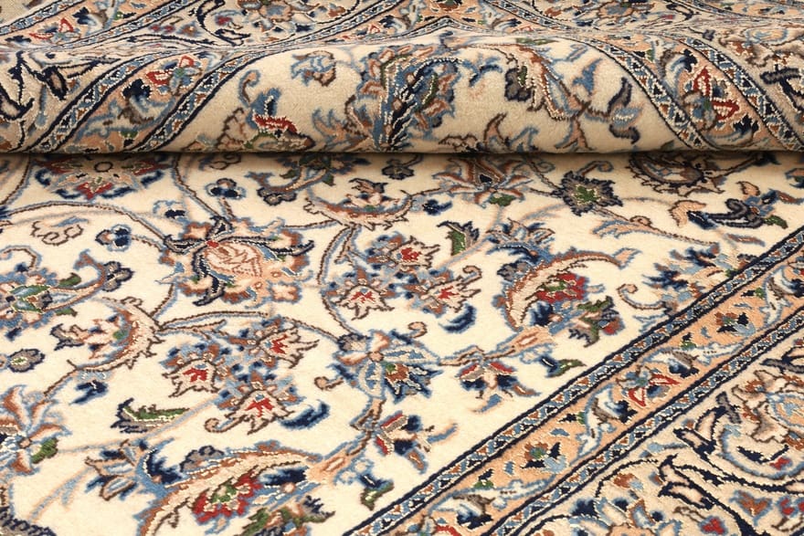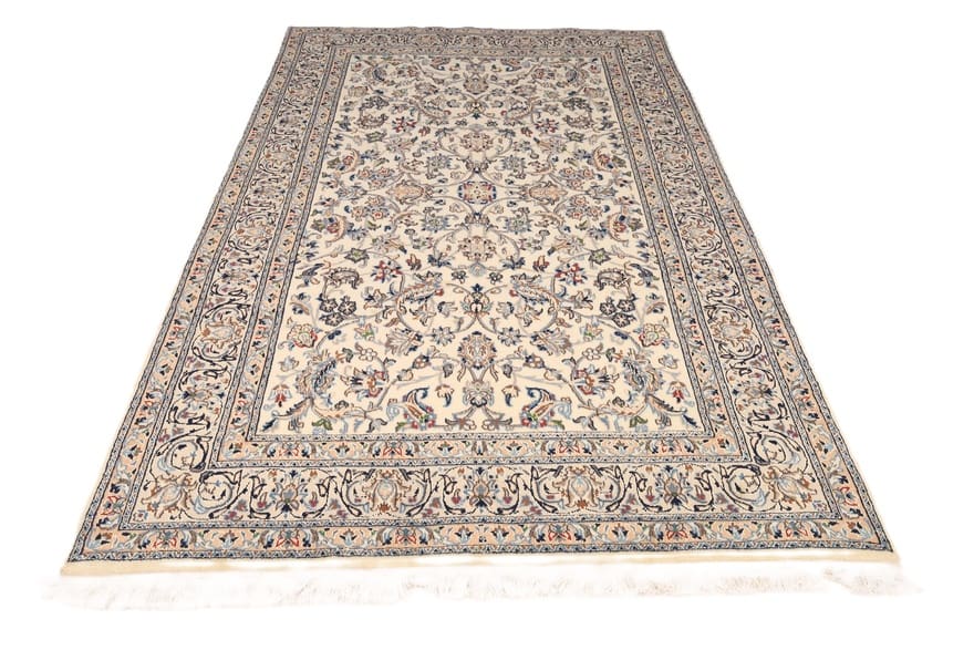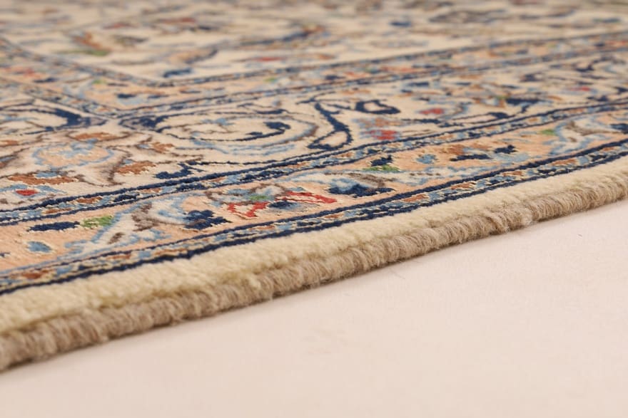 Handgeknüpfter Nain Teppich | Knotendichte: 128.000 – 160.000 Knoten/m² | Material: Hochwertige Wolle und Seide | Größe: 297×196 cm | Farbe: Creme und Blau | Herkunft: Iran/Persien | Zustand: Neu | Dicke: ca. 10 mm | Gewicht: ca. 18 kg | Perfekt für Wohnzimmer und repräsentative Räume