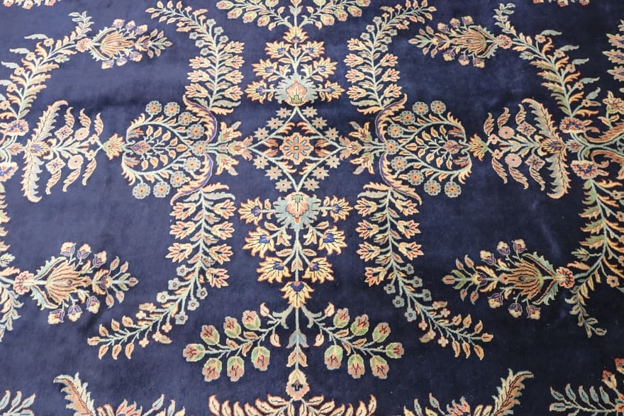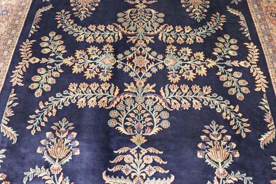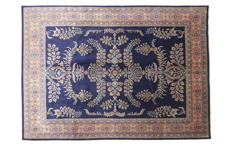 Handgeknüpfter Sarough Teppich | Knotendichte: 200.000 – 250.000 Knoten/m² | Material: Hochwertige Schurwolle | Größe: 347×250 cm | Farbe: Tiefblau mit floralen Ornamenten | Zustand: Neuzeitlich (0-20 Jahre) | Ursprung: Indien | Ideal für Wohn- und Gästezimmer | Pflegeleicht und langlebig