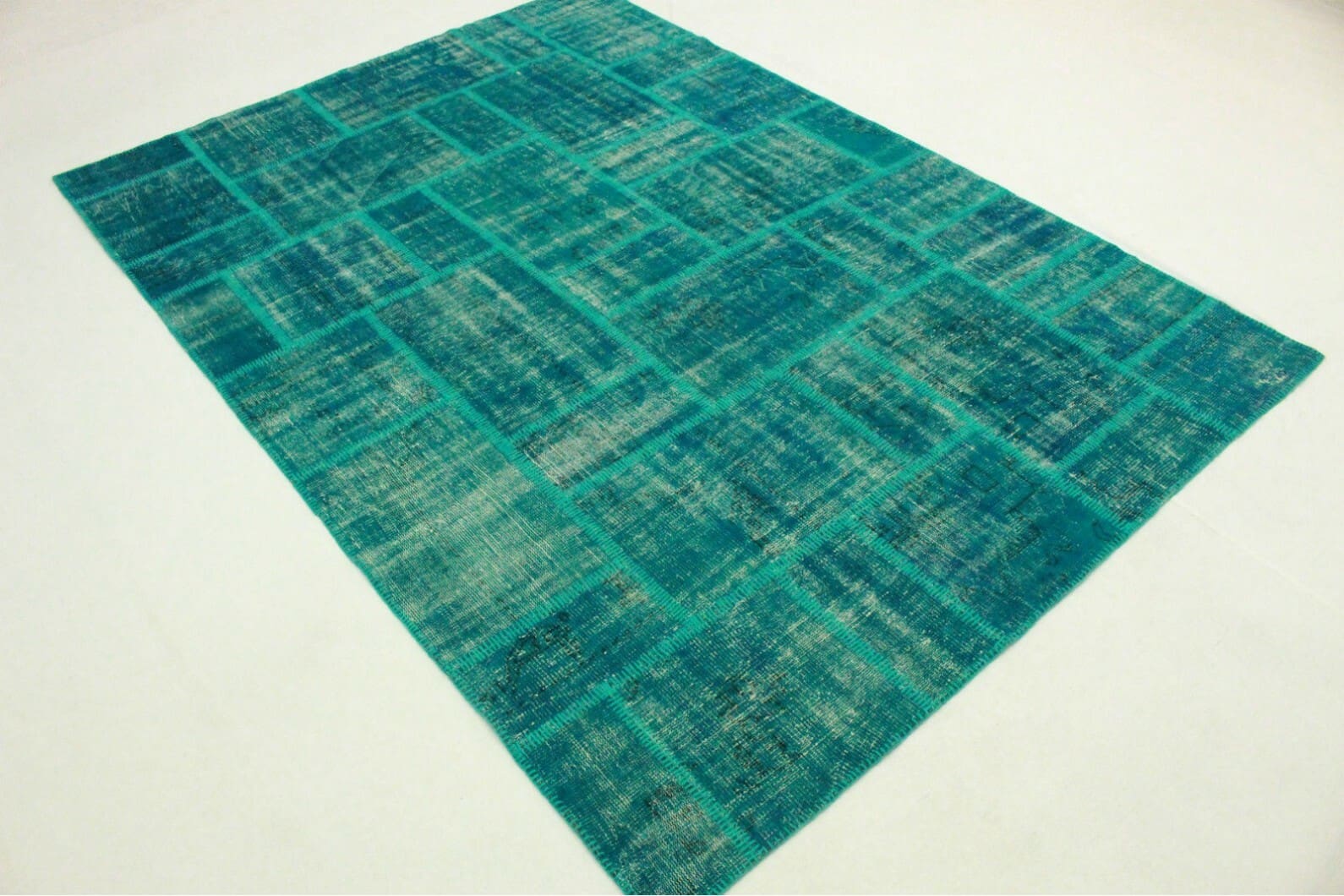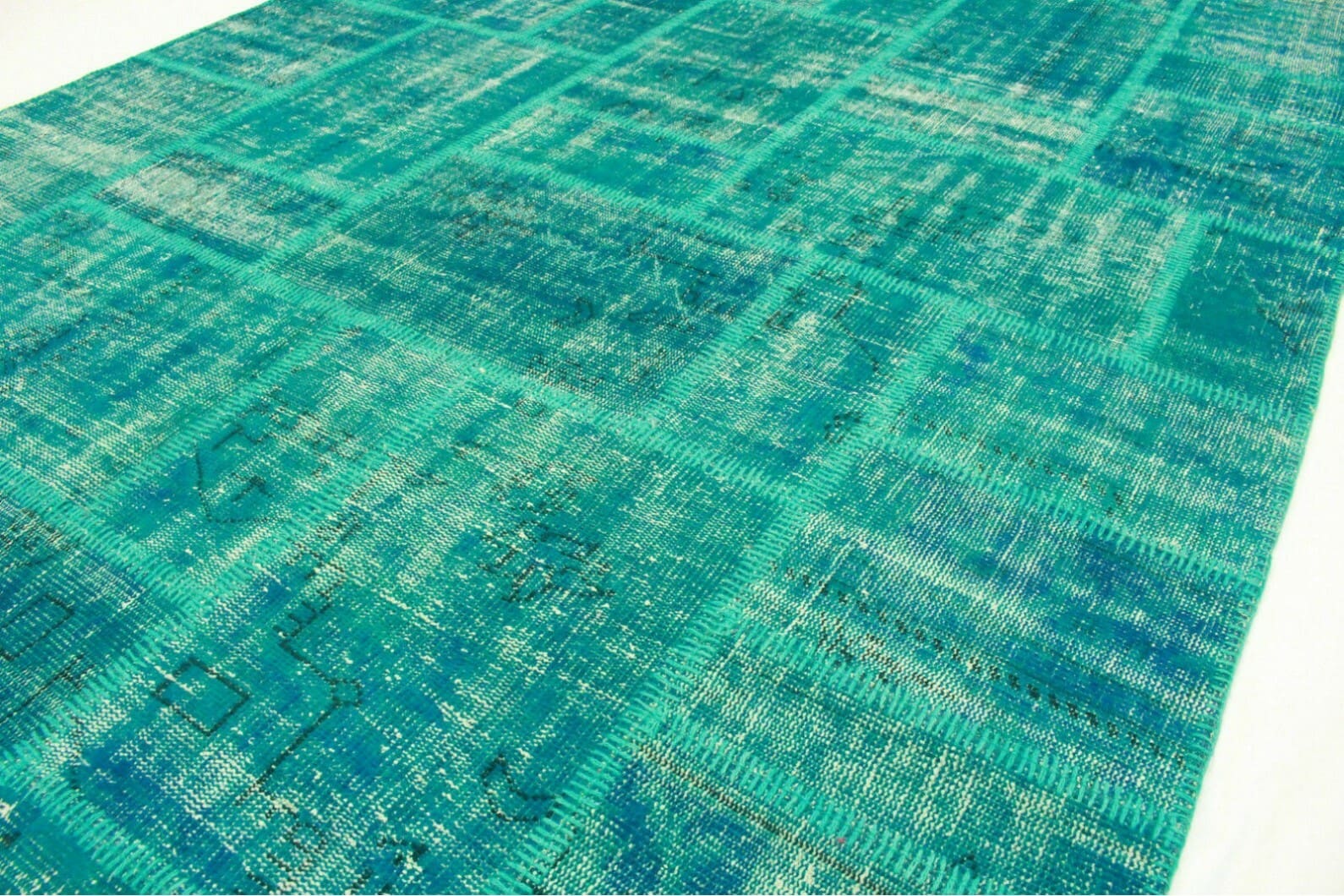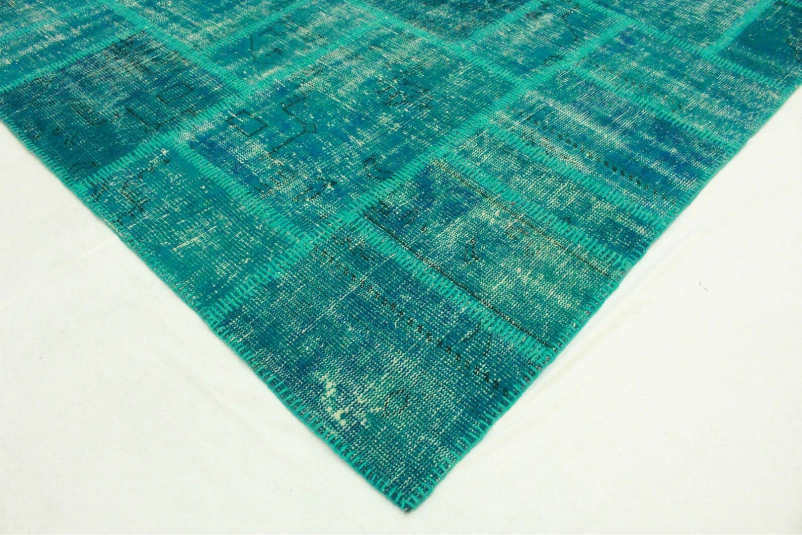 Patchwork Teppich Türkis | Größe: 303×215 cm | Material: Handgesponnene Wolle und Baumwolle | Zustand: Neu mit Etikett | Stil: Modern | Herkunft: Orient | Geeignet für Fußbodenheizung | Ideal für Wohnzimmer, Schlafzimmer, Esszimmer und Arbeitszimmer | Vintage-Optik | Handgeknüpft