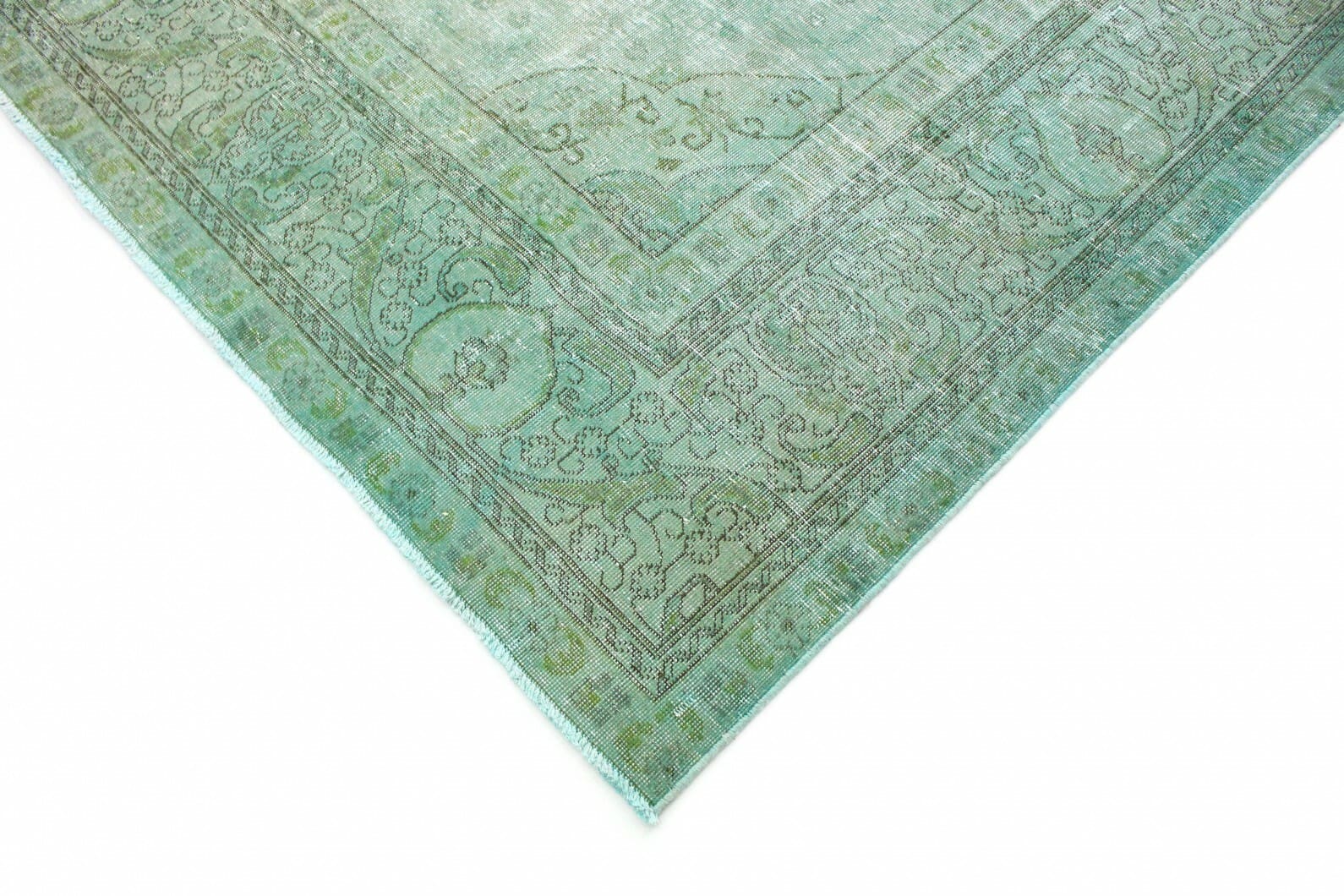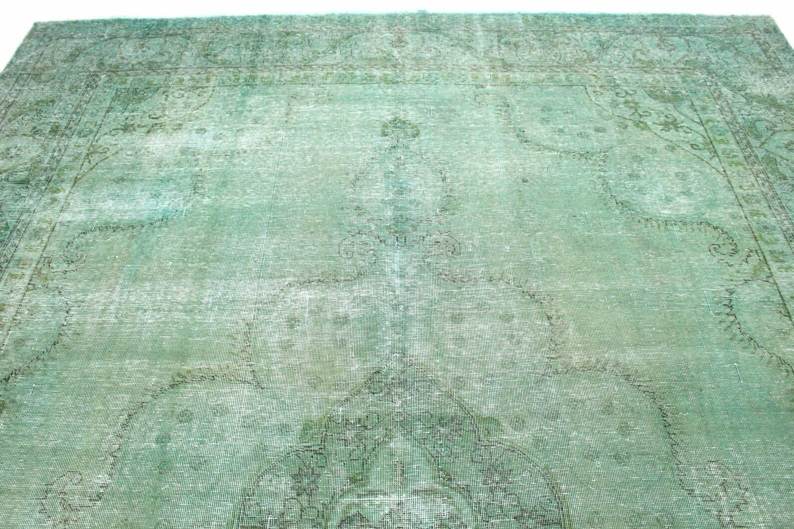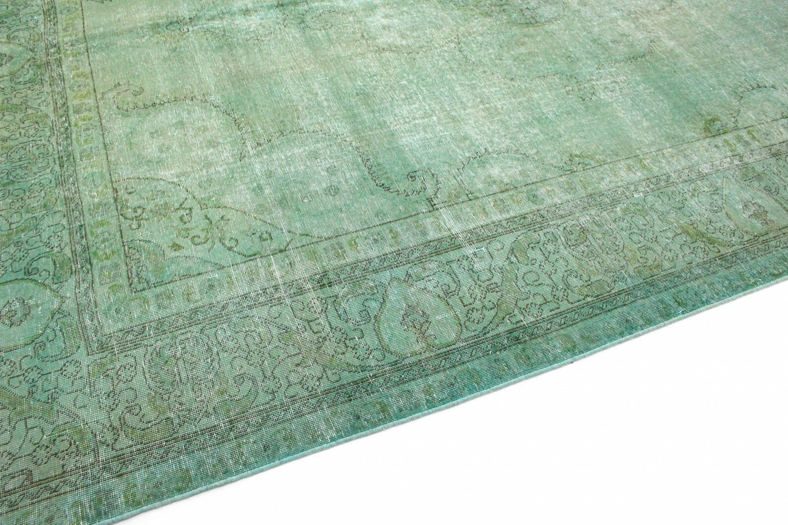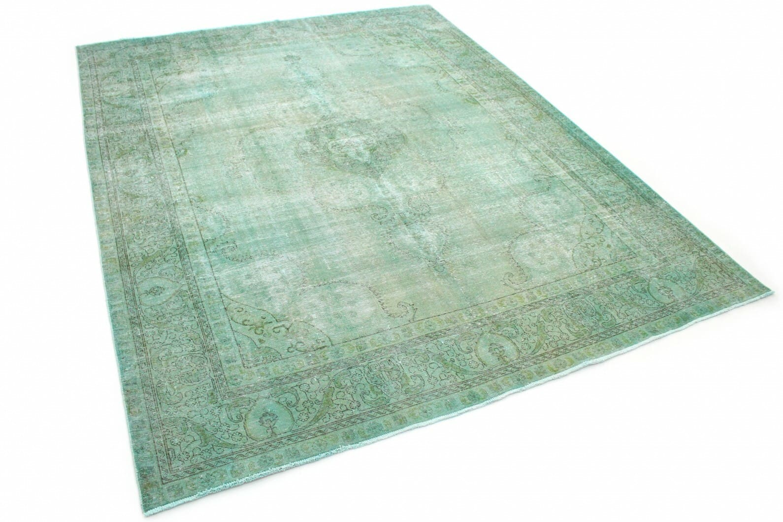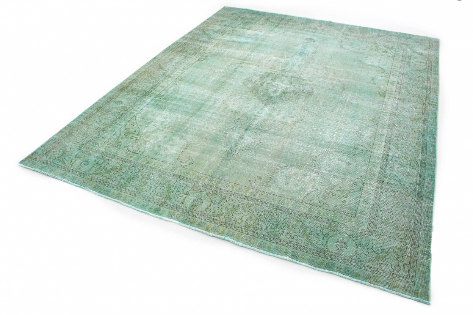 Vintage Teppich Grün Türkis | Knotendichte: Handgeknüpft | Material: Handgesponnene Wolle und Baumwolle | Größe: 390×305 cm | Zustand: Neu mit Etikett | Herkunft: Orient | Stil: Modern mit Vintage-Optik | Für Fußbodenheizung geeignet | Einzigartige Überfärbung und individuelles Design