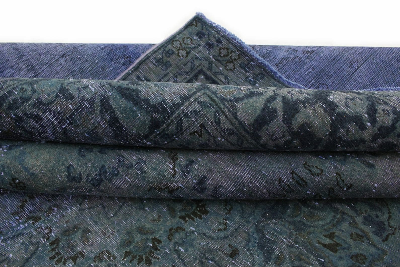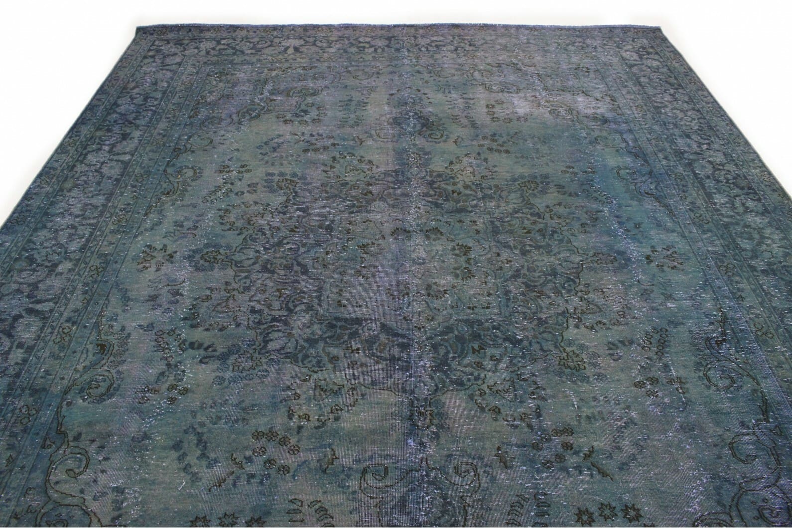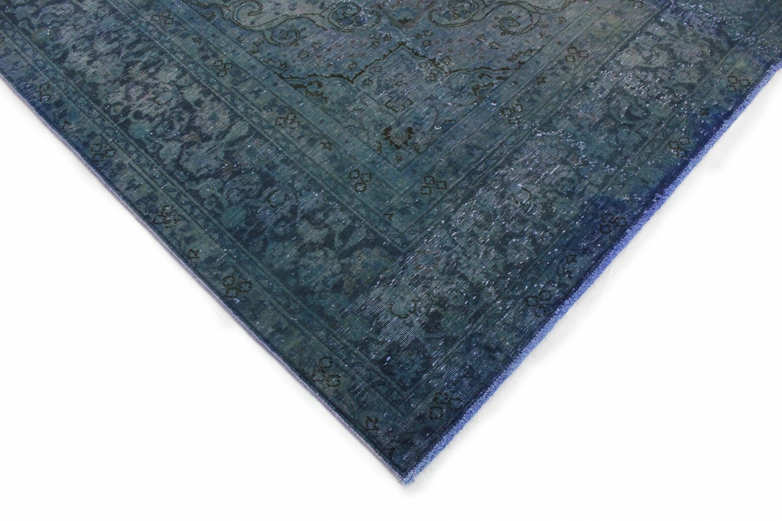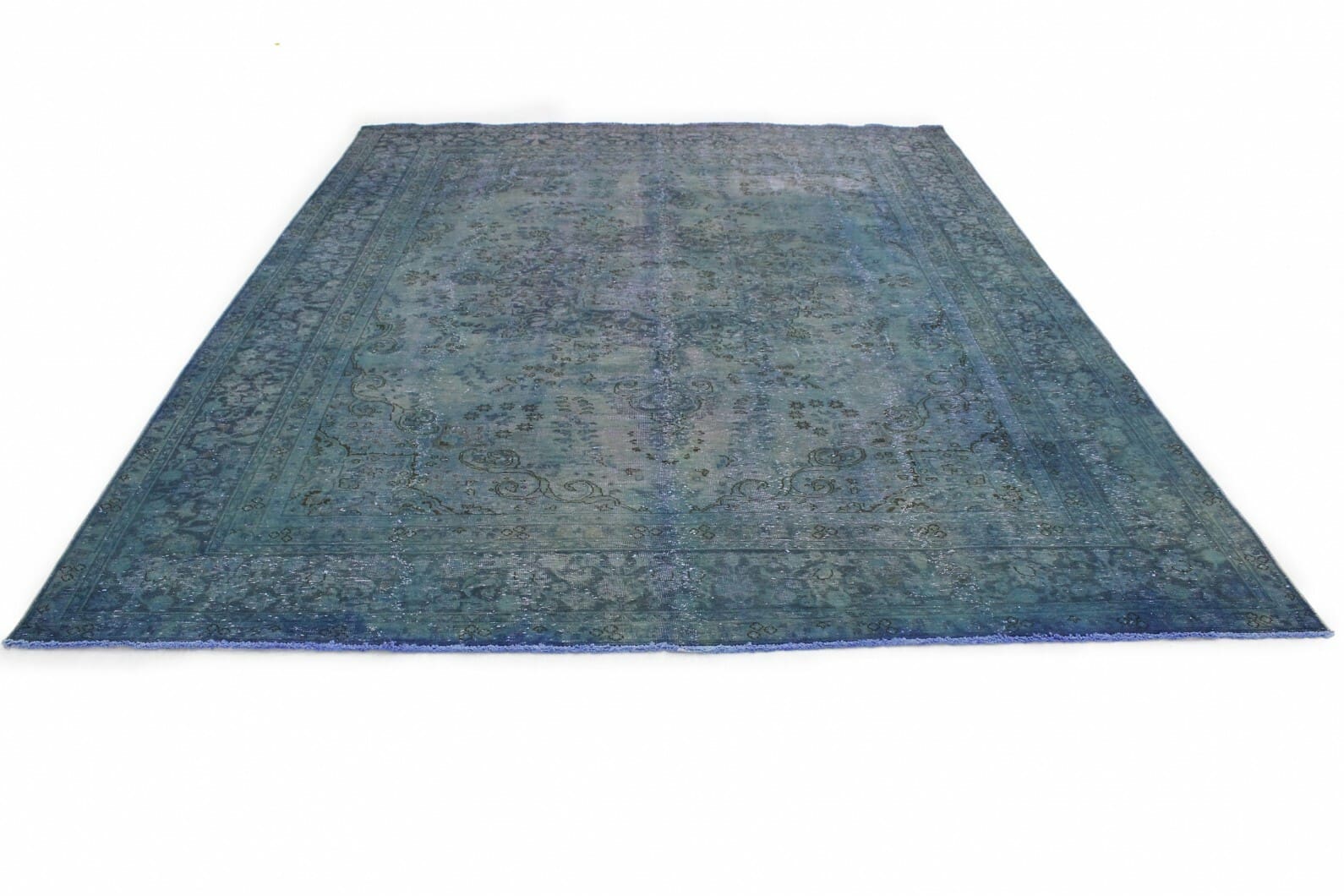 Vintage Teppich in Blau | Größe: 375×288 cm | Material: Handgesponnene Wolle | Zustand: Neu mit Etikett | Herkunft: Orient | Stil: Modern | Besonderheiten: Für Fußbodenheizung geeignet | Überfärbte Muster für einzigartige Optik | Ideal für helle Einrichtungen und große Räume