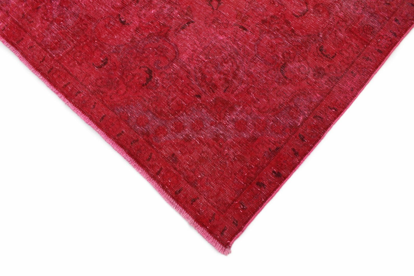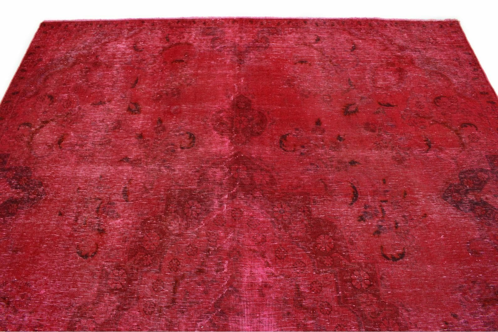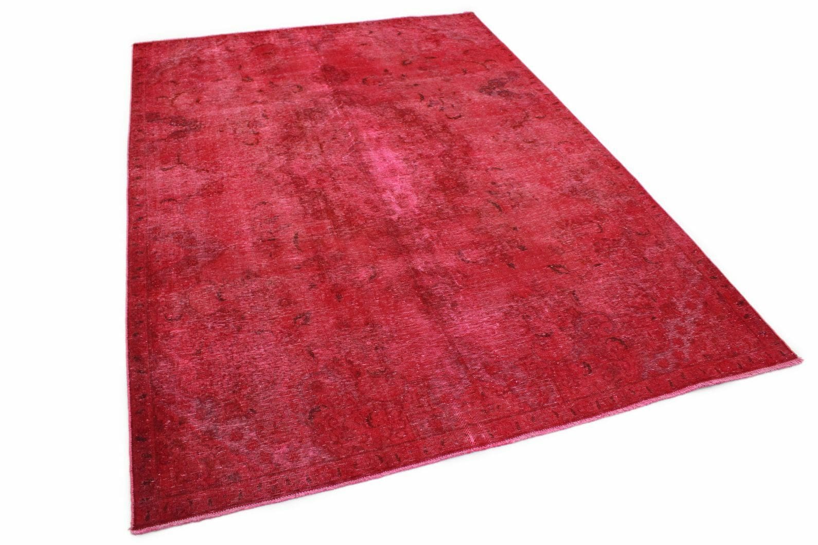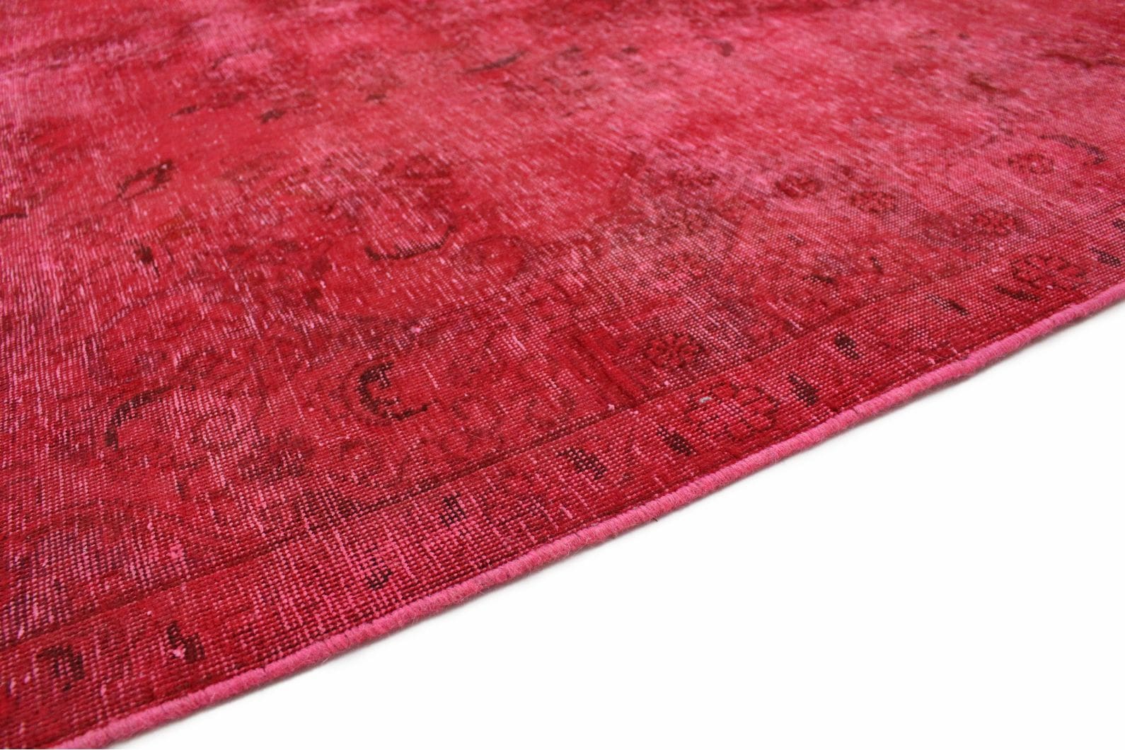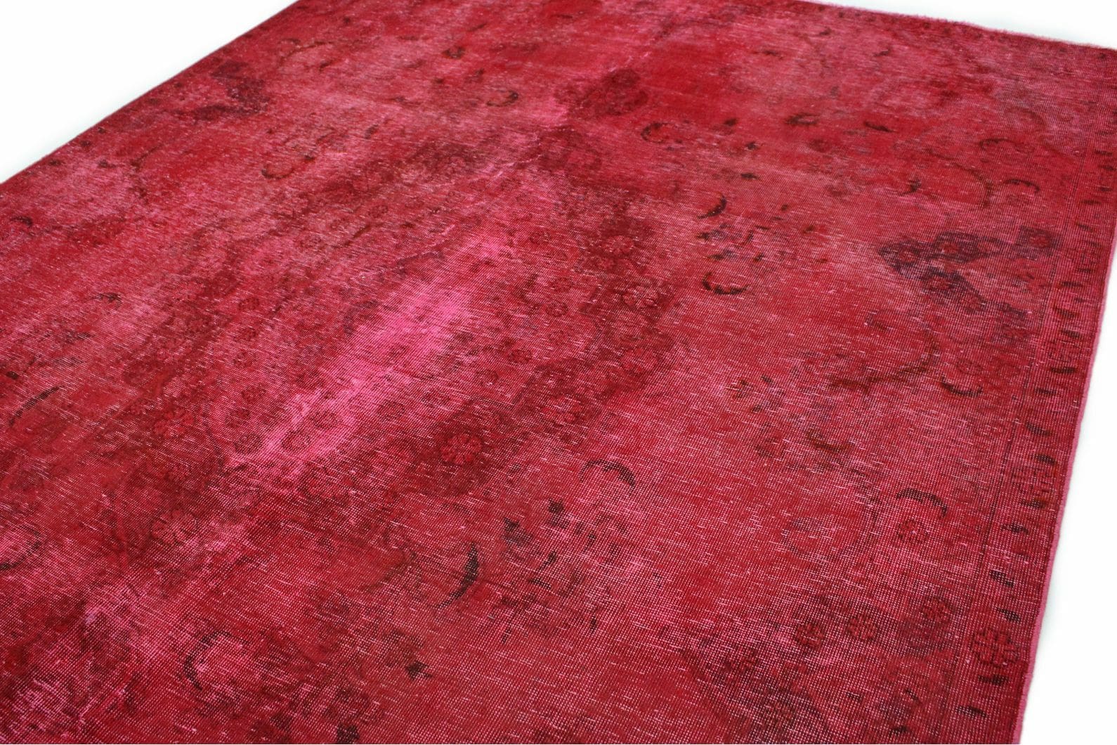 Handgearbeiteter Vintage-Teppich | Größe: 230×322 cm | Knotendichte: Individuell, handgeknüpft | Material: Handgesponnene Wolle und Baumwolle | Zustand: Neu mit Etikett | Herkunft: Orient | Stil: Modern mit antikem Charakter | Besonderheit: Für Fußbodenheizung geeignet | Farben: Rote Nuancen mit individueller Überfärbung