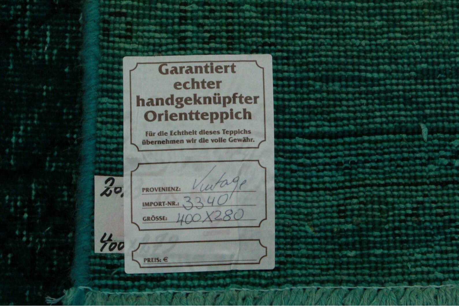 Vintage Orientteppich Türkis 402x279cm, handgeknüpft, 4×2,8m