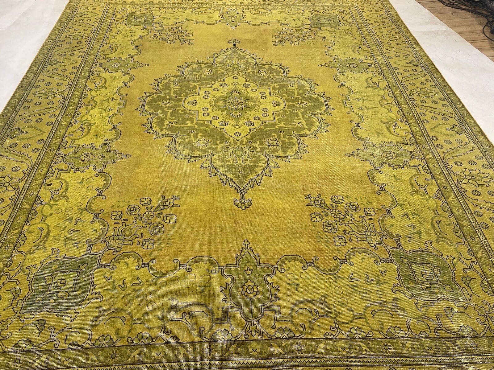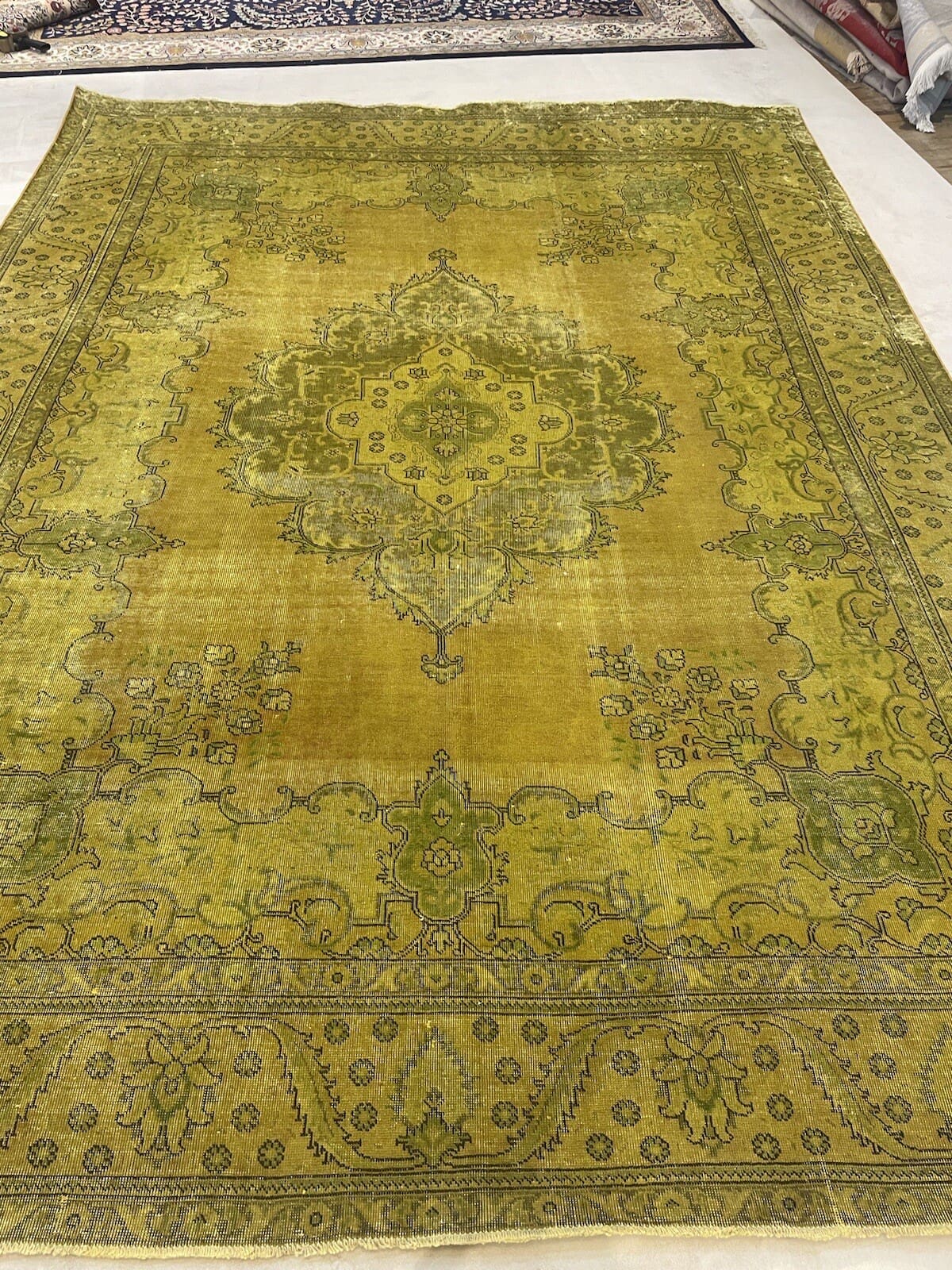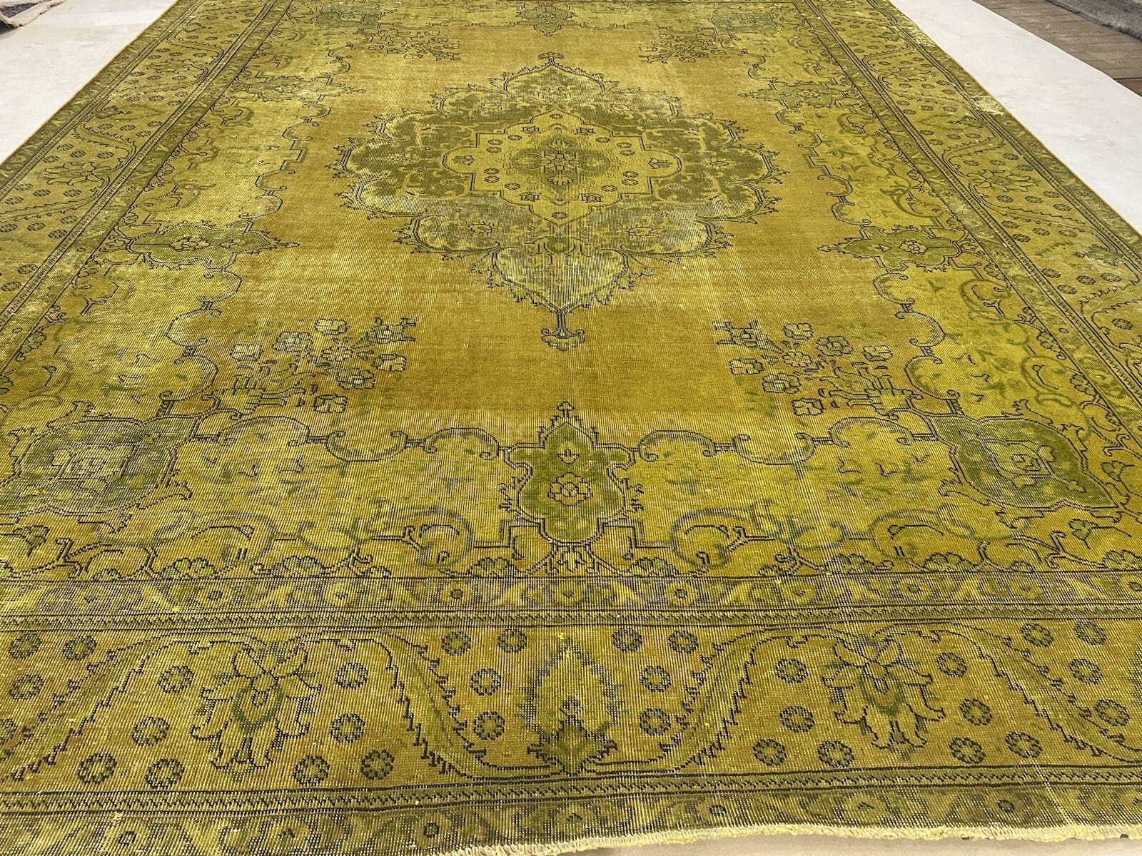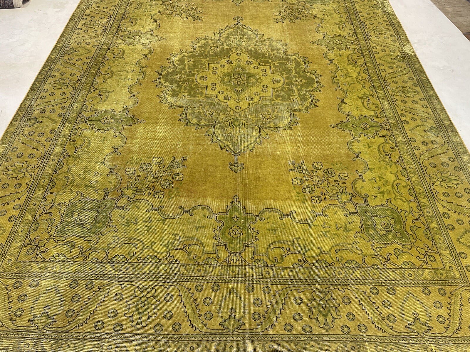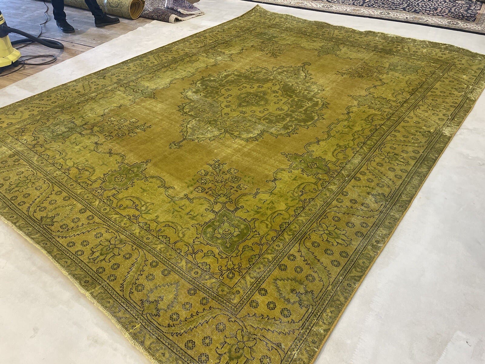 Vintage Original Perserteppich | Handgeknüpft aus hochwertiger handgesponnener Wolle | Knotendichte: Hochwertig | Größe: 389 x 295 cm | Farbe: Gelb-Gold-Senf | Alter: 20-50 Jahre | Für Fußbodenheizung geeignet | Kettfaden aus Baumwolle | Stil: Modern | Herkunft: Orient | Zustand: Neu mit Etikett