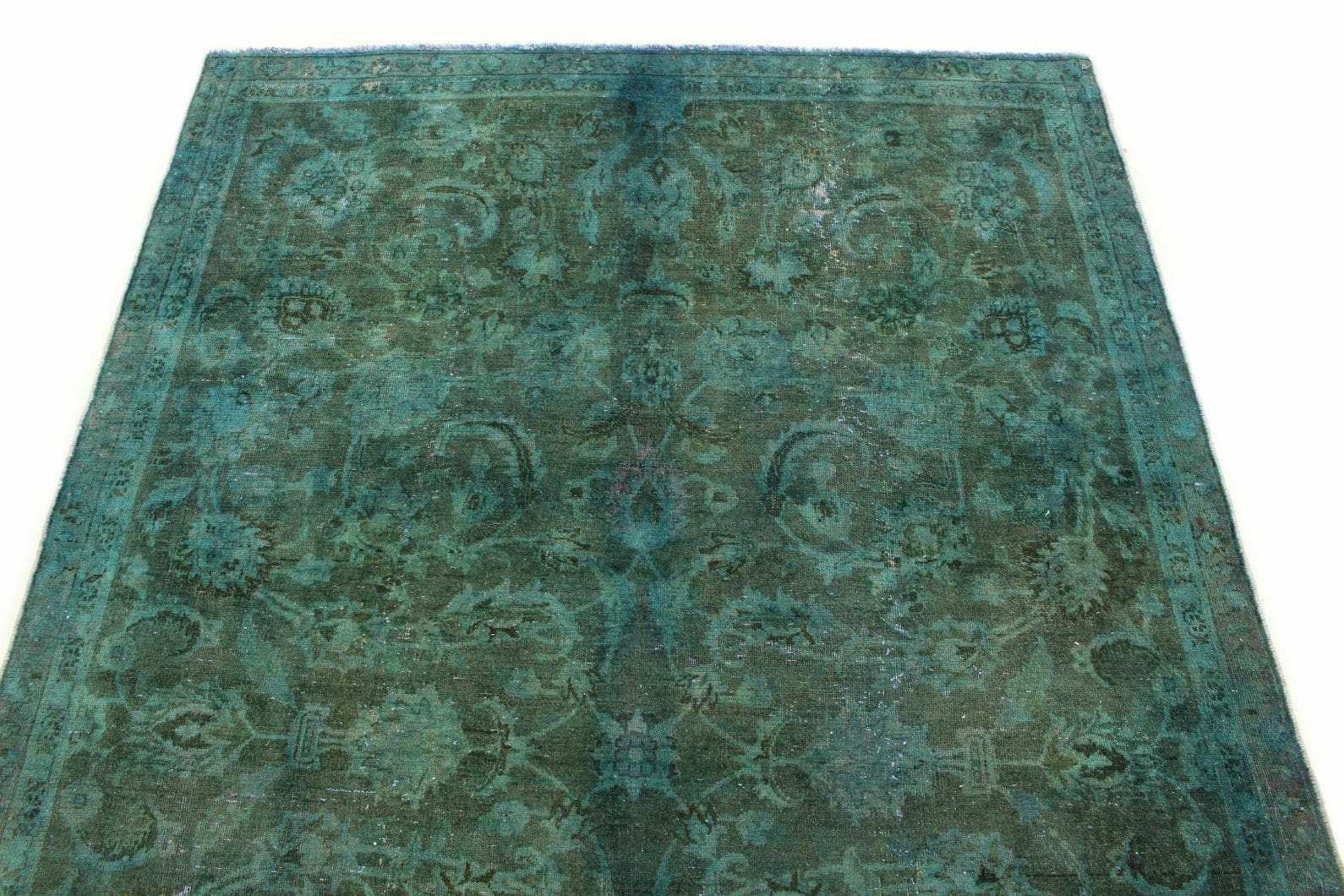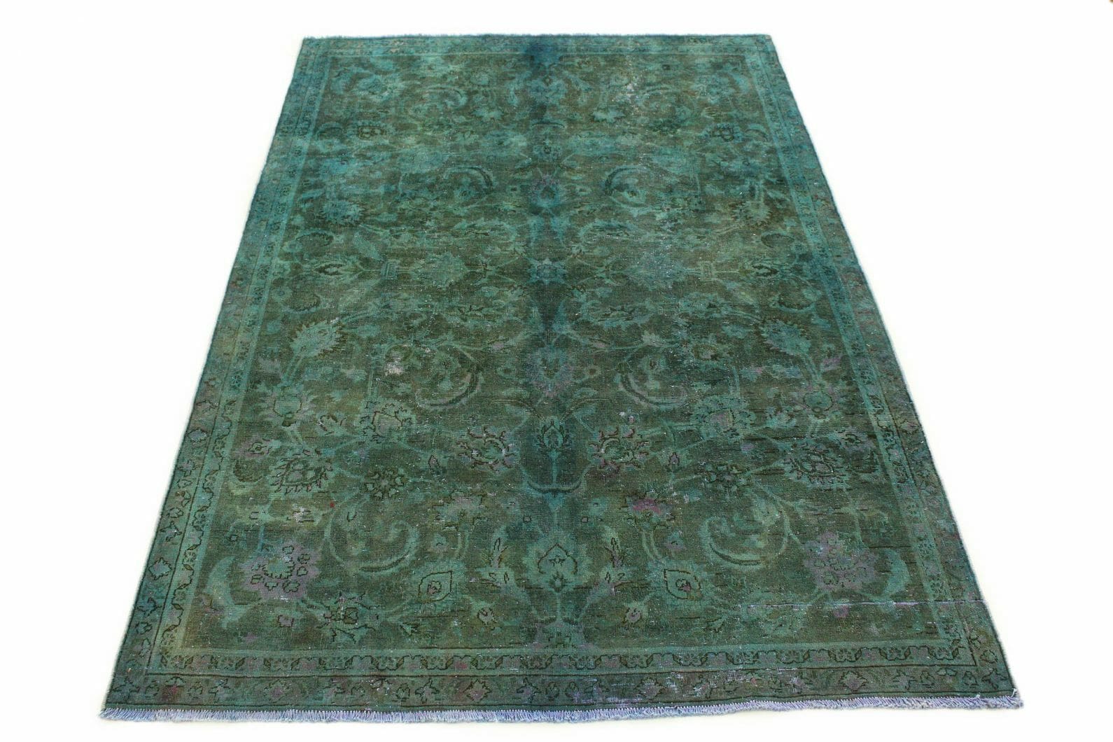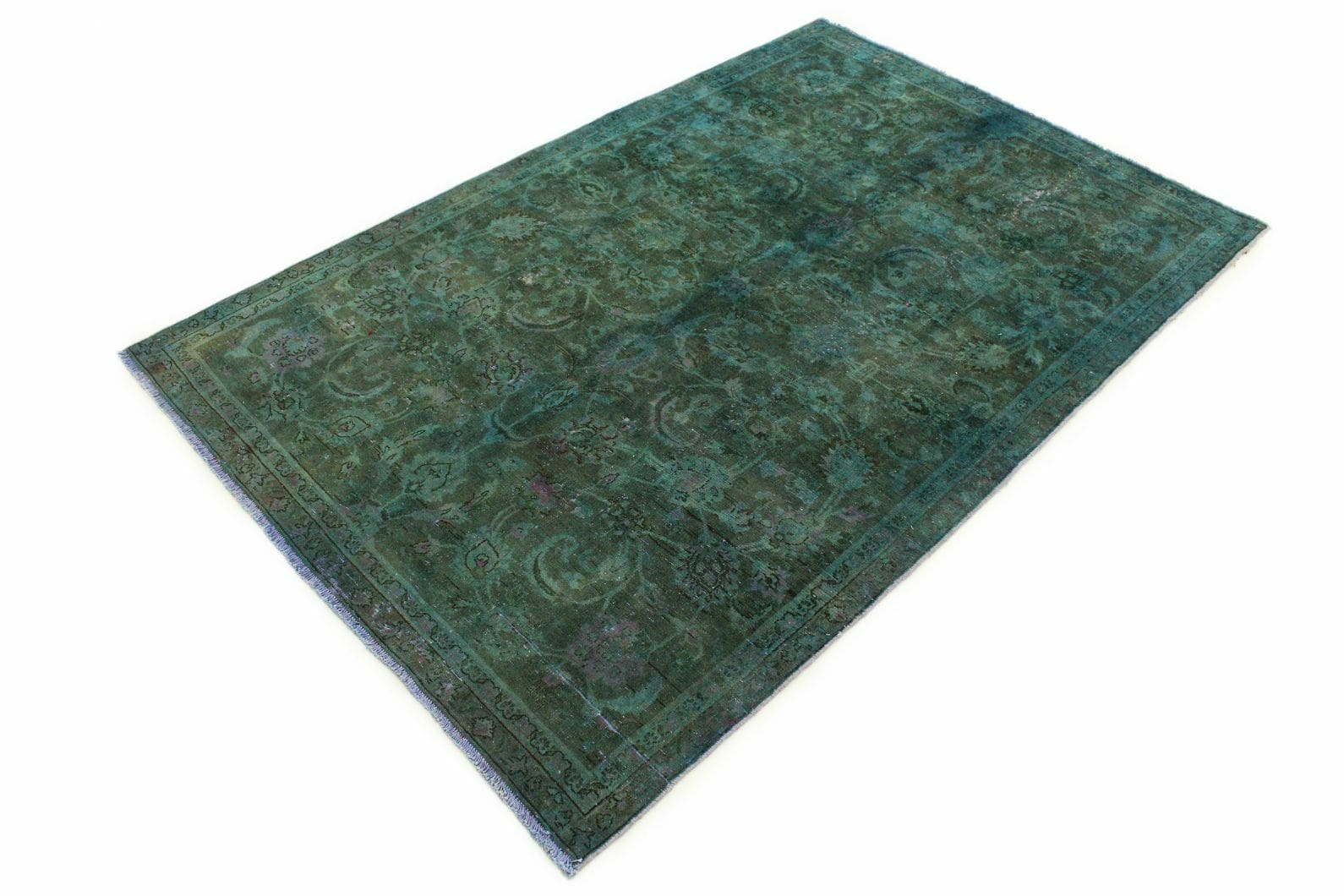 Handgeknüpfter Vintage-Teppich in Grün | Knotendichte: Hochwertige Verarbeitung | Material: Handgesponnene Wolle, Baumwollkettfaden | Größe: 242×162 cm | Zustand: Neu mit Etikett | Herkunft: Orient | Stil: Modern, Vintage | Geeignet für Fußbodenheizung | Einzigartiges Design mit überfärbten Mustern