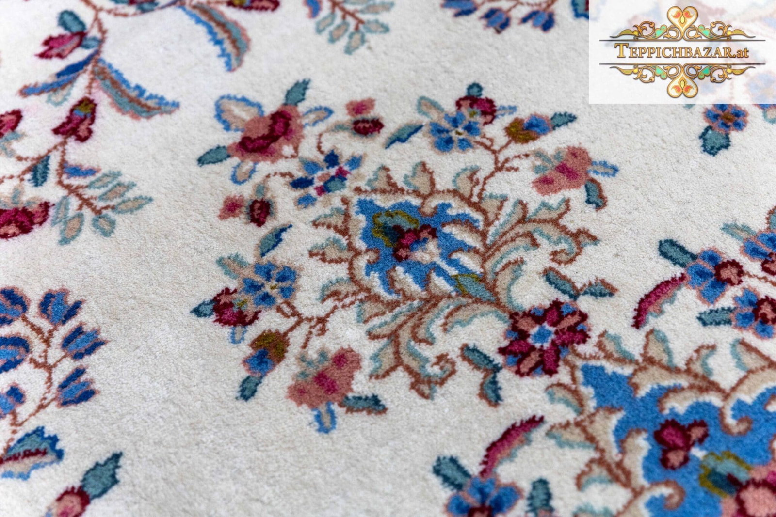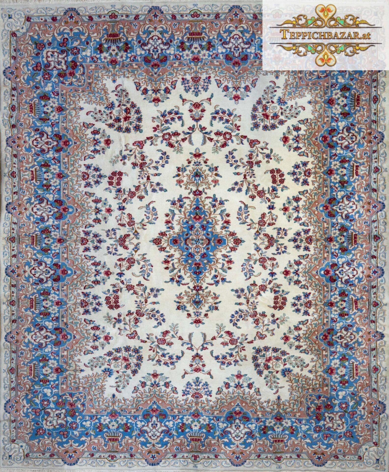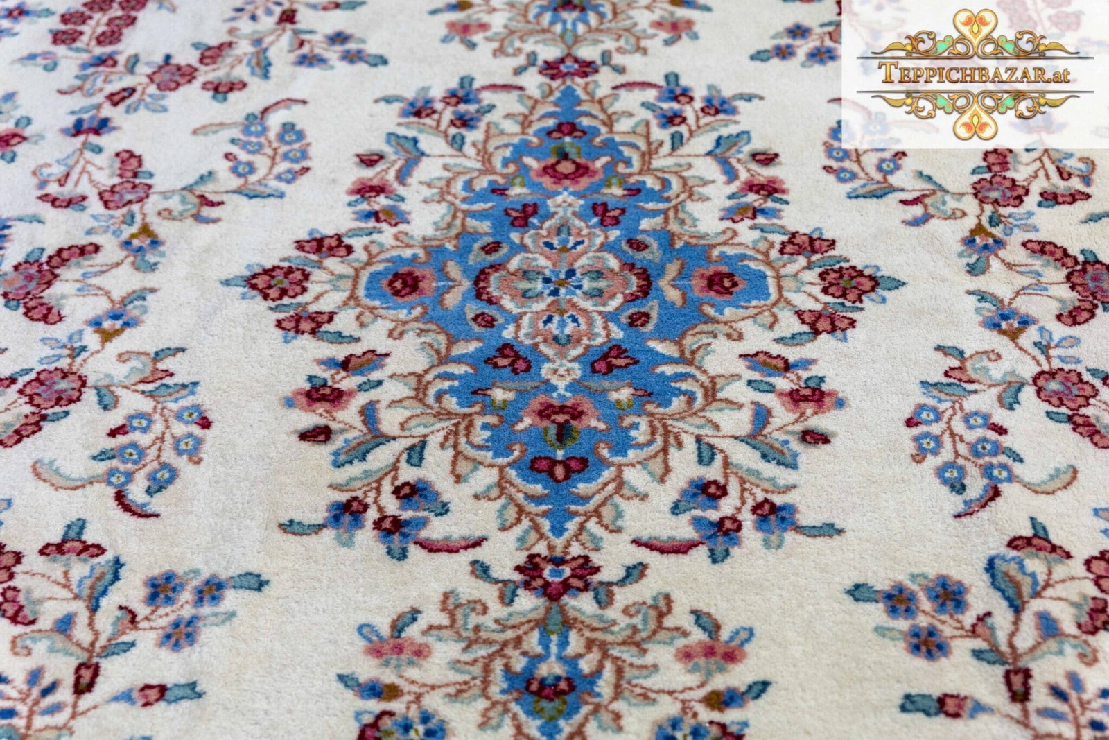 Einzigartige Farbkombination | Unikat | Exquisiter Kirman/Kerman Perserteppich | 100% HANDGEKNÜPFT | Größe: 300×245 cm | Knotendichte: 250.000 Knoten/m² | Farben: Beige/Blau | Zustand: Sehr gut | Behandlung: Professionelle Handwäsche & Mottenschutz |