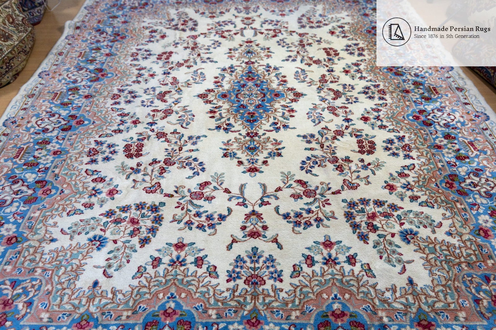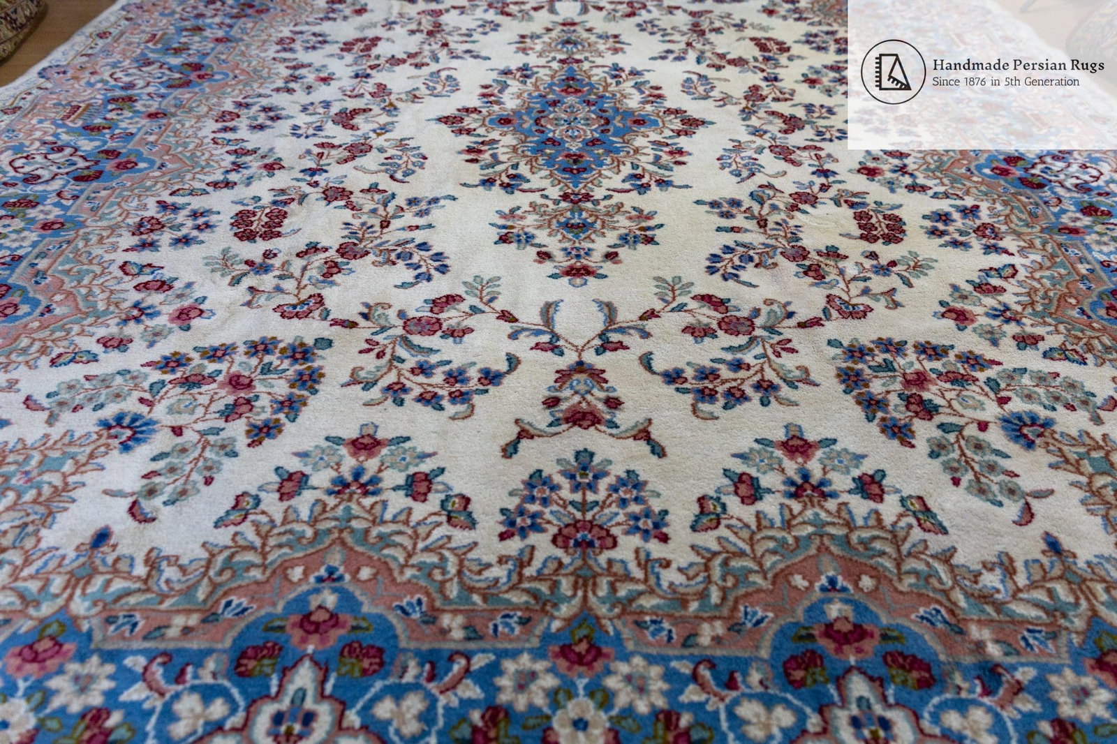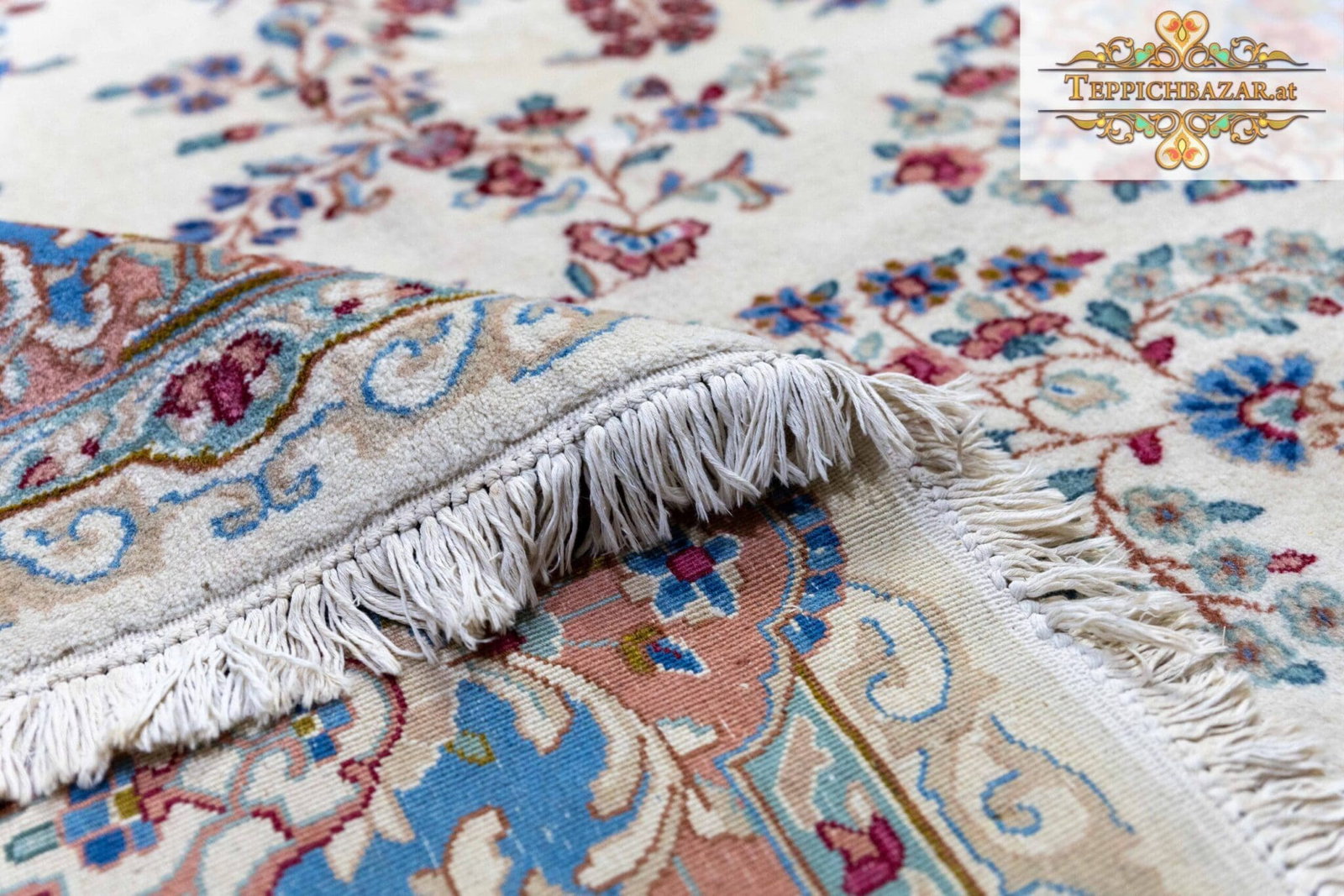 Einzigartige Farbkombination | Unikat | Exquisiter Kirman/Kerman Perserteppich | 100% HANDGEKNÜPFT | Größe: 300×245 cm | Knotendichte: 250.000 Knoten/m² | Farben: Beige/Blau | Zustand: Sehr gut | Behandlung: Professionelle Handwäsche & Mottenschutz |