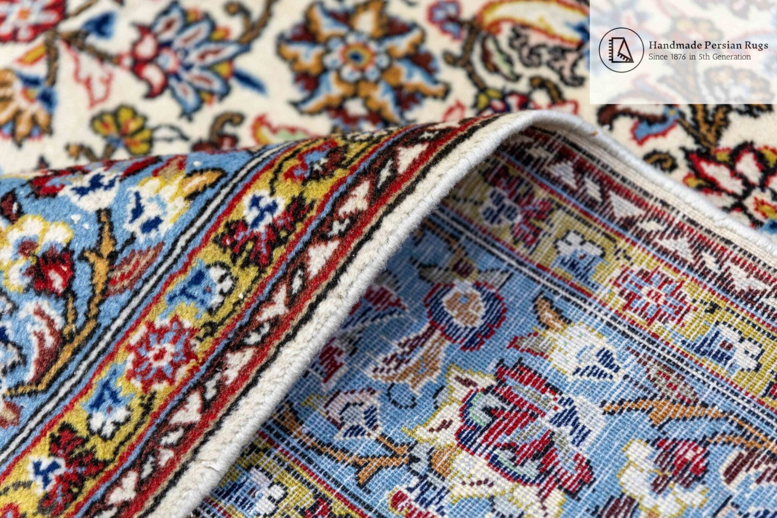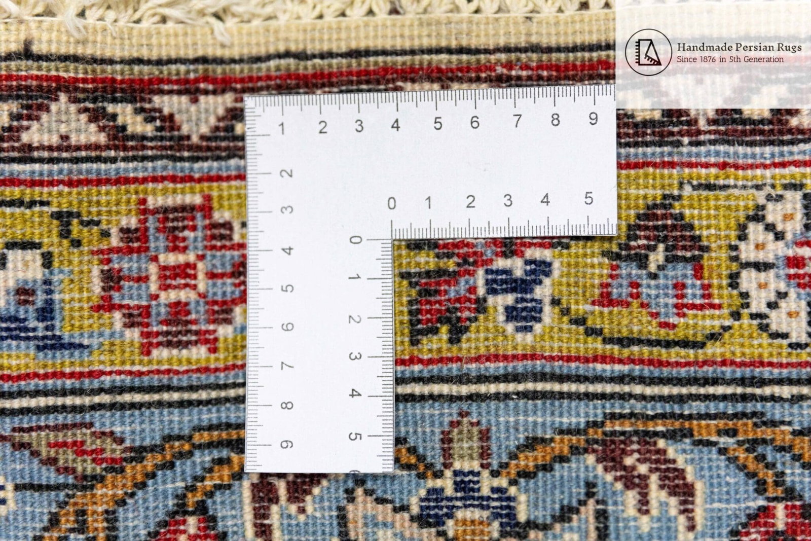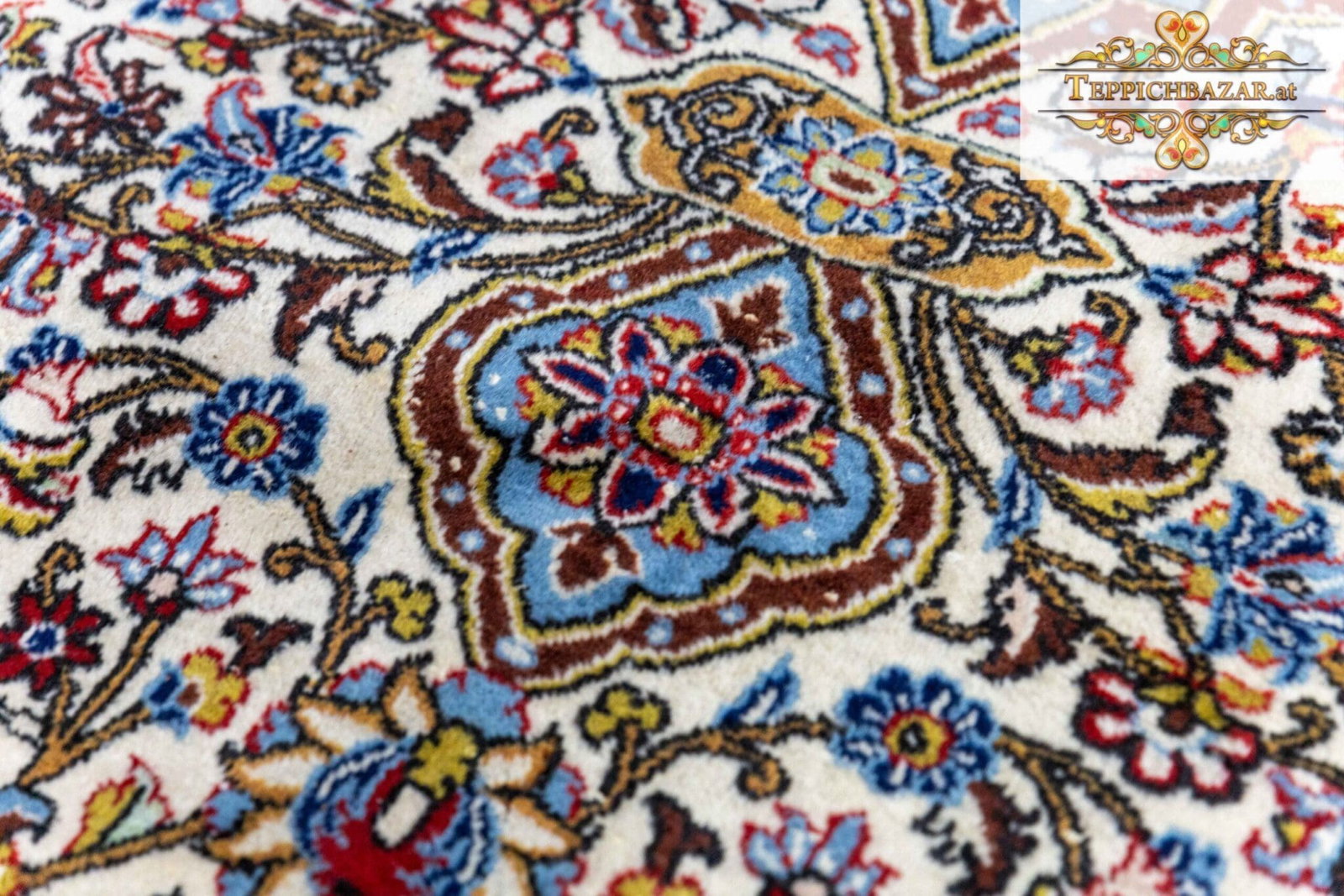 Der Kashan Perserteppich ist aus hochwertiger Wolle gefertigt, die für ihre Strapazierfähigkeit und Weichheit bekannt ist. Die Verwendung von Wolle als Material sorgt nicht nur für eine angenehme Haptik, sondern macht den Teppich auch beständig gegen Abnutzung und Verschmutzung. Die Knotendichte ist ein entscheidendes Merkmal bei Perserteppichen und steht hier in direktem Zusammenhang mit der Qualität: Mit einer hohen Knotendichte bietet der Teppich nicht nur ein eindrucksvolles, detailreiches Design, sondern auch eine hervorragende Langlebigkeit. Jeder Knoten wurde mit Präzision und Geduld von erfahrenen Kunsthandwerkern geknüpft, was jedem Teppich eine individuelle Note verleiht.