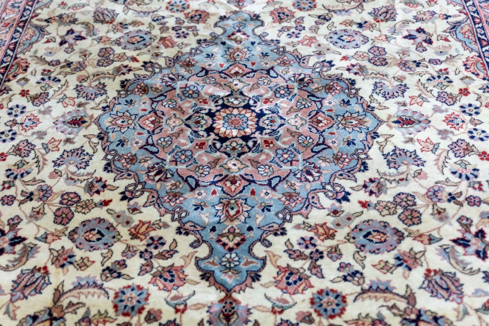 Der Sarough Farahan Teppich wird aus feinstem Schurwolle gefertigt, die für ihre Weichheit und Robustheit bekannt ist. Wolle ist nicht nur angenehm fußwarm, sondern bietet auch eine natürliche Isolation, die den Teppich besonders strapazierfähig macht. Durch die handgeknüpfte Technik, die in der Region Sarough verwurzelt ist, erhält jeder Teppich seine Einzigartigkeit. Die Knotendichte sorgt zudem für ein detailliertes Muster, welches die floralen Designs hervortreten lässt und die Langlebigkeit des Teppichs garantiert.