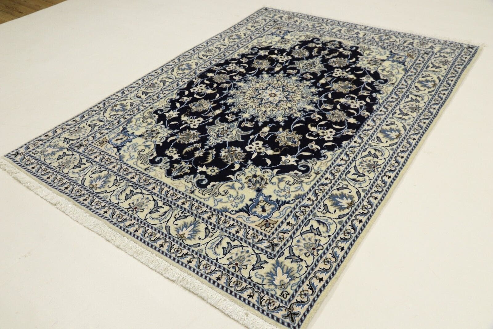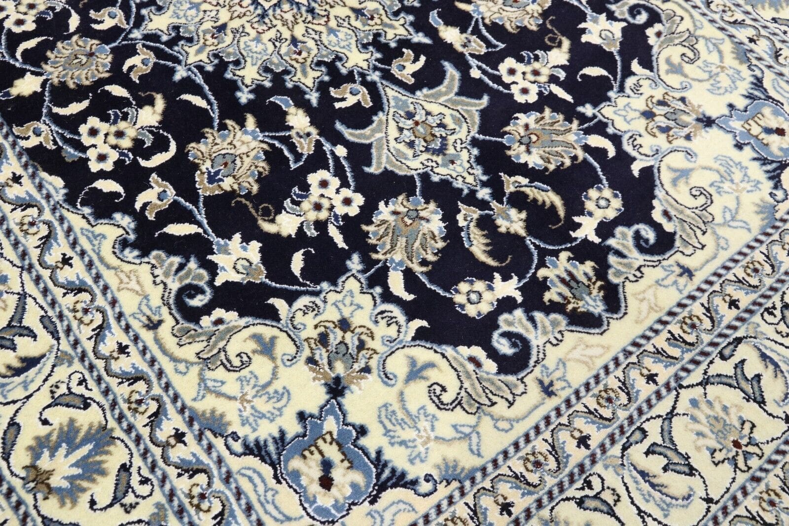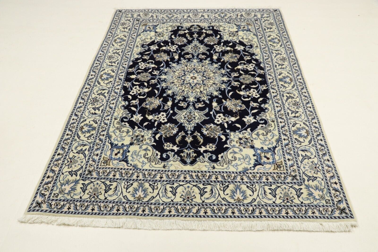 Orientteppich super Nain | Größe: 200 x 145 cm | Knotendichte: ca. 300.000 Knoten/m² | Material: 90 % Schurwolle, 10 % Seide | Kette: 100 % Baumwolle | Zustand: Neu, sehr gut | Herkunft: Persien | Dicke: ca. 8 mm | Stil: Traditionell Orientalisch/Persisch | Besonderheiten: Für Fußbodenheizung geeignet, haustierfreundlich | Form: Rechteckig